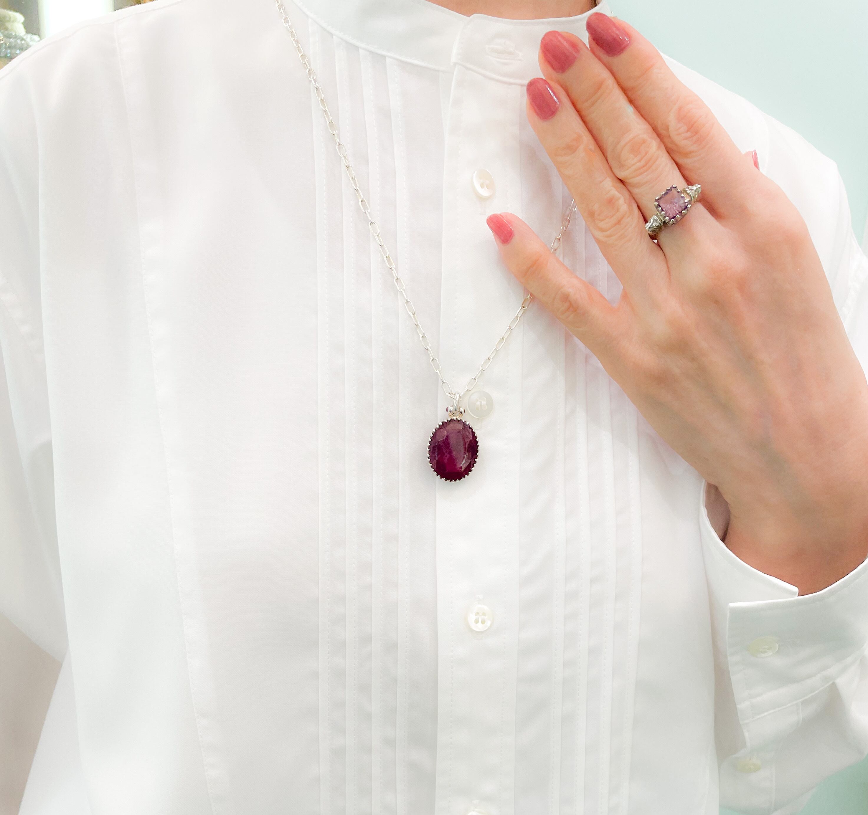 お宝感のある大粒のルビーを使っていながらも、シルバーで仕上げているので、カジュアルに付けられる仕上がりです。