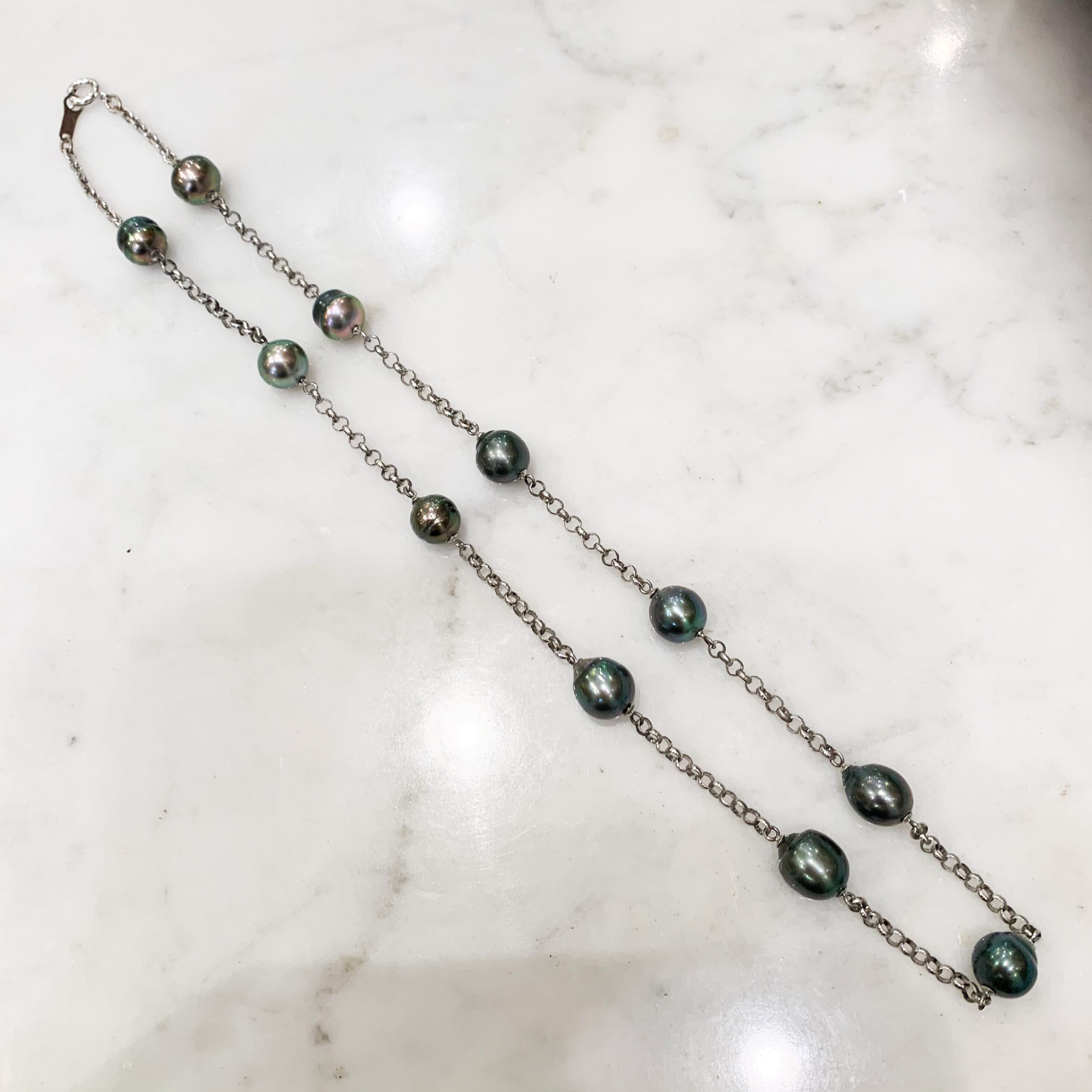 南洋黒バロックパールとシルバーチェーンのステーションネックレス