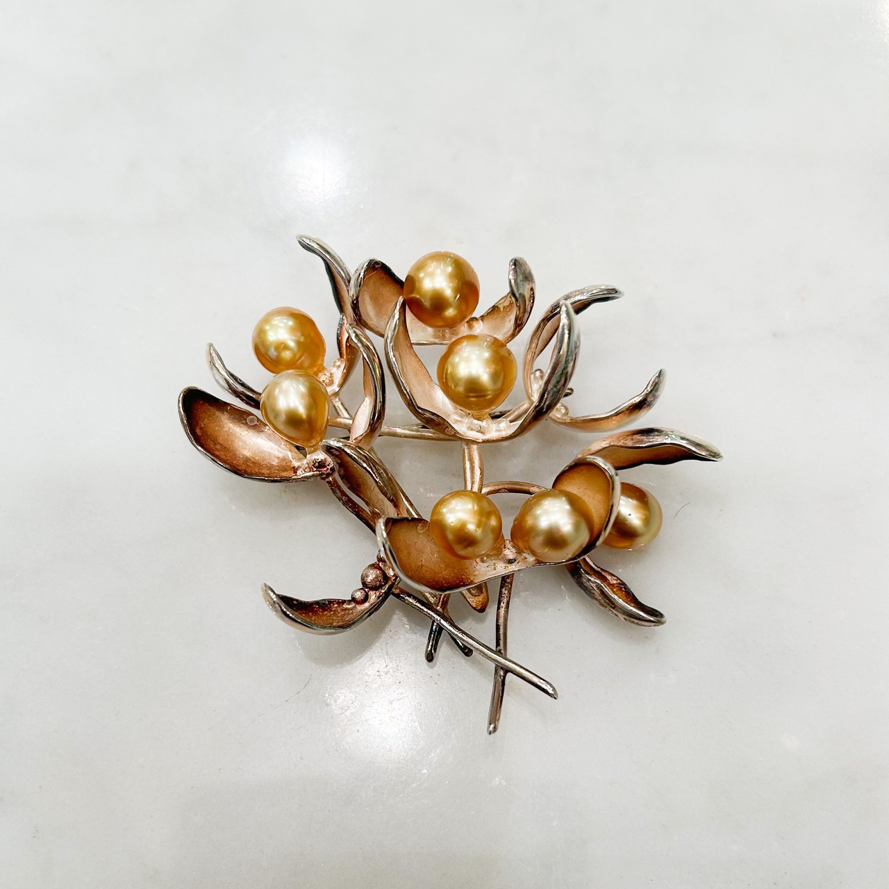 シルバーと南洋ゴールドバロックパールのヤドリギのブローチ