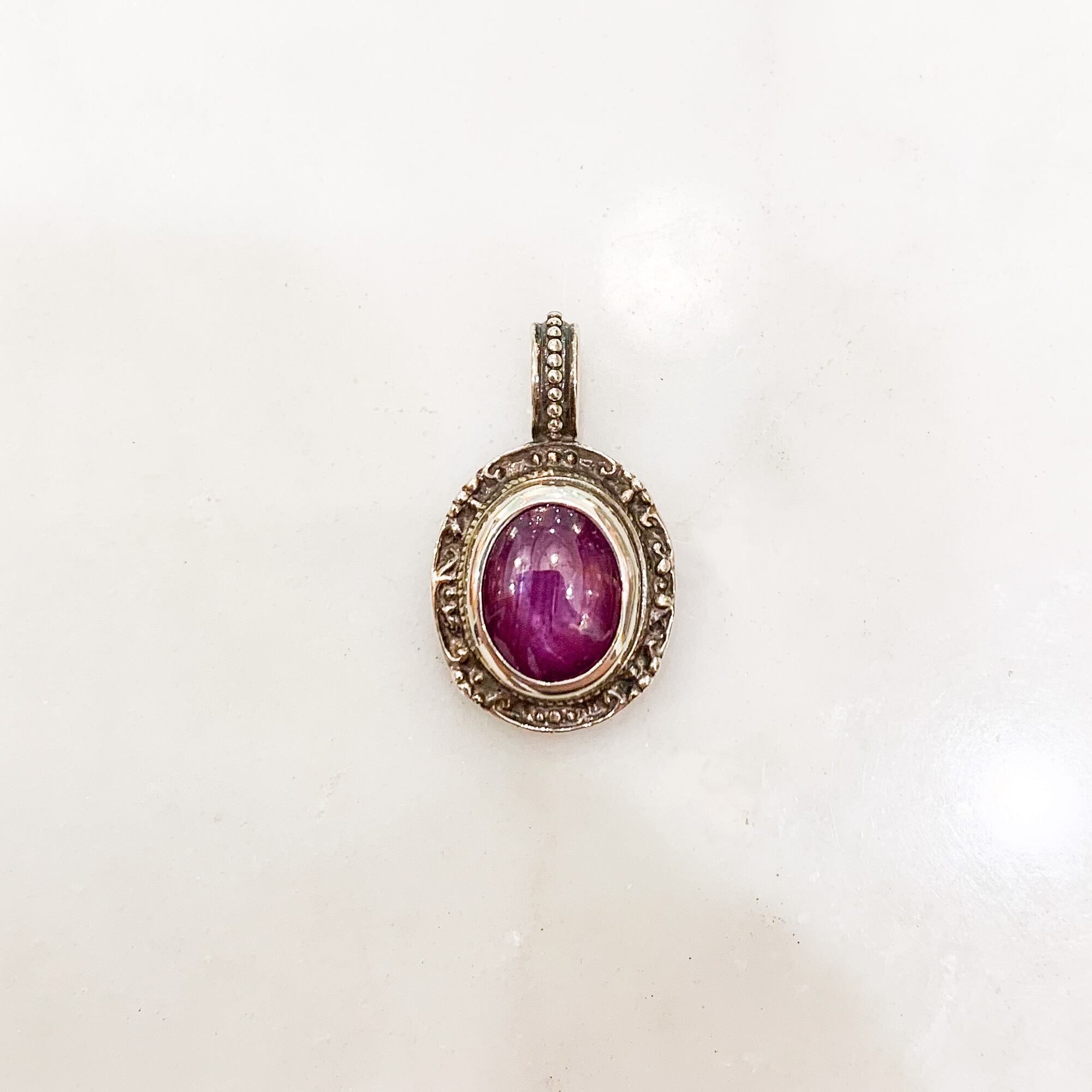 このペンダントのインドスタールビーはそんなに強くスターは出ないのですが、暗い場所で一方向からの強い光に当たると、やっぱりスタールビーなんだなと思わせる光をうかべます。
