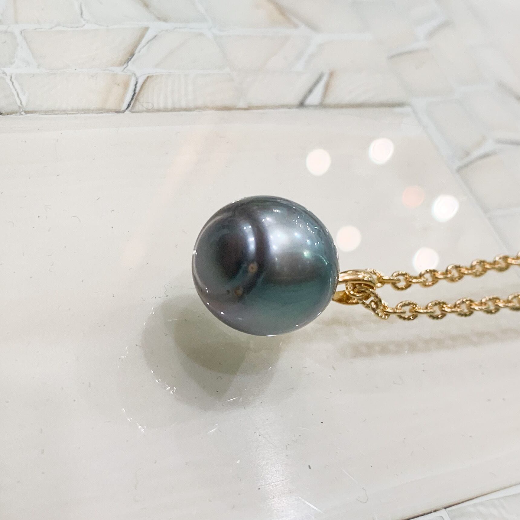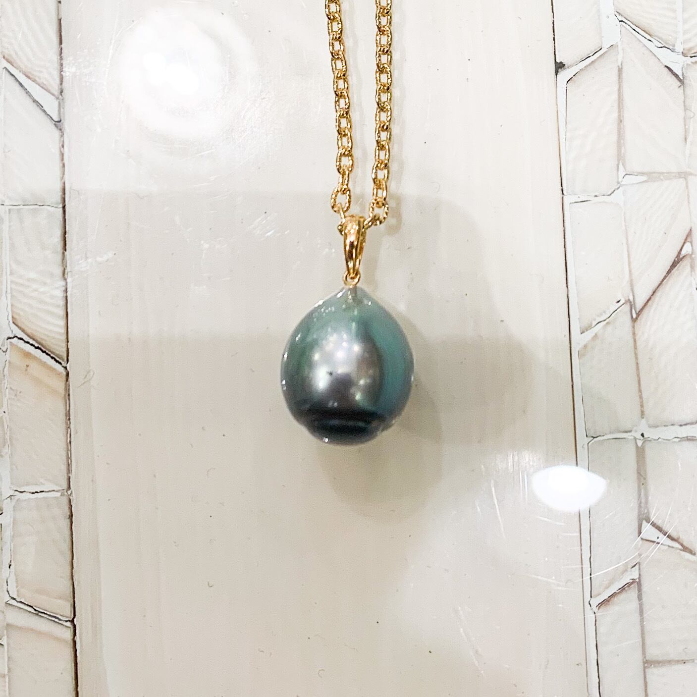 明るめのグレーの中に、ピンクやグリーンの輝きが混じる、しずく型の念用グレーパールです。