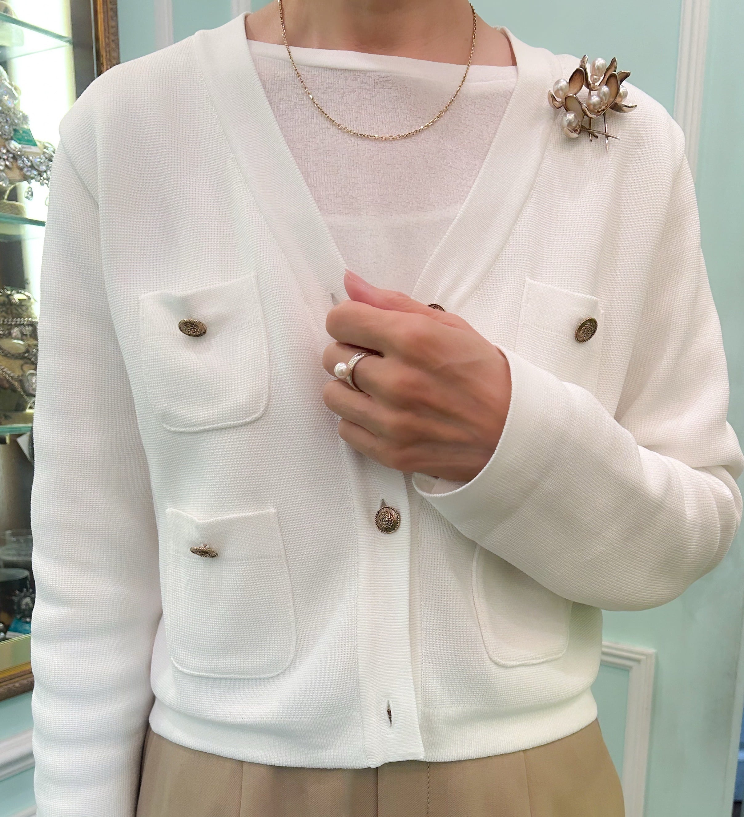 硬質な金属的なシルバーの輝きと、南洋真珠のやわらかな輝きのコントラストがとてもきれいです。