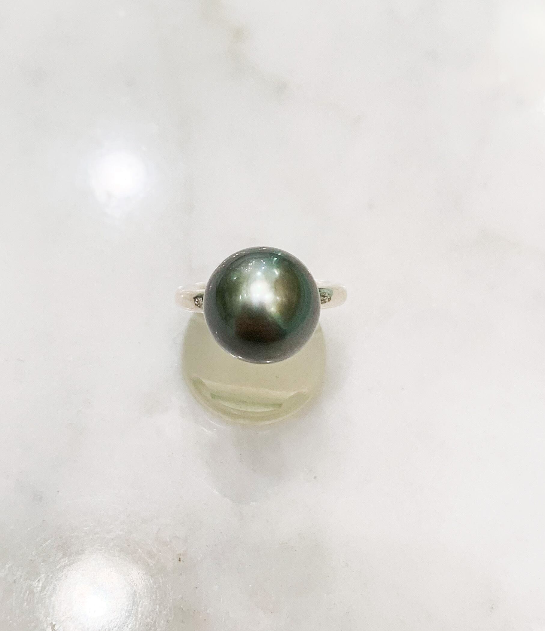 コロっと指の上にアンバランスに載る濃いグレーの大粒南洋真珠は、余計な色の入らないモノトーンの組み合わせなので、様々な色の装いに合わせて楽しめます。