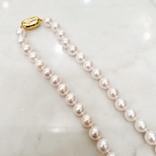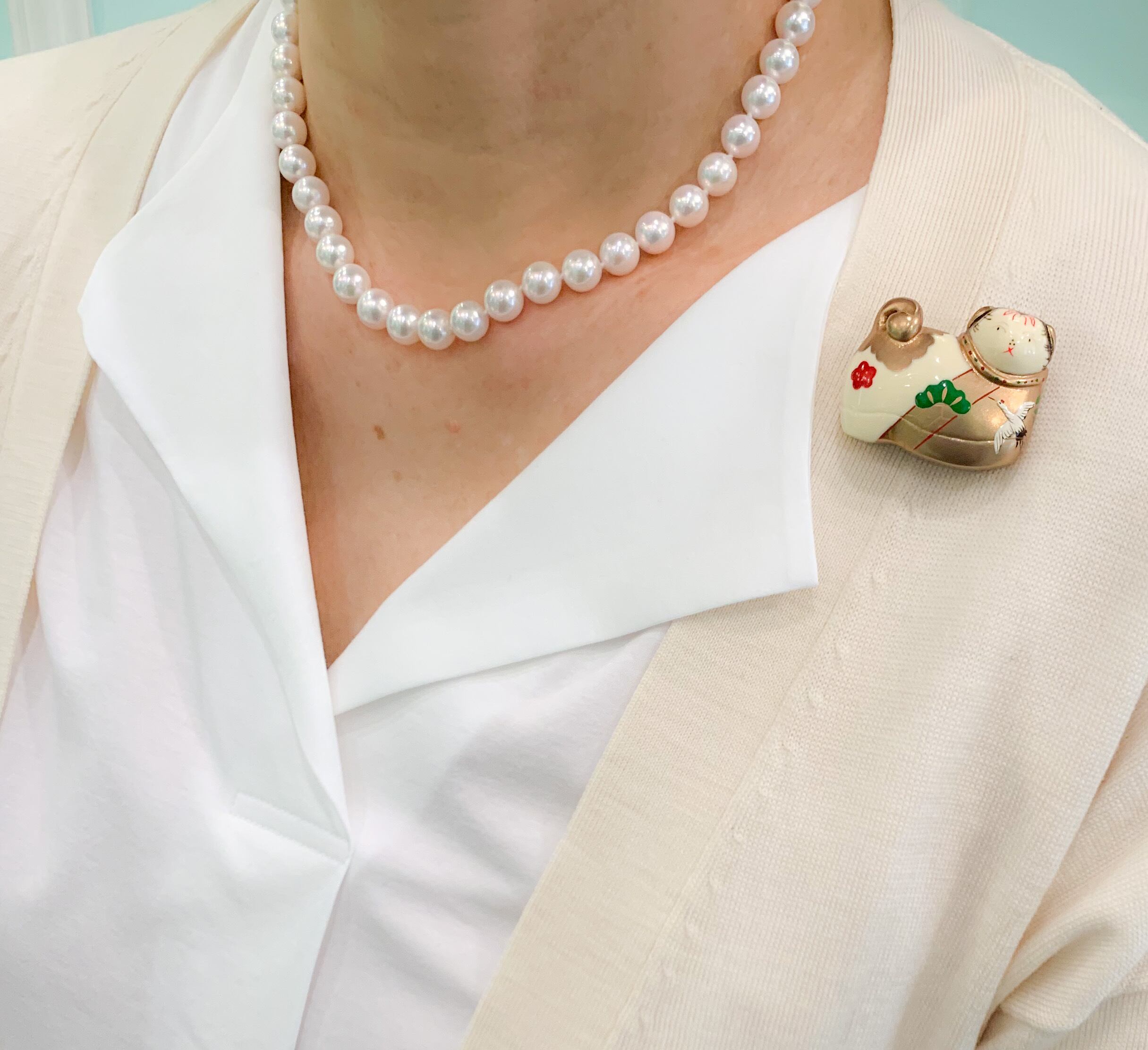 もちろん真珠と真珠の間には全て結び目を入れて繋いでいますので、滑らかに首や肩の凹凸に沿って付けることができます。
