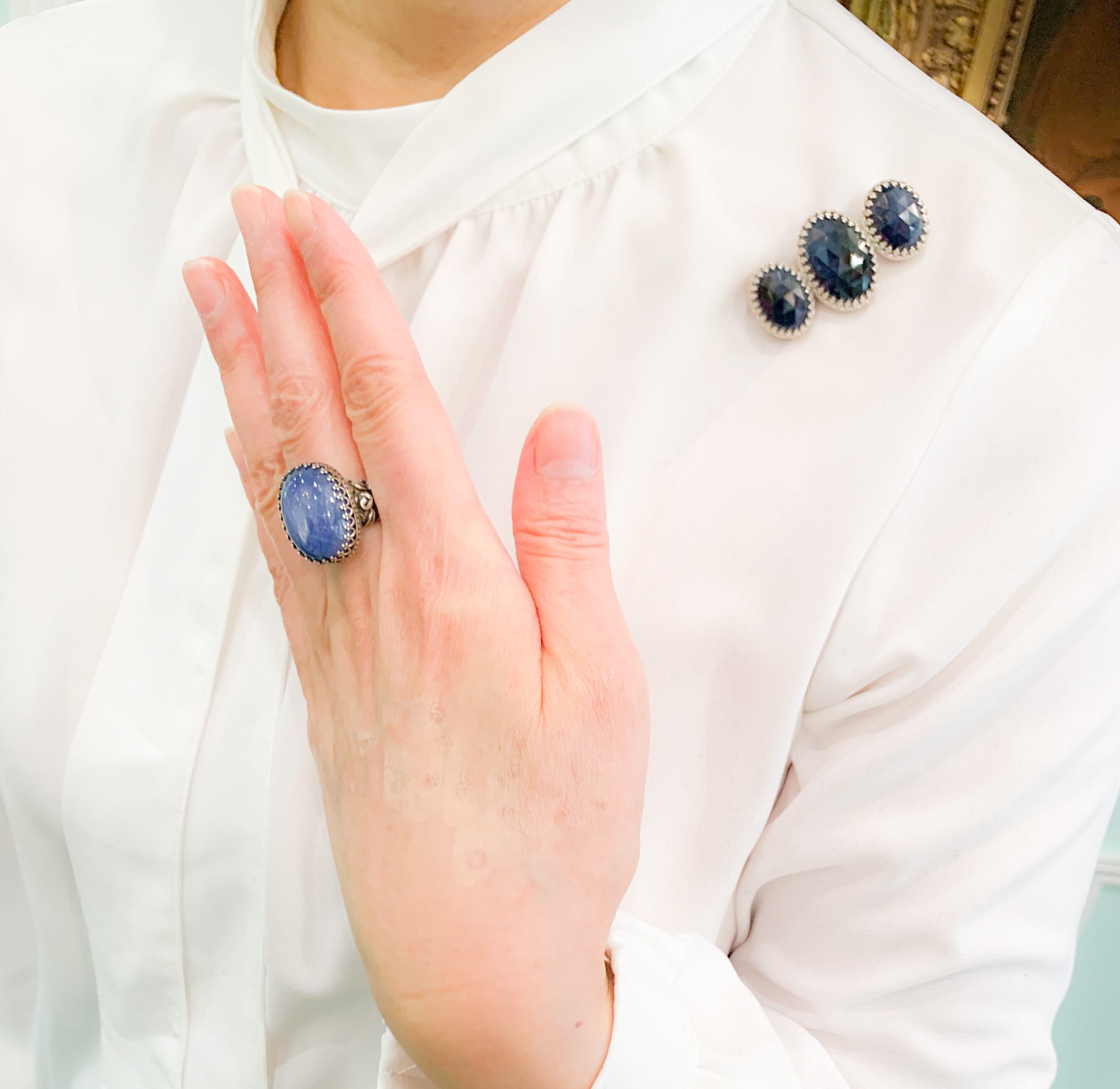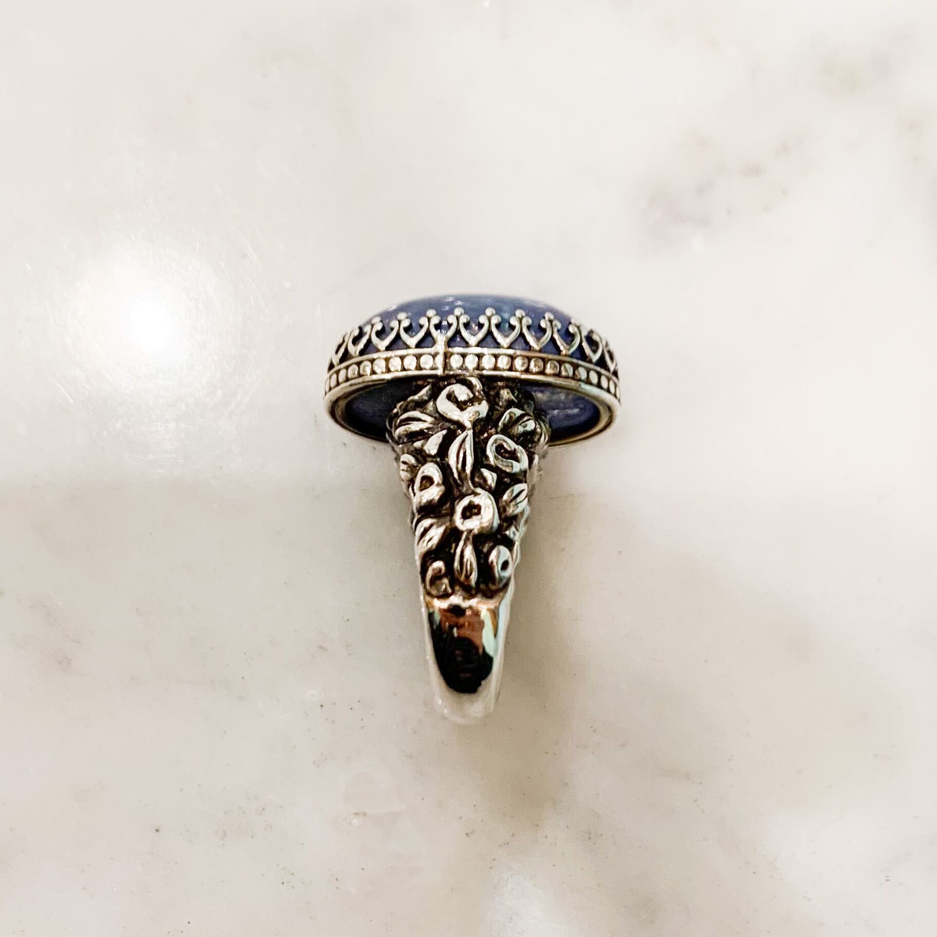 青の中に白が混じり合う、やわらかなトーンの楕円形でふっくらとした形のサファイアを王冠留めにして、花の模様を深彫りにしたシルバー台にセッティングした、ボリュームはあるけど品のある、アンティークの様な楽しさの指輪です。