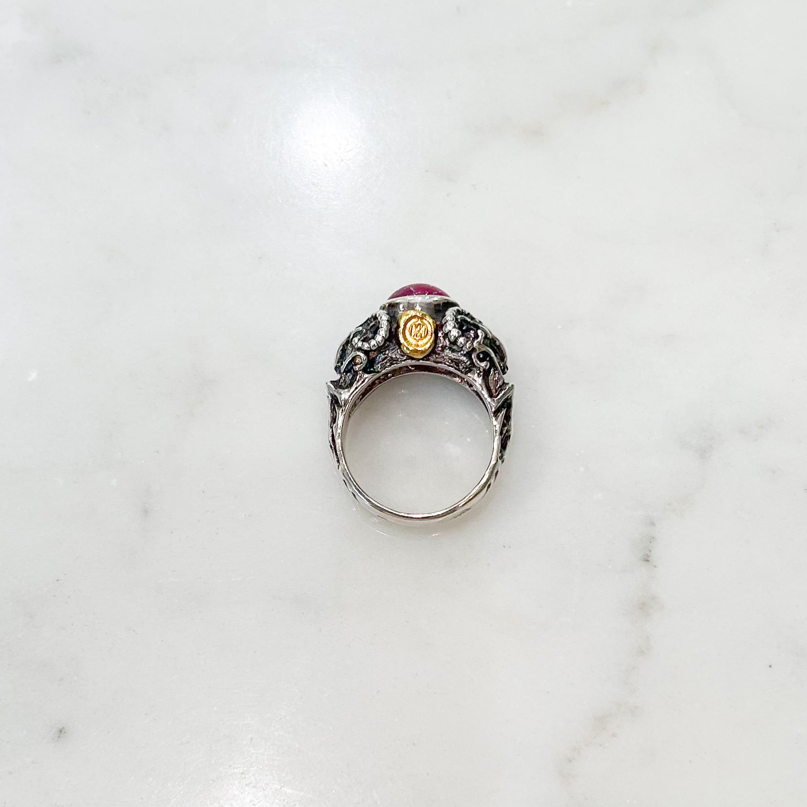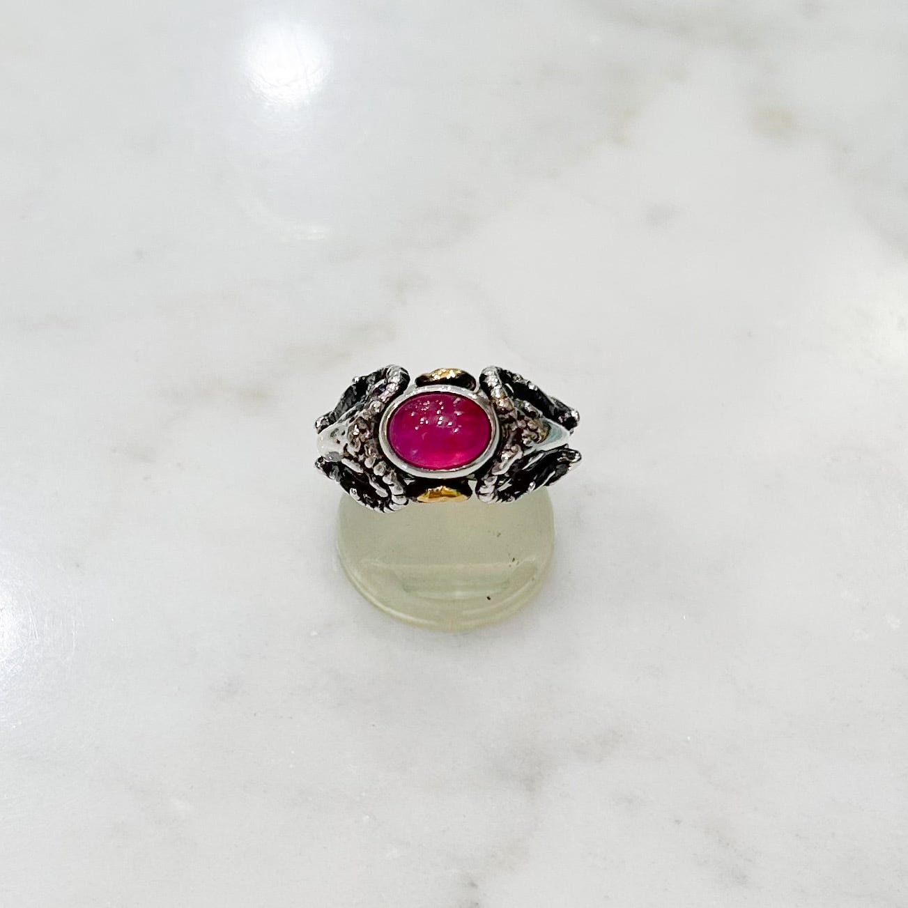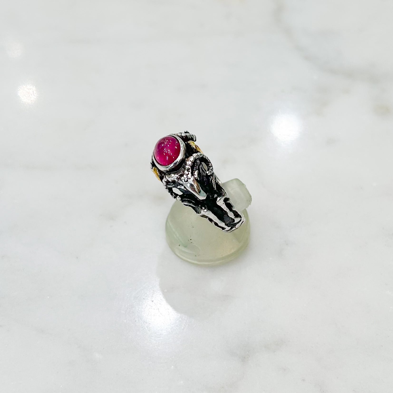 楕円形のルビーをシルバーで覆輪をして、山羊の台にセッティング。
