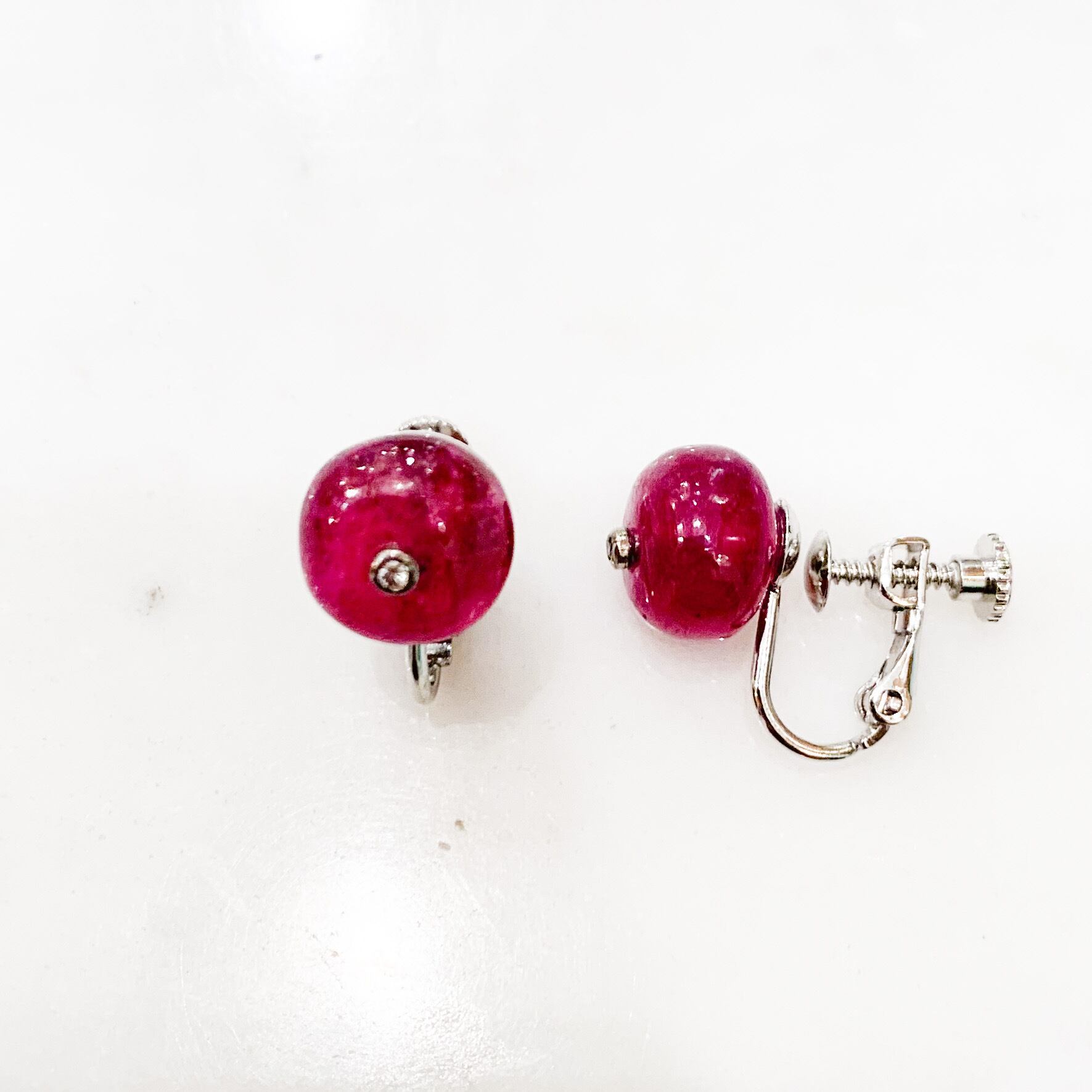 ルビーのイヤリングというと、華やかなイメージがあるのですが、丸い石ころのような綺麗すぎない形と、綺麗すぎない味のある色のルビーなので、強すぎないイメージで気軽に楽しく使えるイヤリングです。