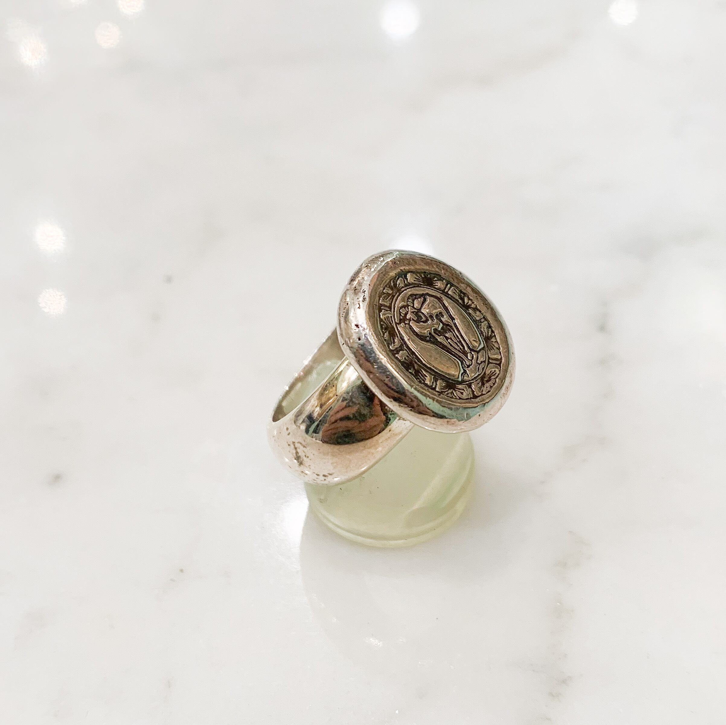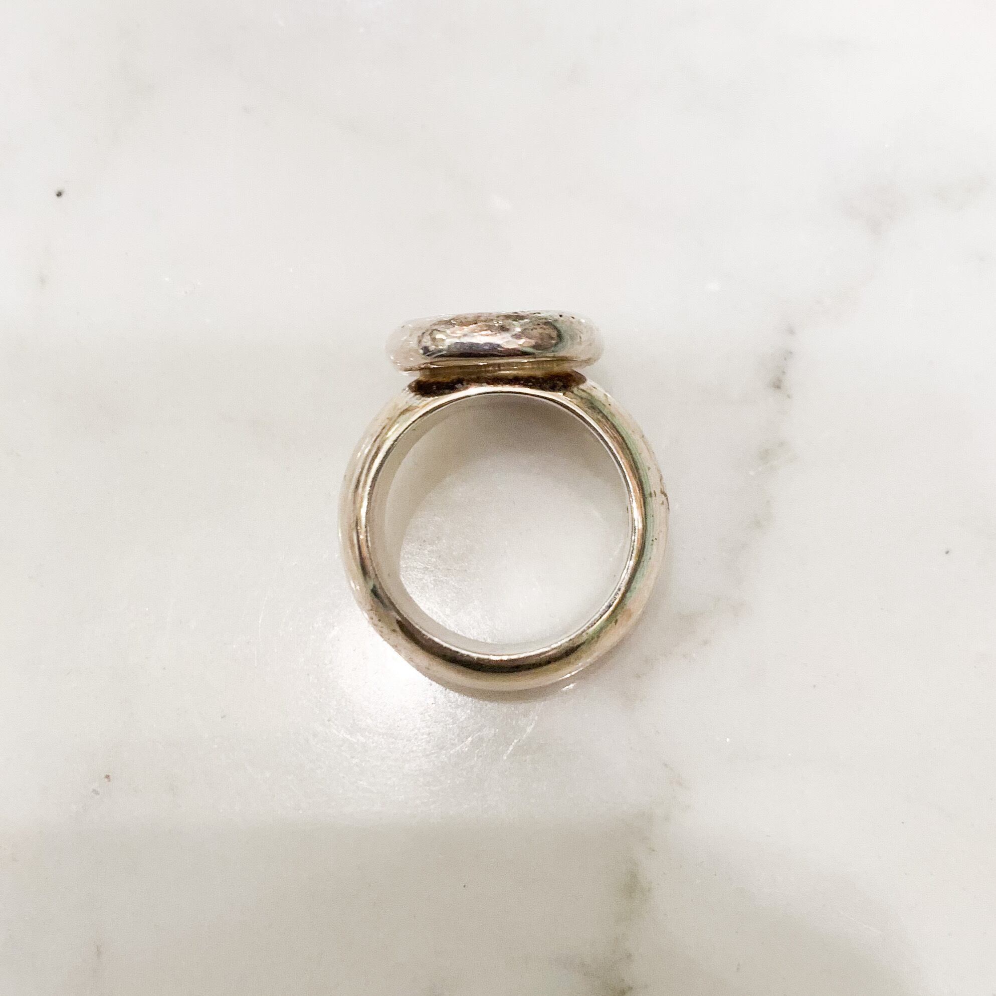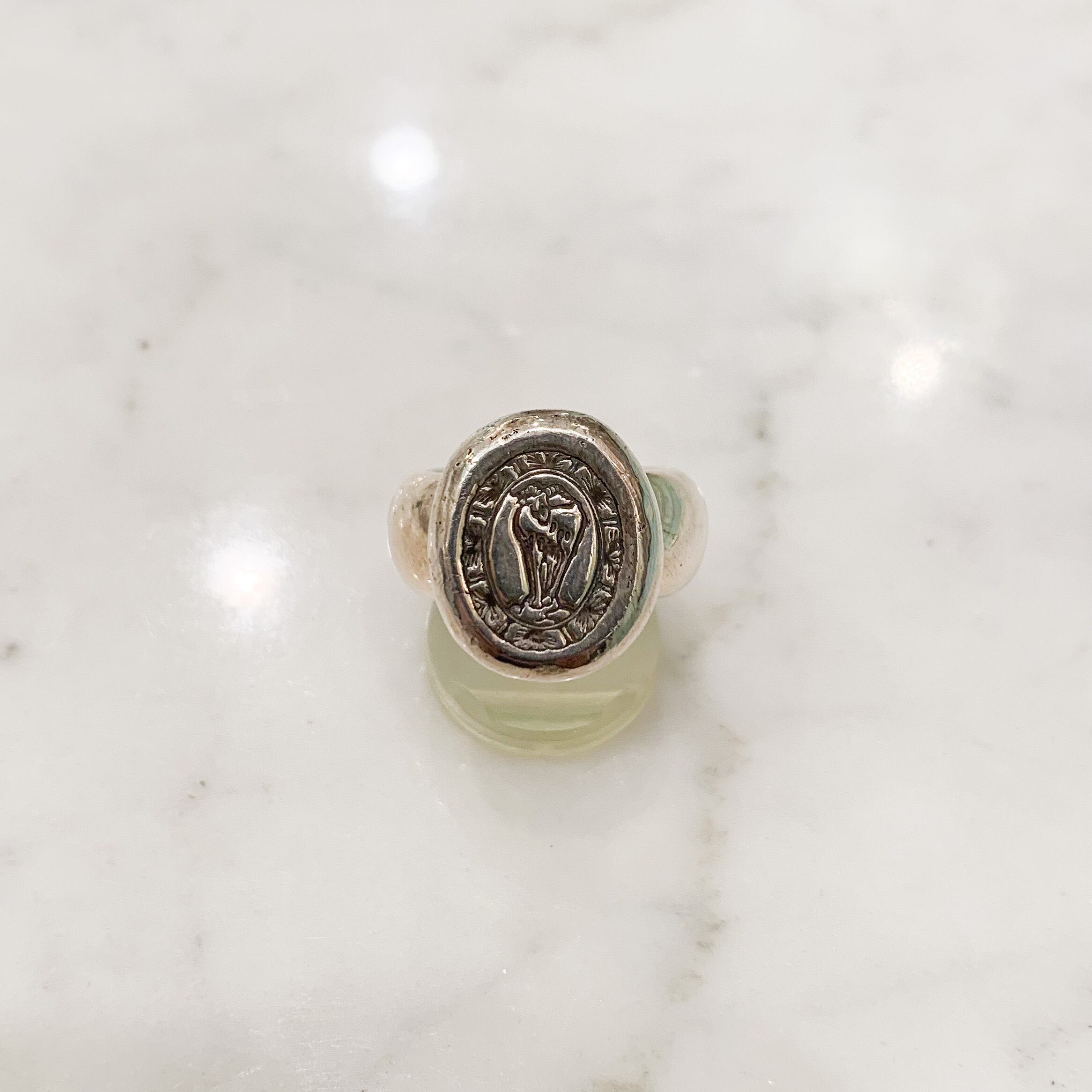 ポトリと落とした楕円形のシルバーの上から、モチーフをギュッと押して作った大きめの刻印を、シンプルなシルバー台にセッティングした、スッキリとしたデザインのリングです。