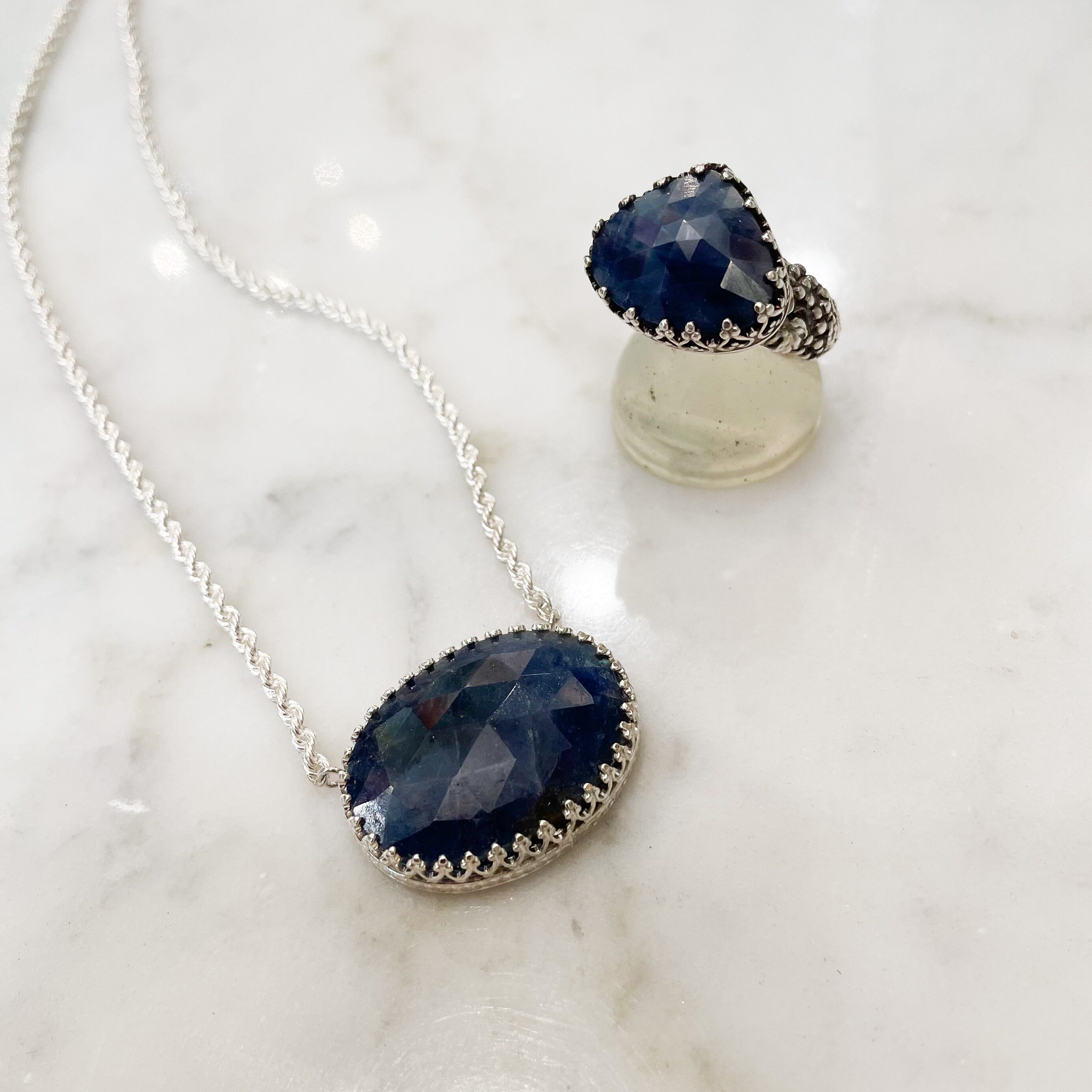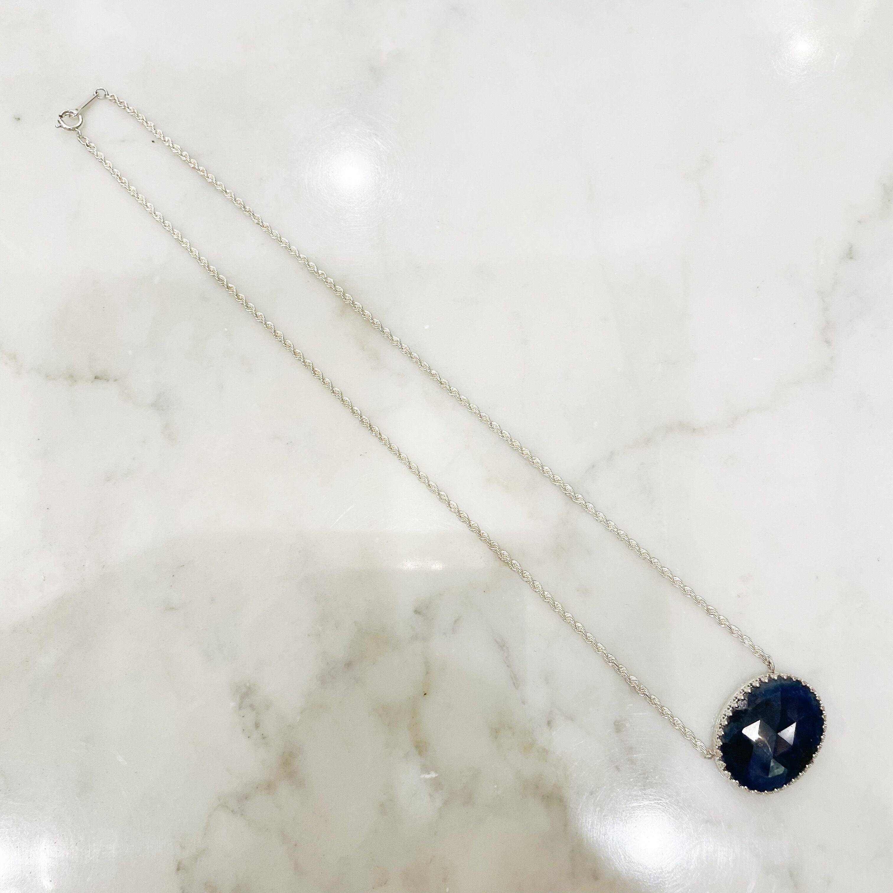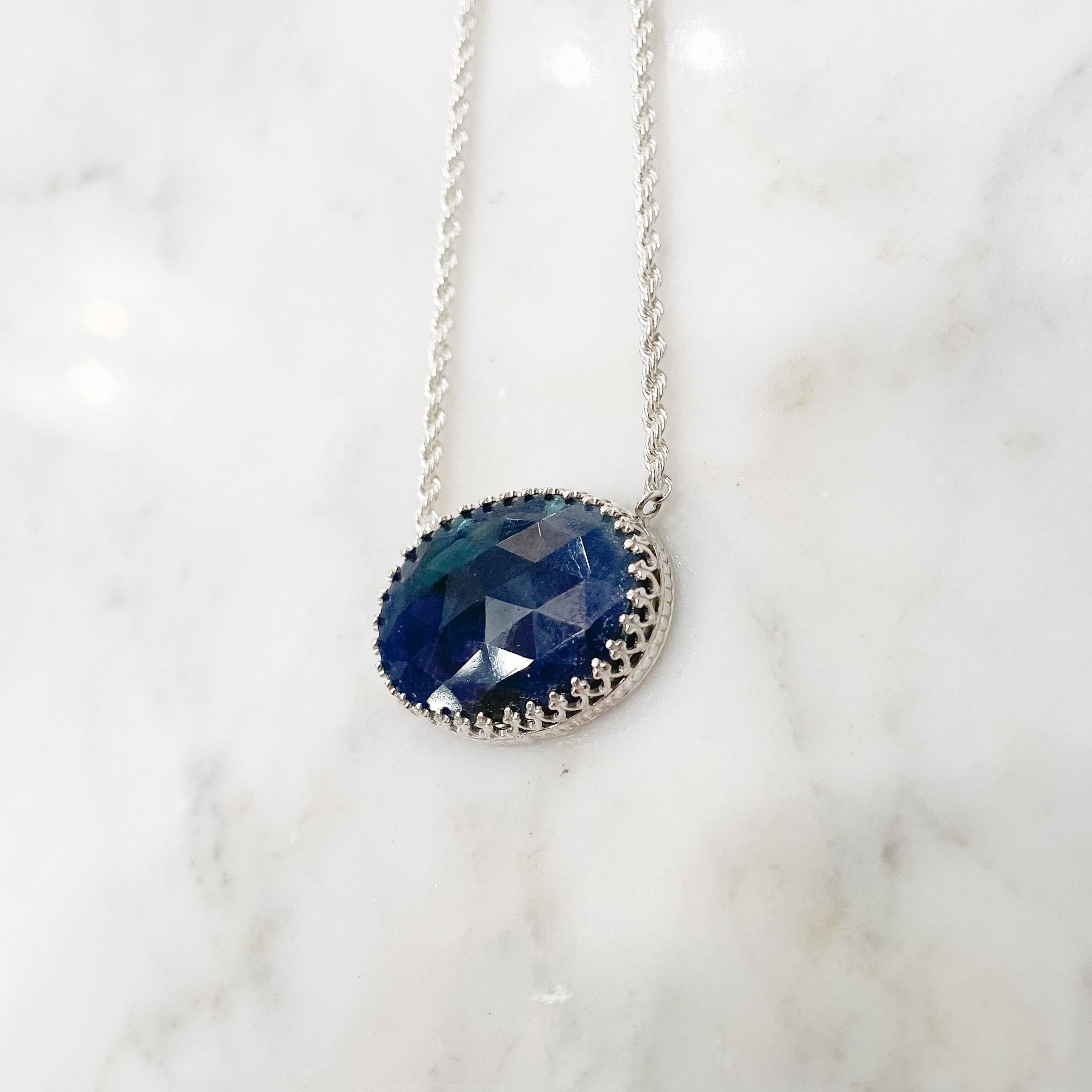 :シルバーで王冠留めされた横楕円のサファイア(21.41ct)のネックレス