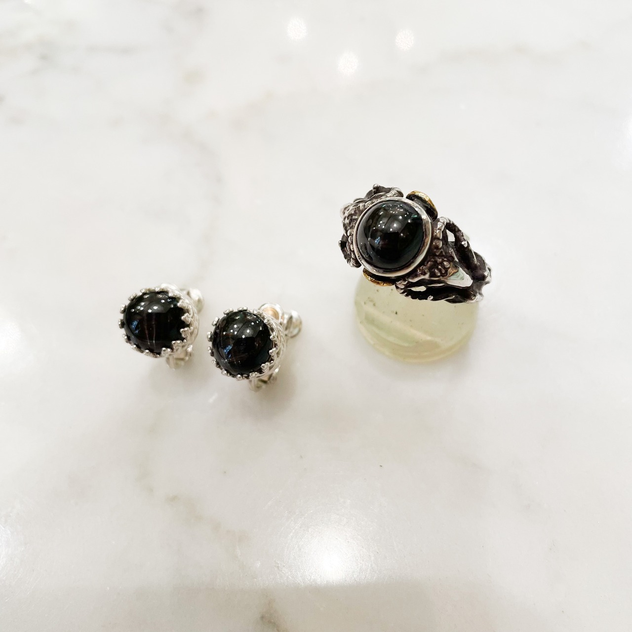 黒の石にシルバーというアッサリとしたトーンのイヤリングですが、爪の繊細さと、ブラックスターに浮かぶ白い星の輝きが一味違う個性的なイヤリングです。