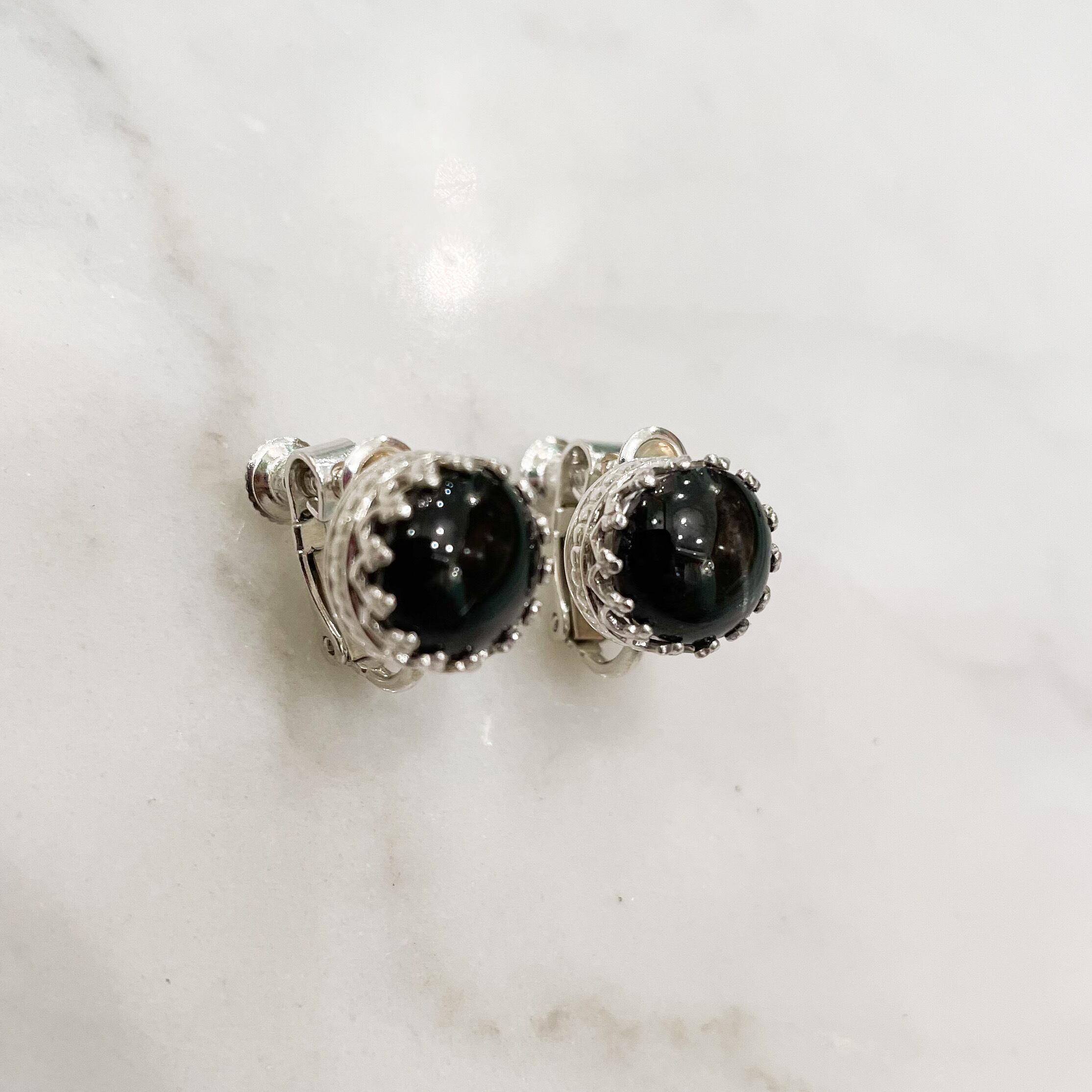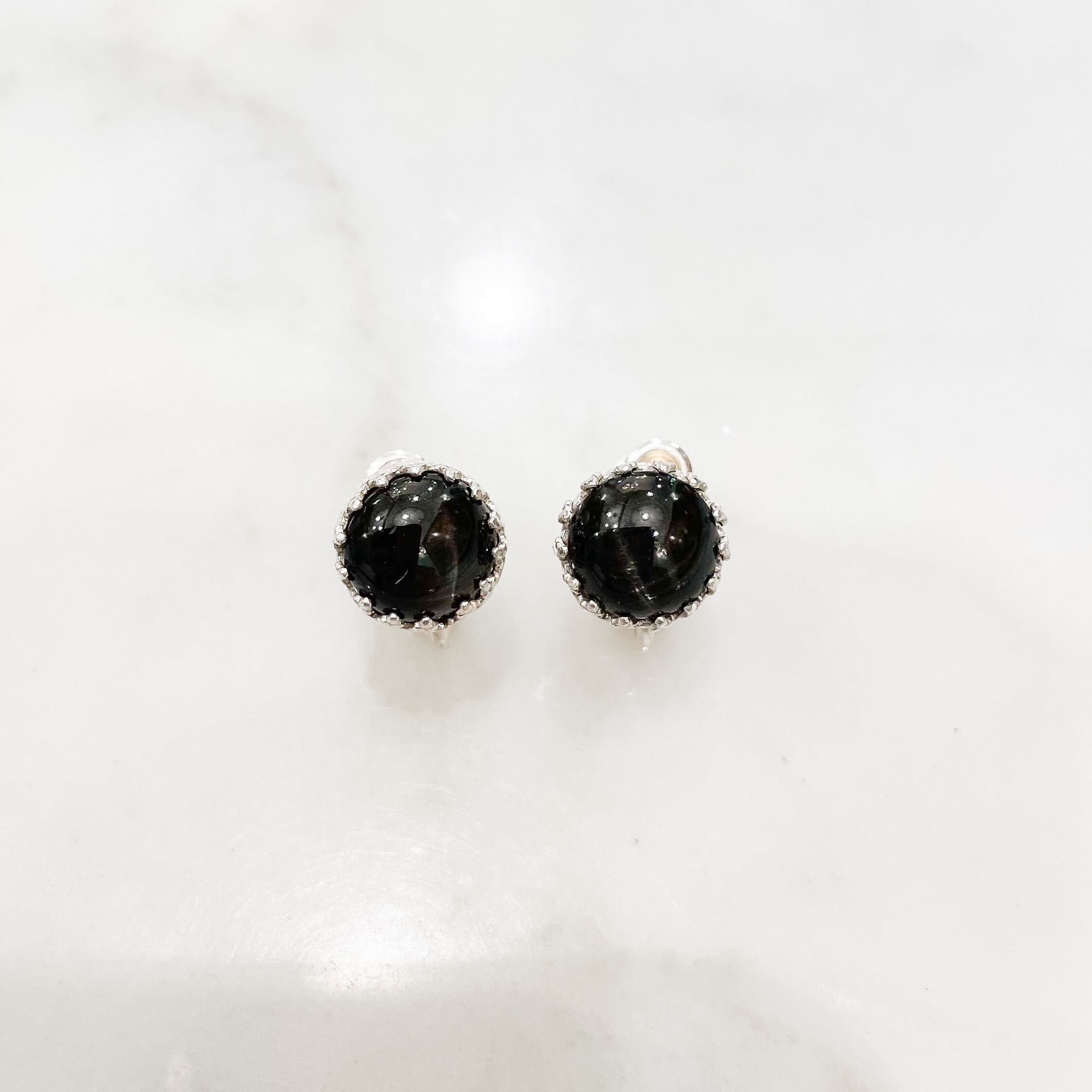 こちらのイヤリングはブラックスターをティアラのような繊細なシルバーの爪でグルリと巻いた、シンプルな作りです。