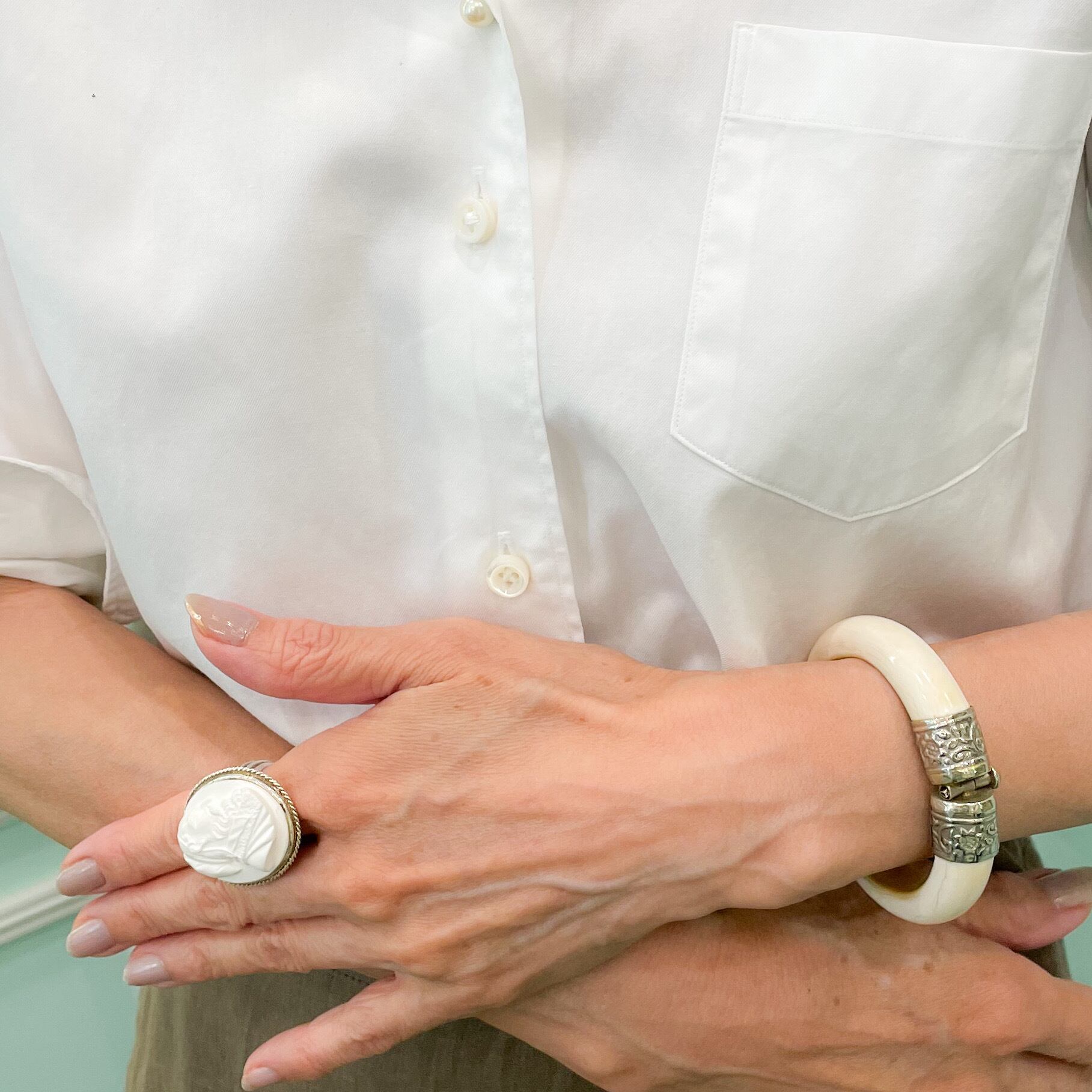 白いニューラーヴァカメオ(ダヴィンチ)の五山シルバー台リング