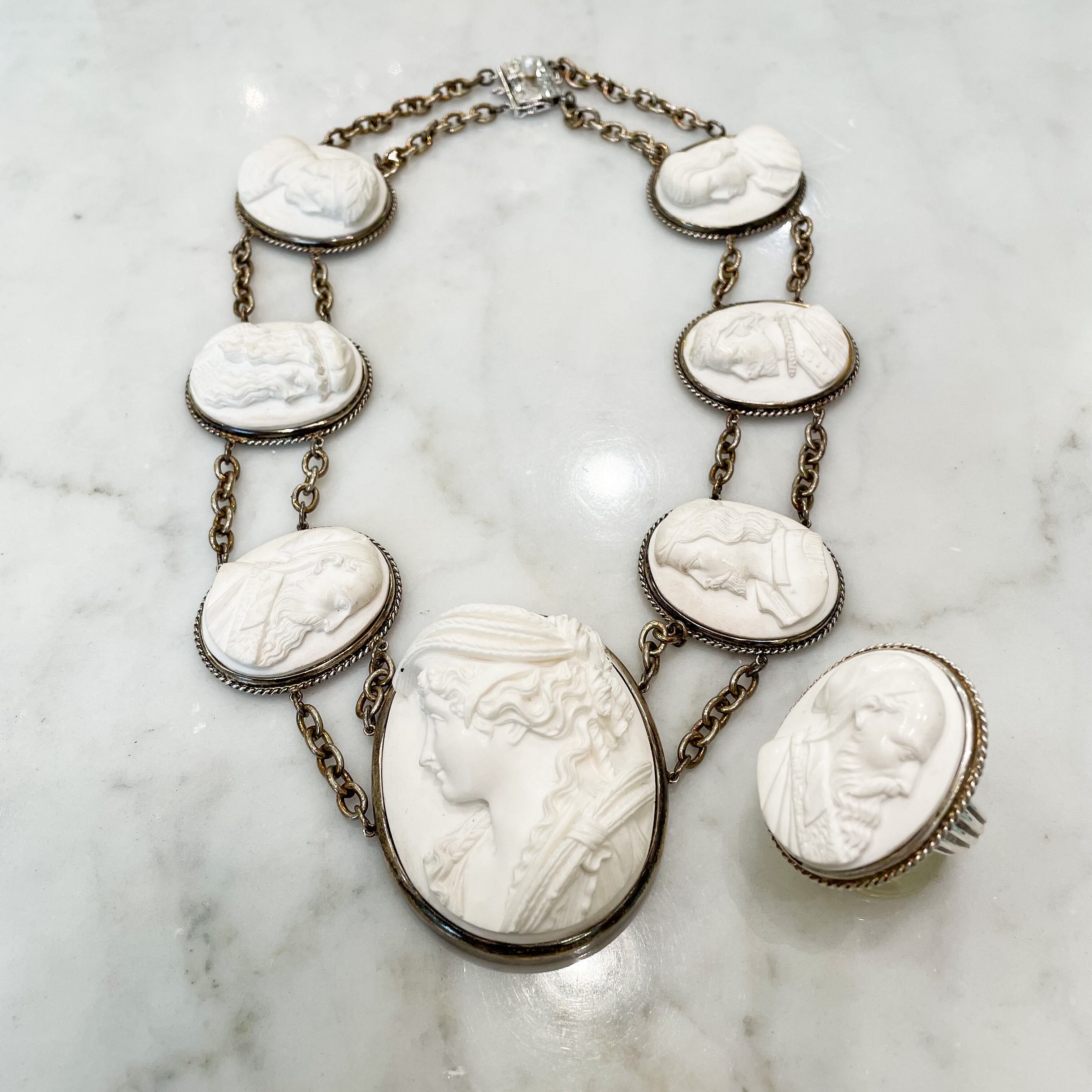 白い不思議な質感のニューラーヴァカメオを縄目のフレームでグルリと巻いて、シンプルな五山のラインが彫られているシルバー台に載せました。