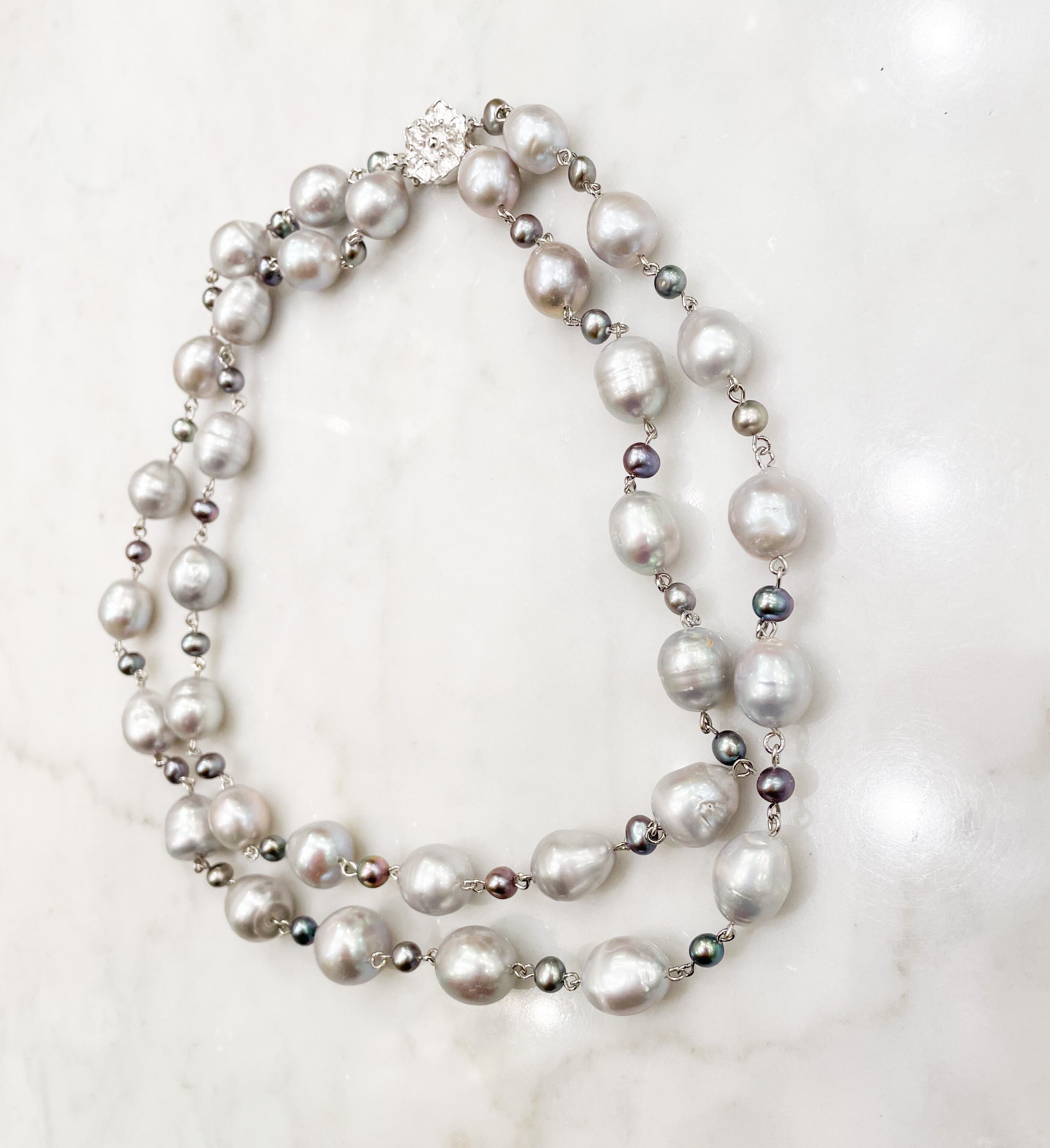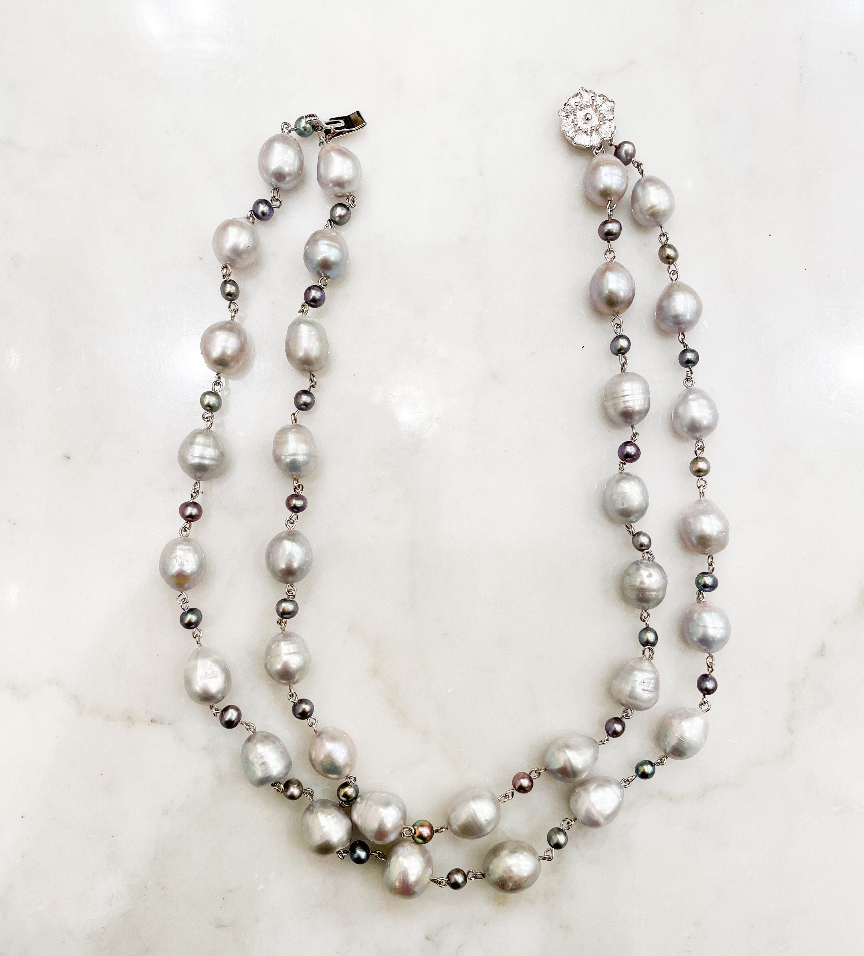こちらの2連のネックレスに使っているバロックパールは、すごく綺麗なパールでは無いのですが、カジュアルに、色や質感を楽しんで使うのには十分です。
