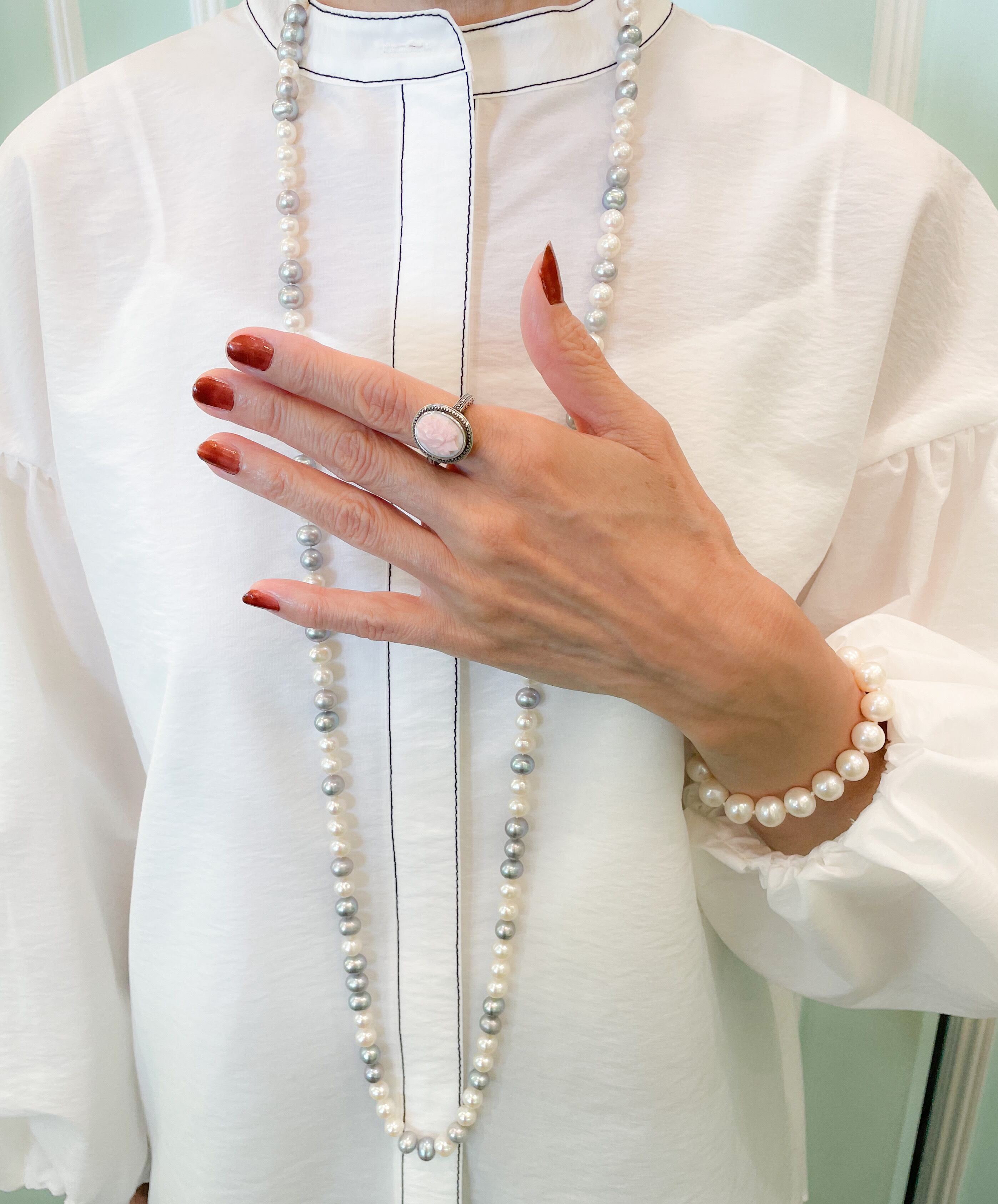 白とピンクという可愛らしい色合いの指輪ですが、モチーフがとてもノーブルなので甘くなりすぎず、付けやすいものになっています。