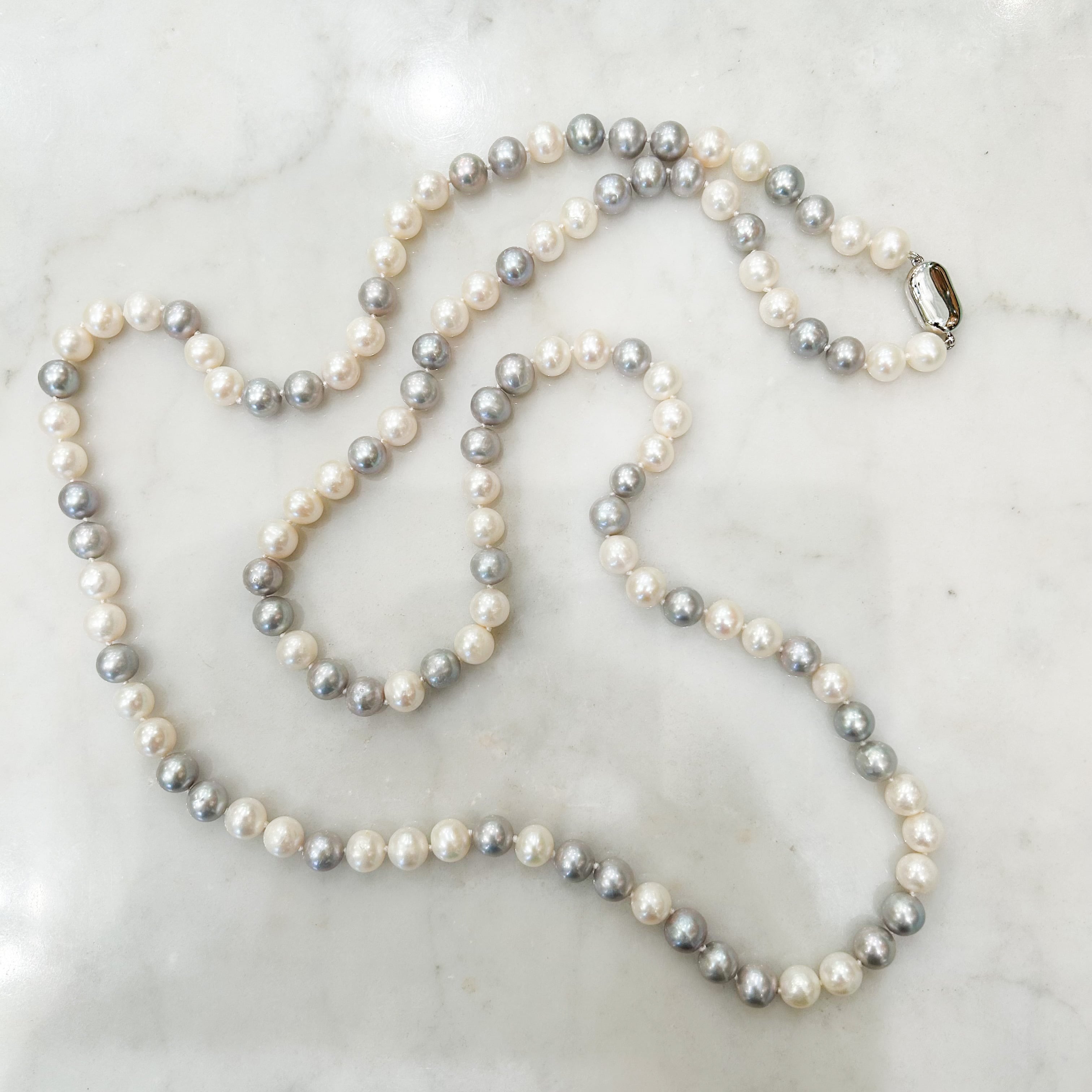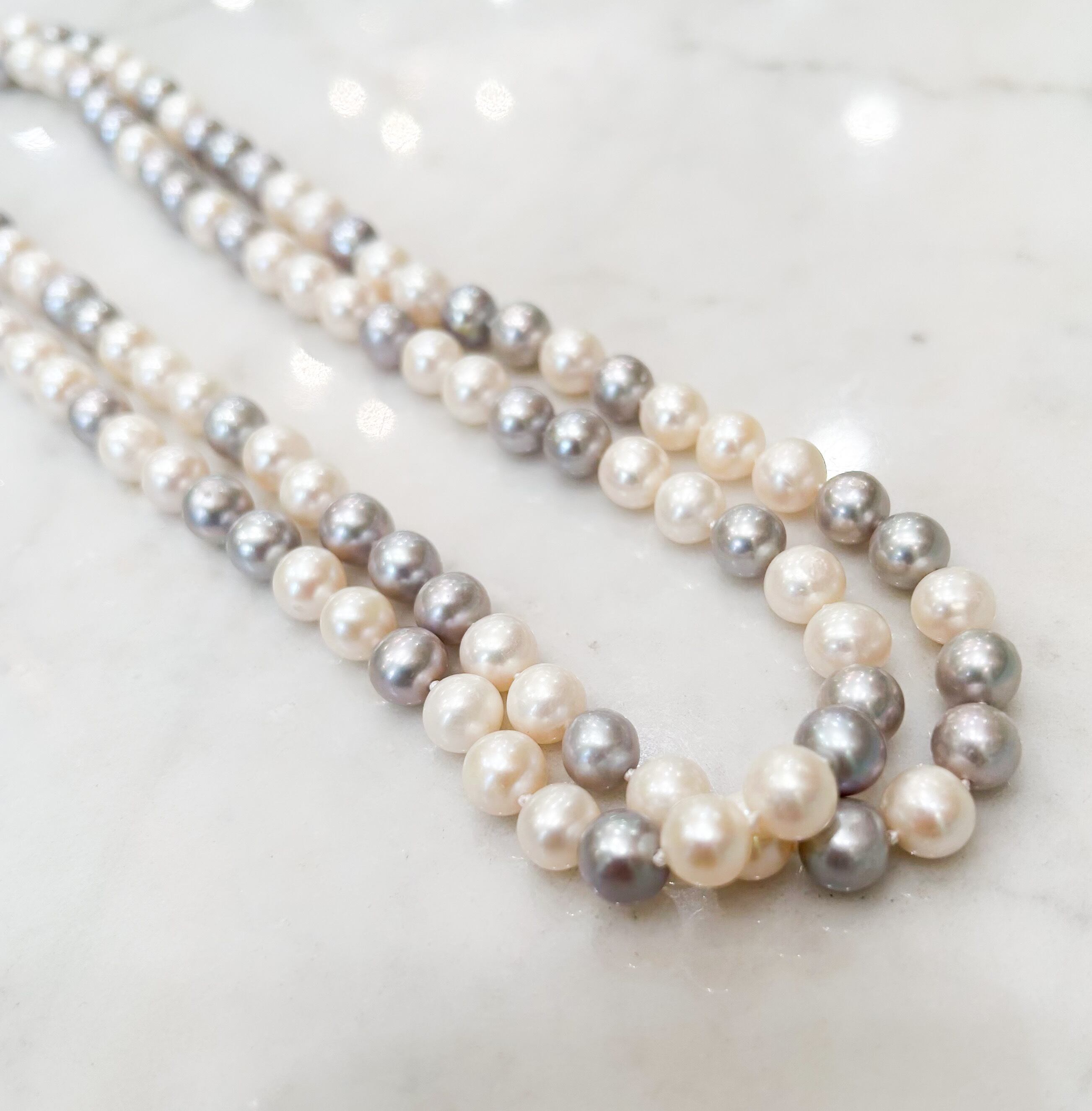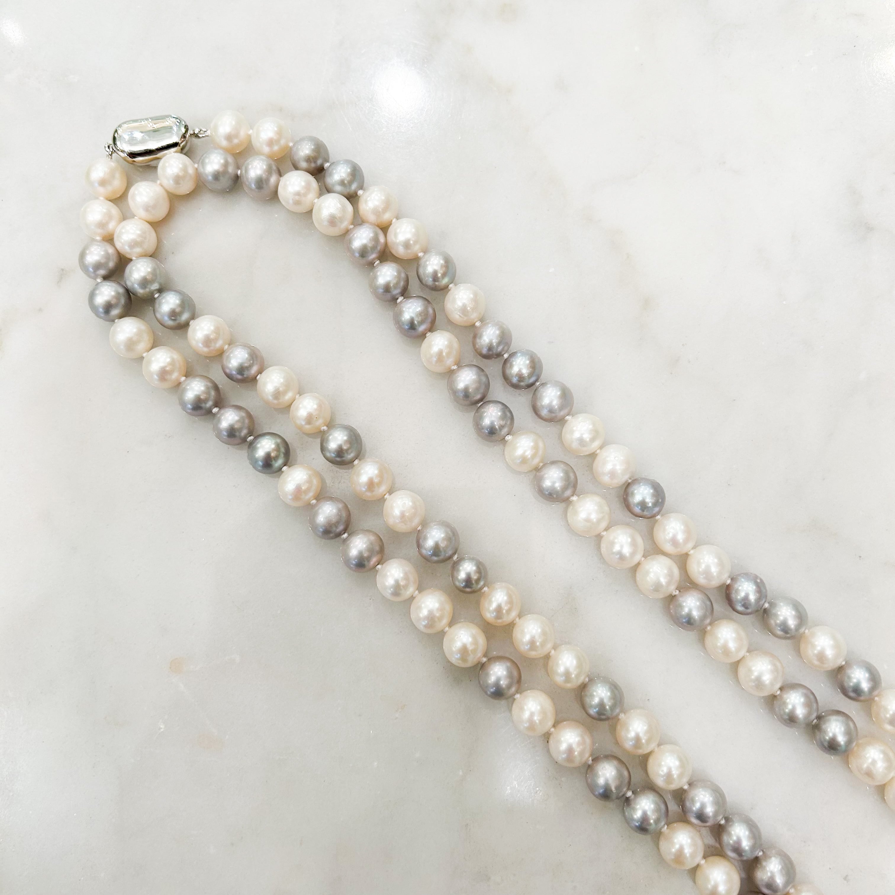 少し濃いめのグレーと、淡いグレーに白の淡水パールのロングネックレス。