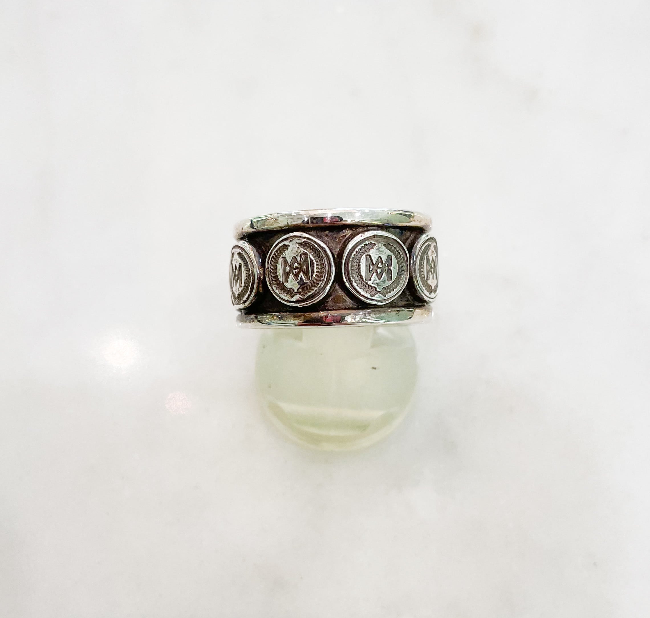 少し厚めに作られた銀の指輪の中に丸い部分が見えているのですが、それはアキオモリのAMモノグラムの下に月桂樹がデザインされたマークです。