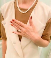 これくらいの長さの真珠のネックレスはクラシカルな雰囲気があって、カジュアルな装いにプラスしてもエレガントさを演出することができます。