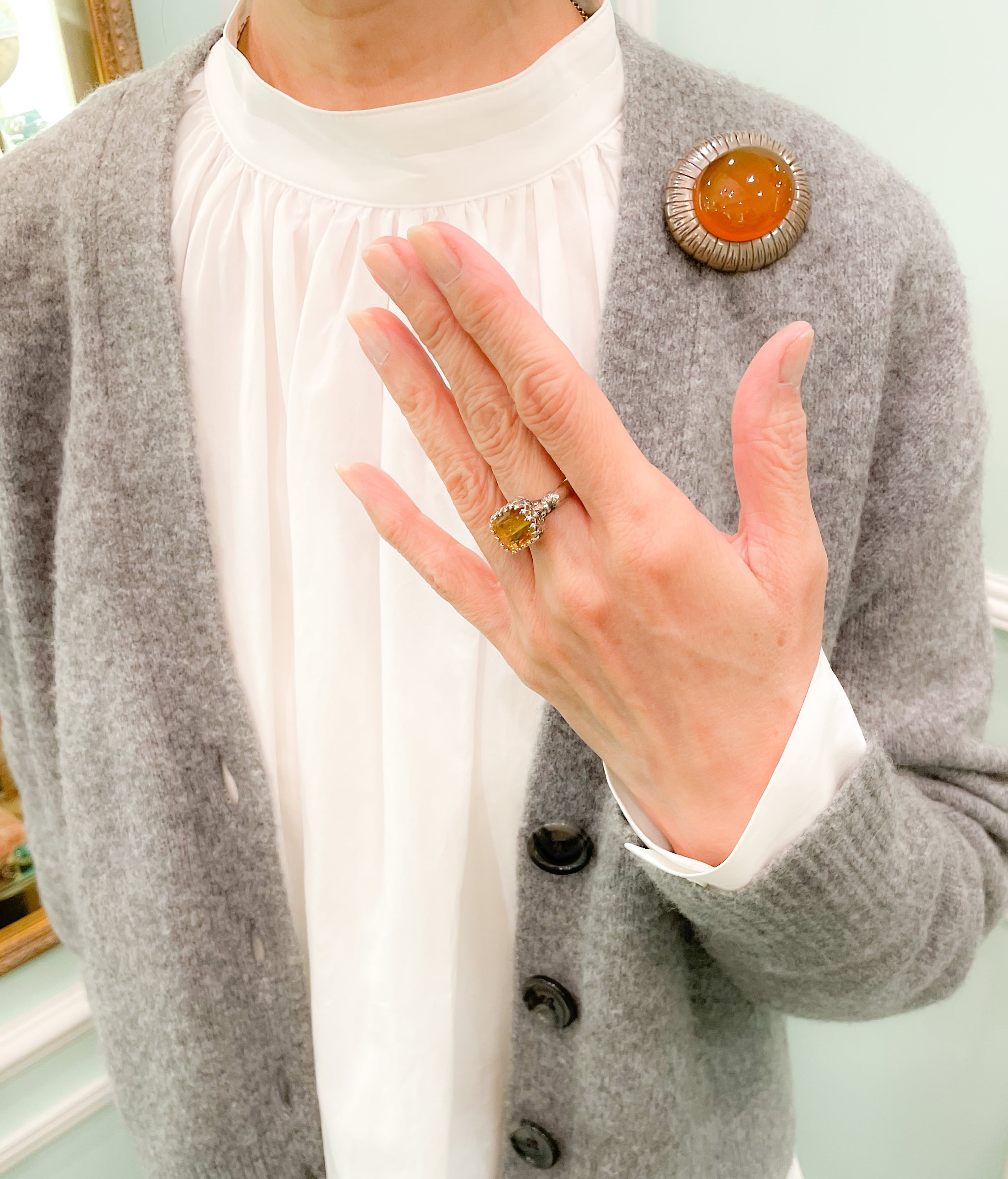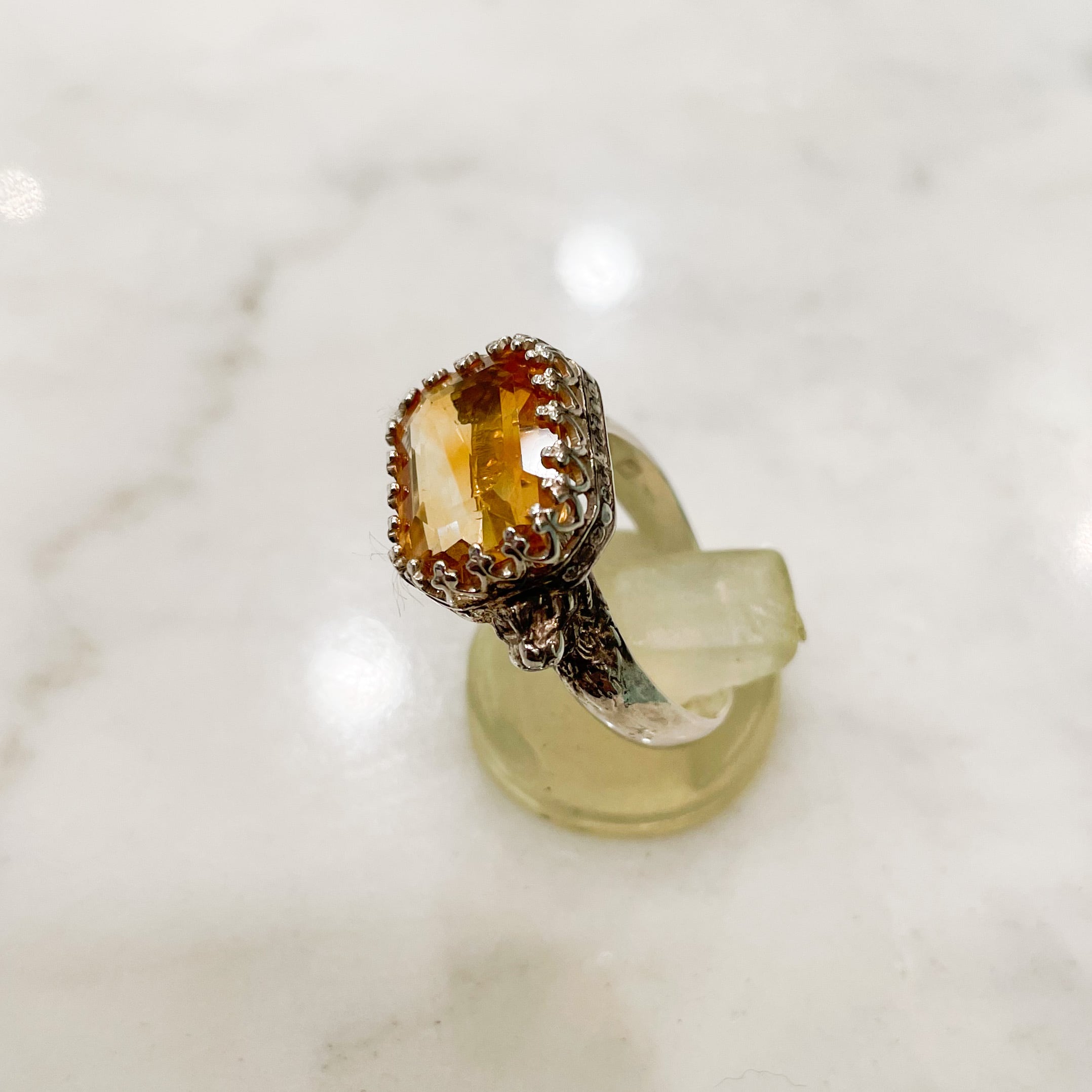 その透明感の効果でシトリンの下のシルバーリングが見えるため、台に施されている不思議な文字も見えているのがこの指輪の魅力の一つ。