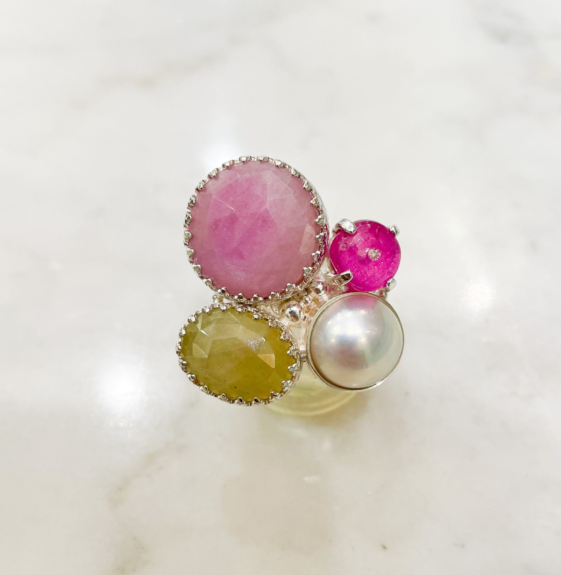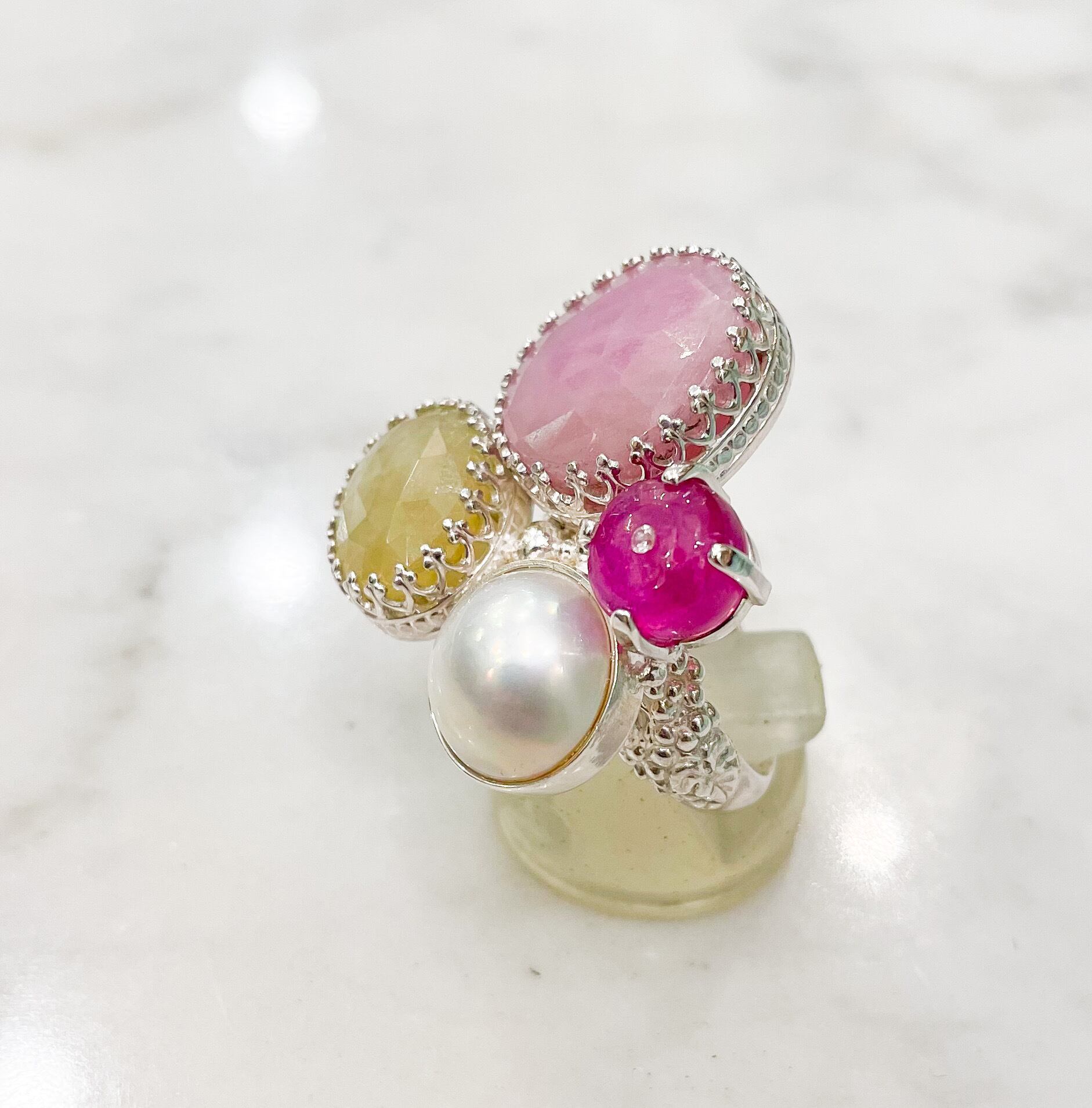 ピンクとライトイエロー2つのカラーサファイア(15.04ct)とマベパール、ルビー、小さなダイヤモンドのシルバーリング