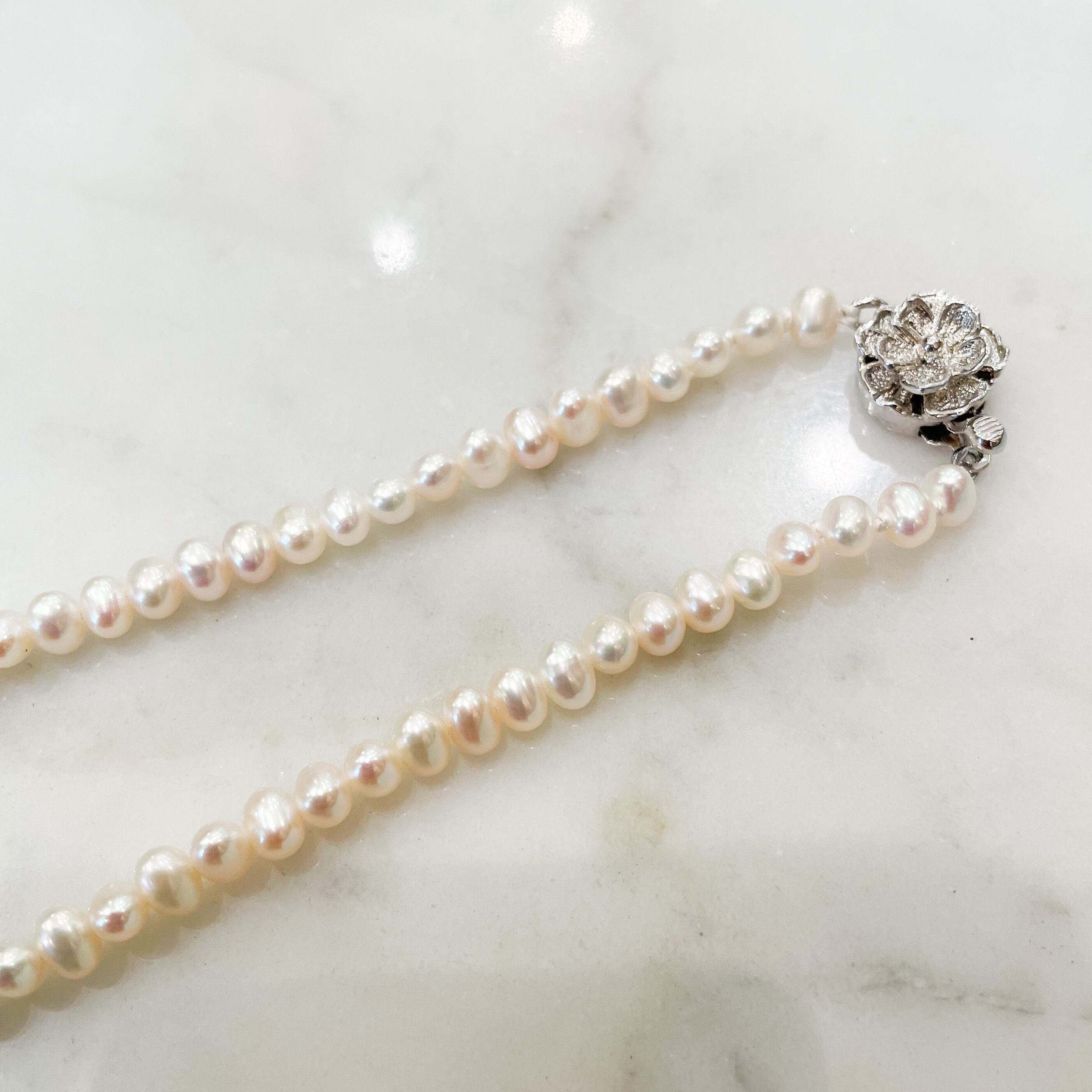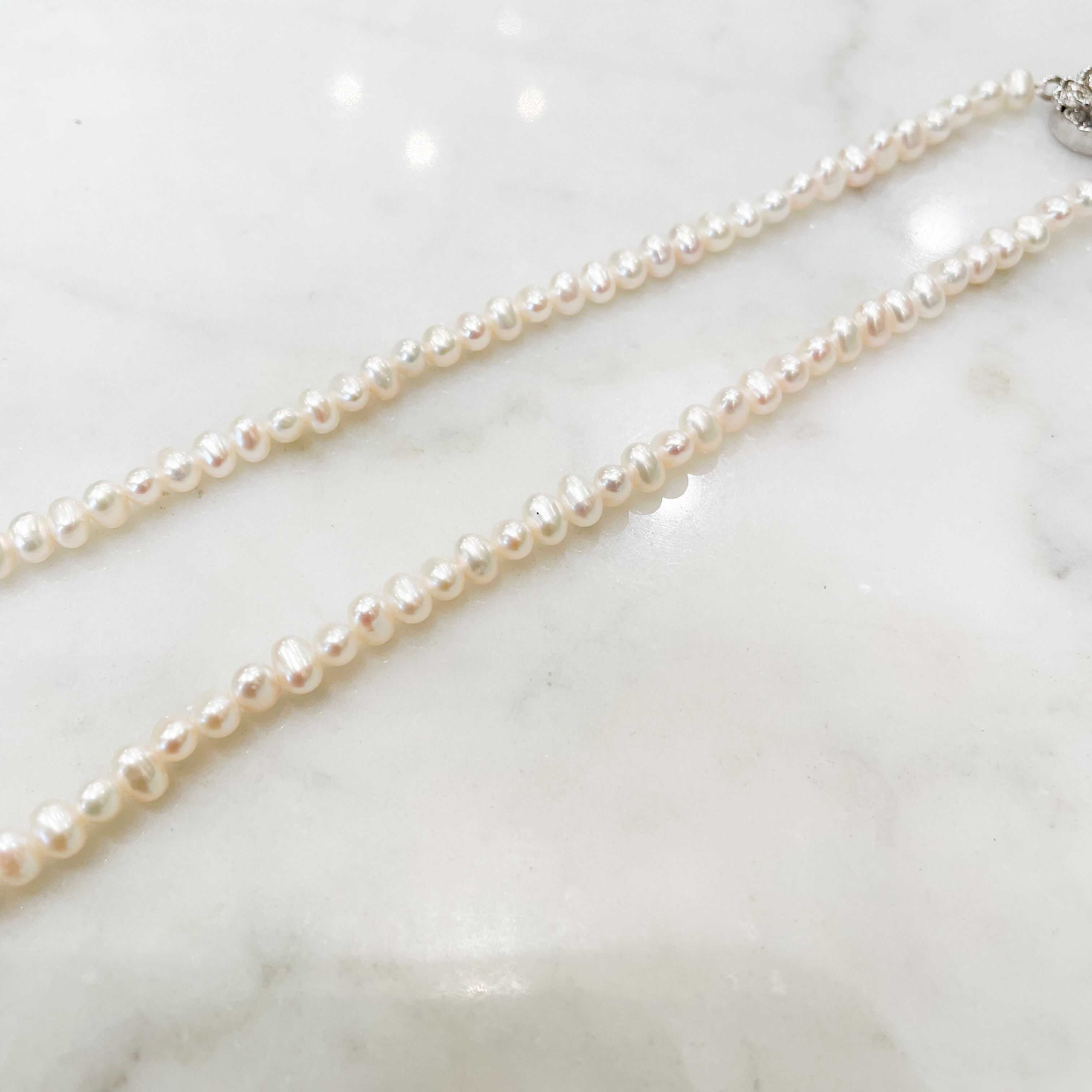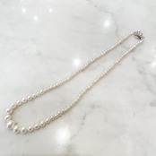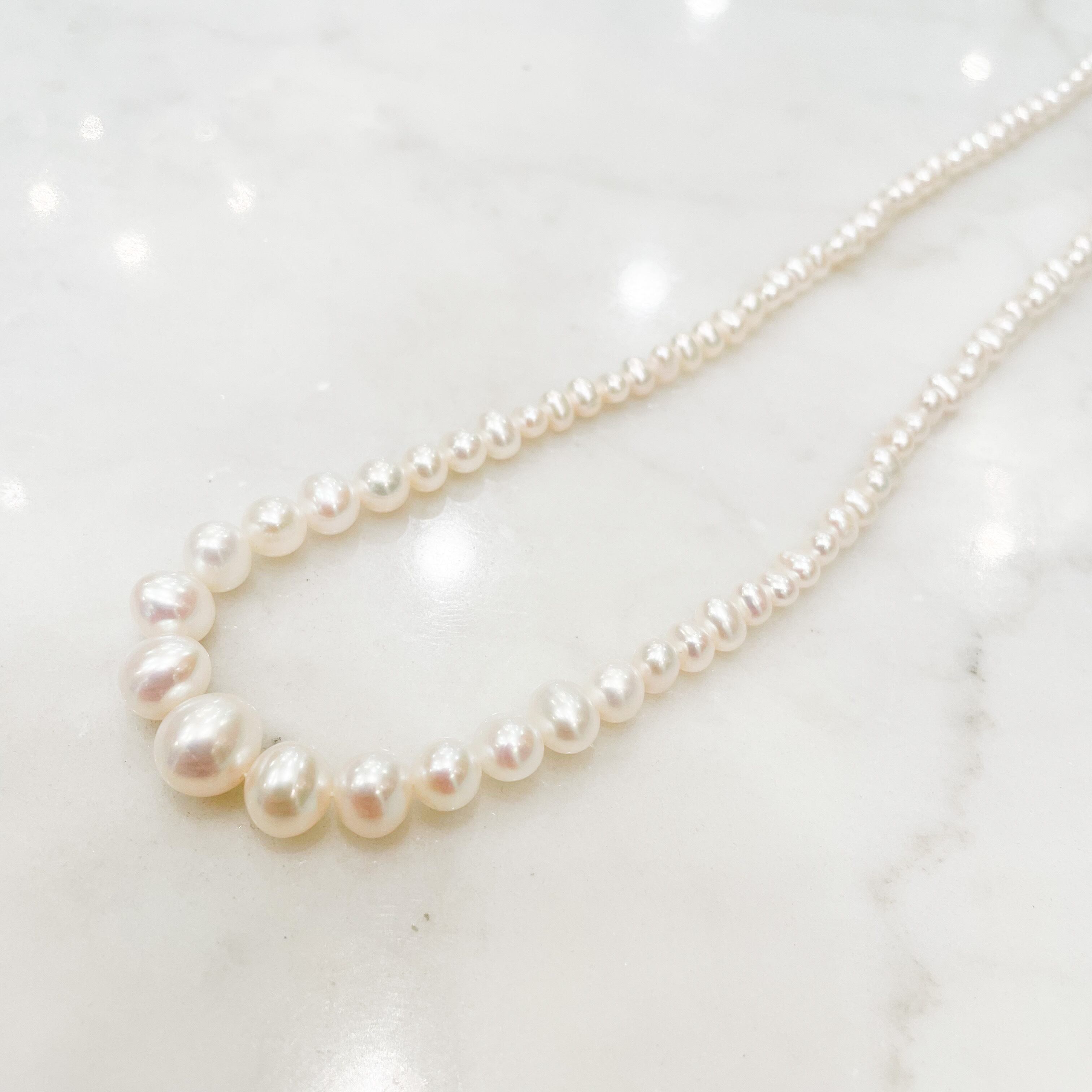 少し縦長のポテトと呼ばれる可愛らしい形の真珠をグラデーションで並べたネックレスです。