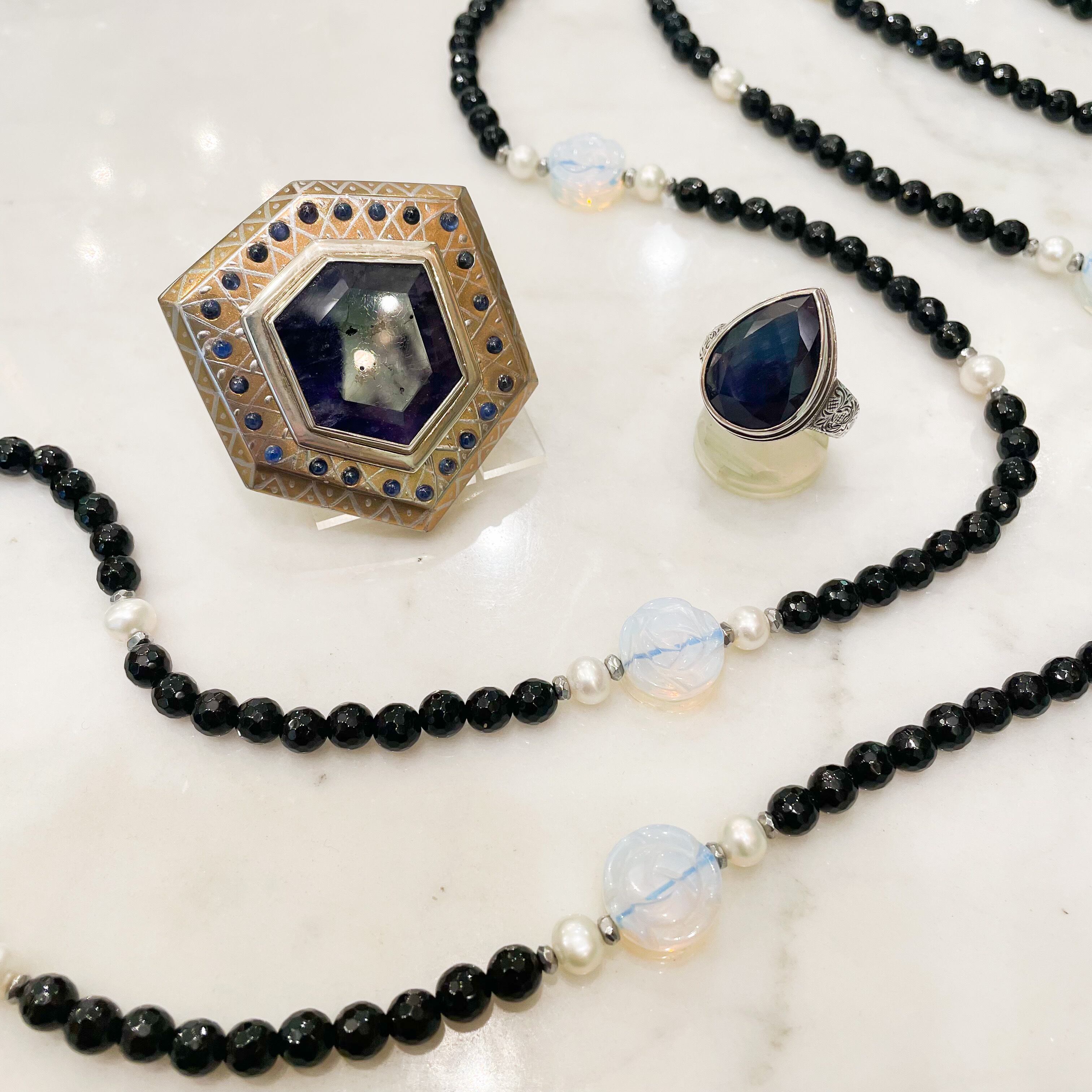 冷たく渋い銀の輝きと、不思議な深みのあるサファイアの色とマッチして、冷たい美しさを見せてくれています。