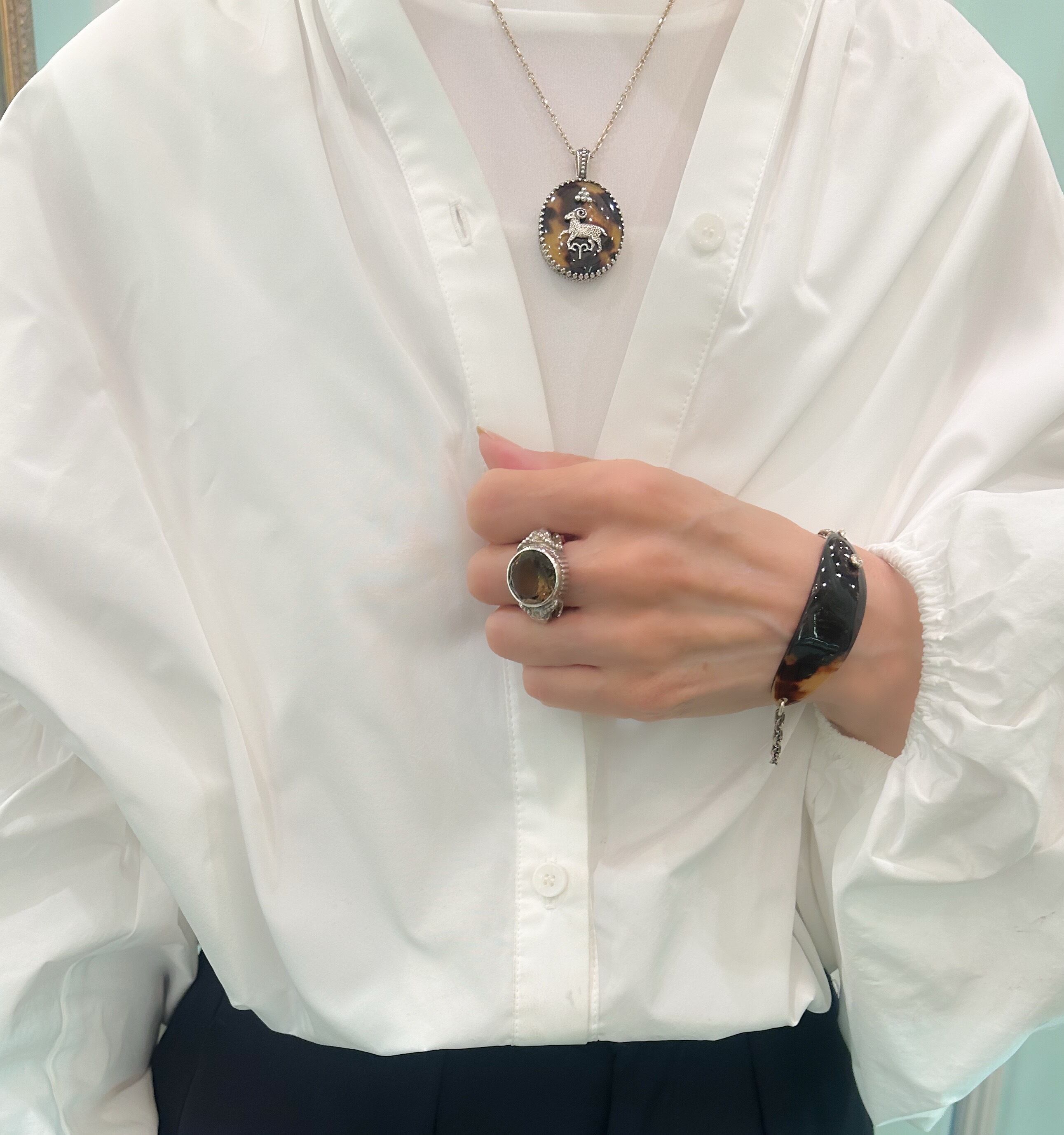 べっ甲の不思議なトーンの中に燻されたシルバーの山羊という個性的な組み合わせはアキオモリならでは。