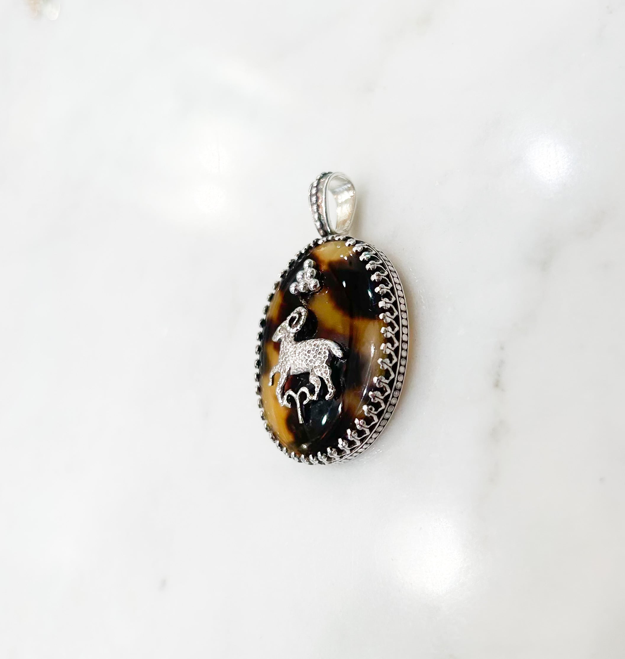 シルバーで王冠留めされたべっ甲に牡羊モチーフのペンダント(チェーン別)