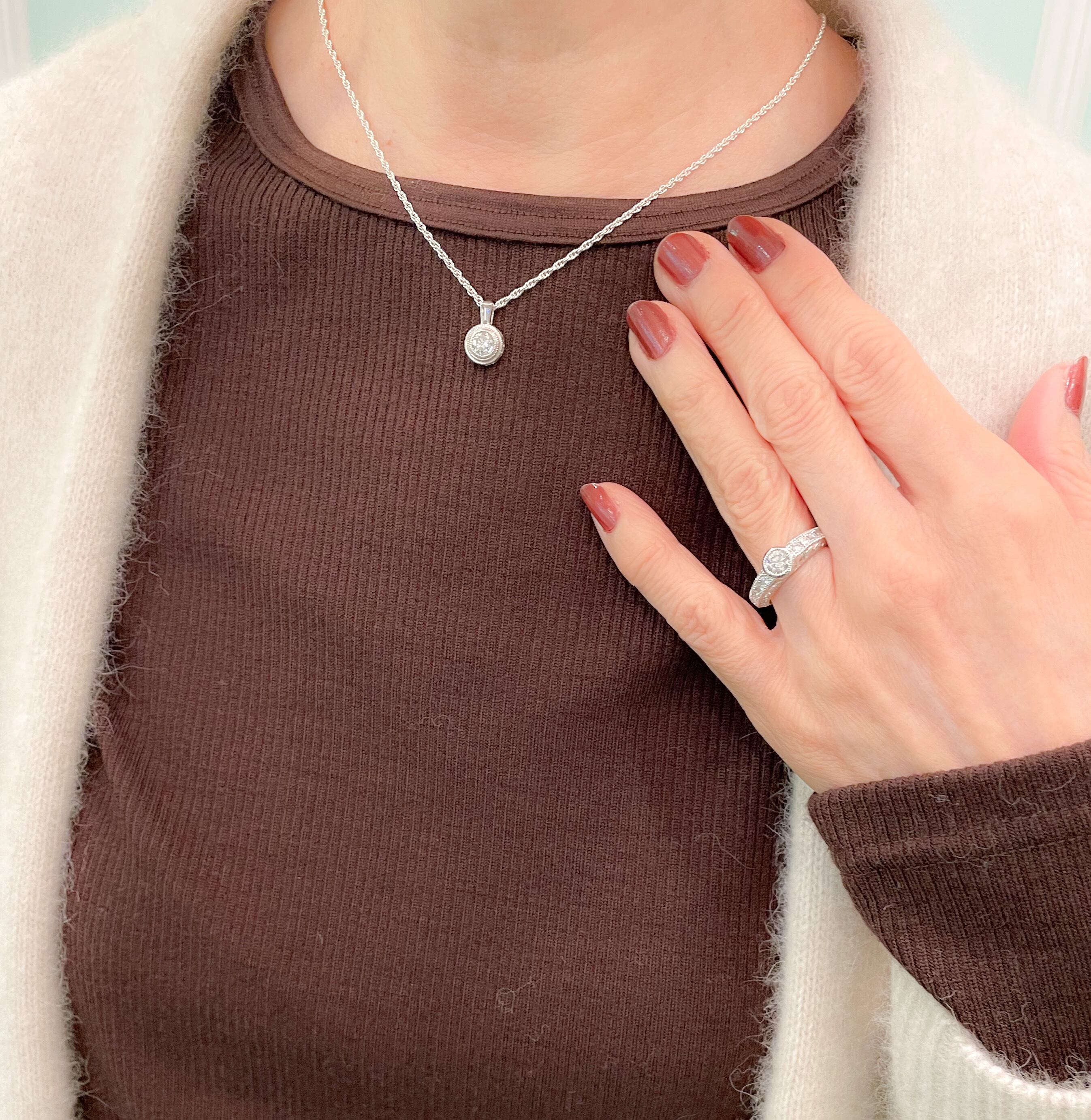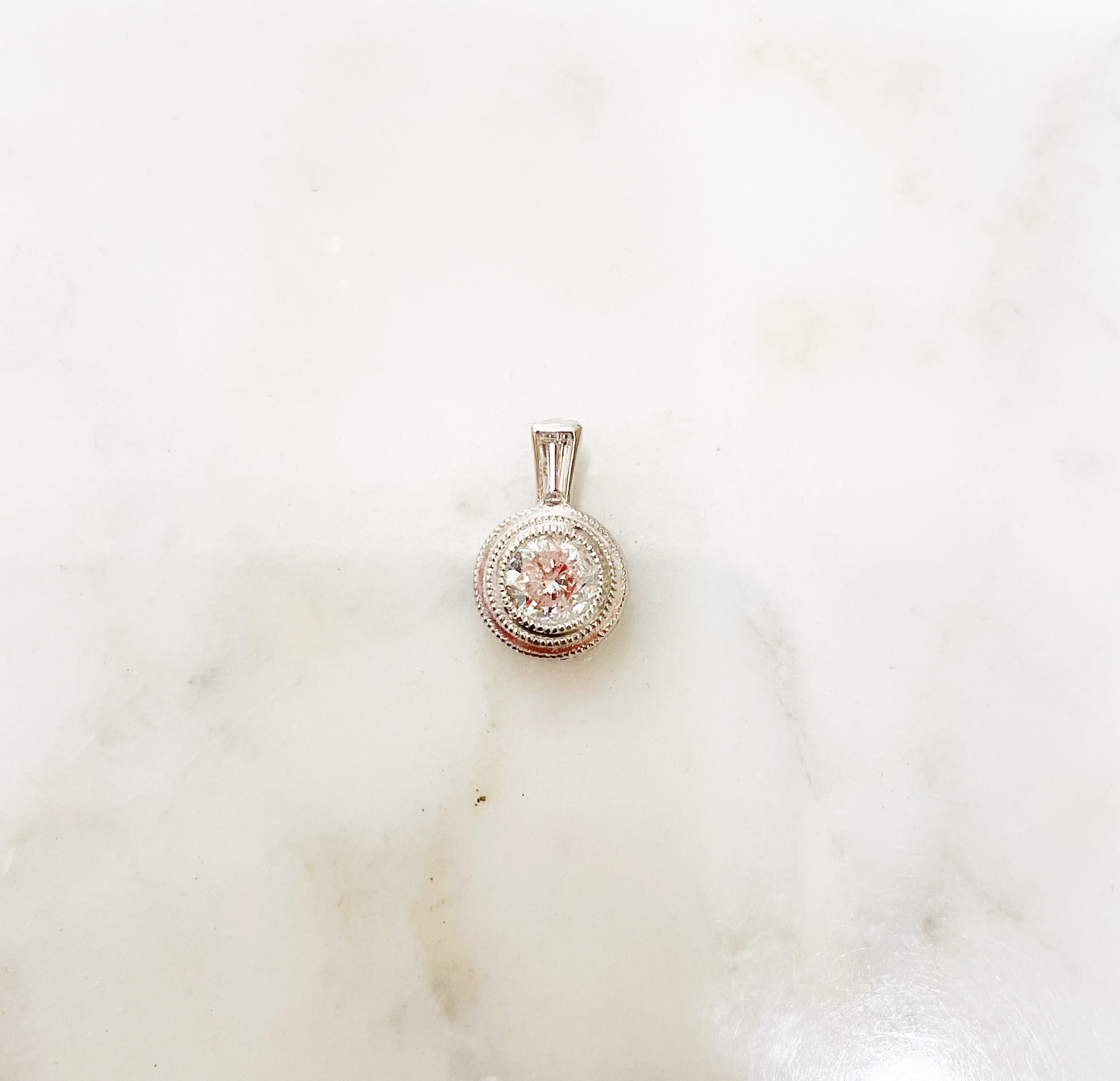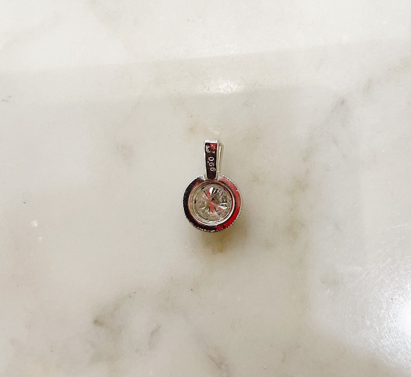 ダイヤモンドの周りを少し煌めくようなミル打ちのプラチナ製覆輪で囲むことで、ダイヤモンドの大きさが大きめに見えるのもこのペンダントの特徴です。