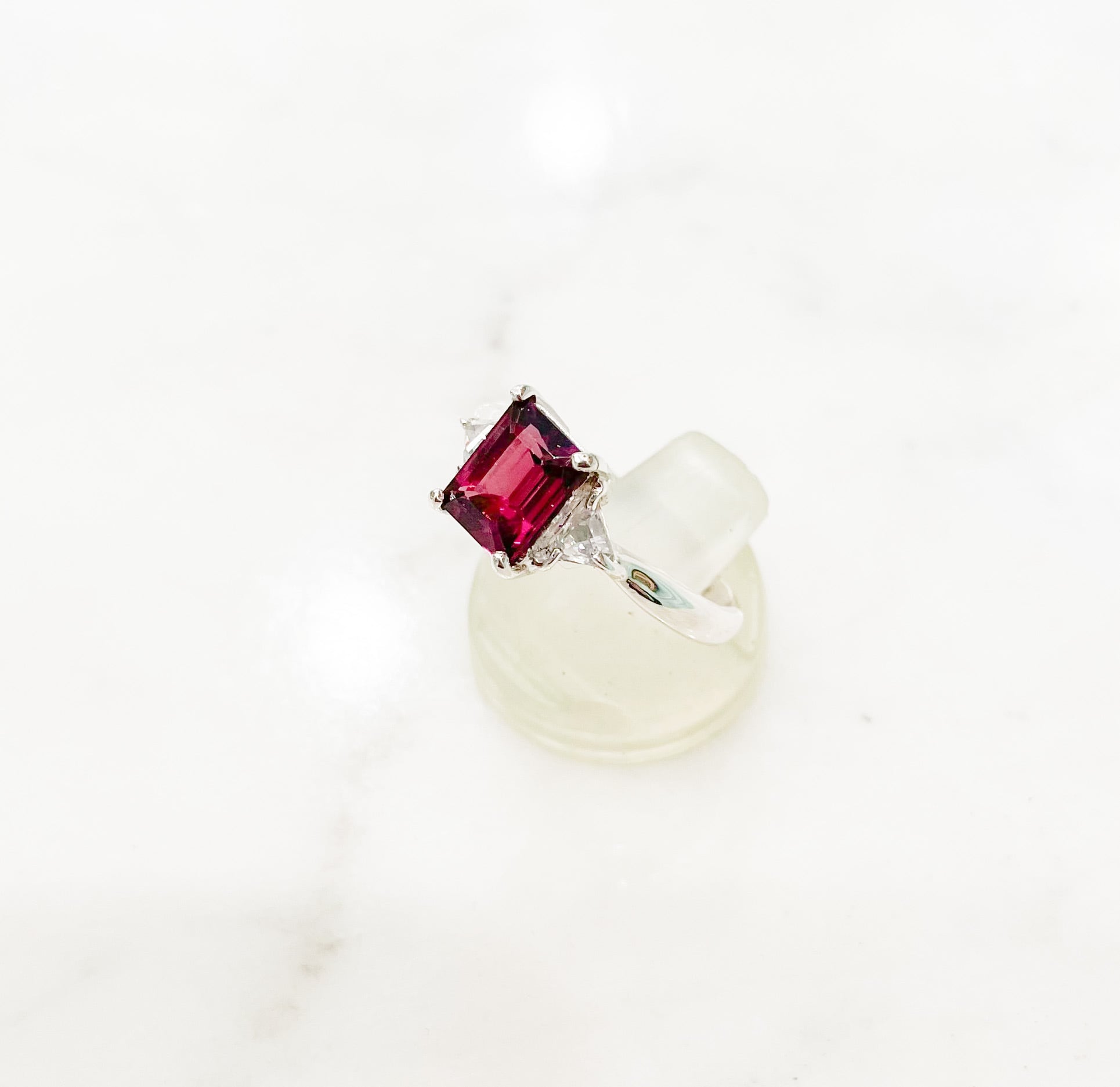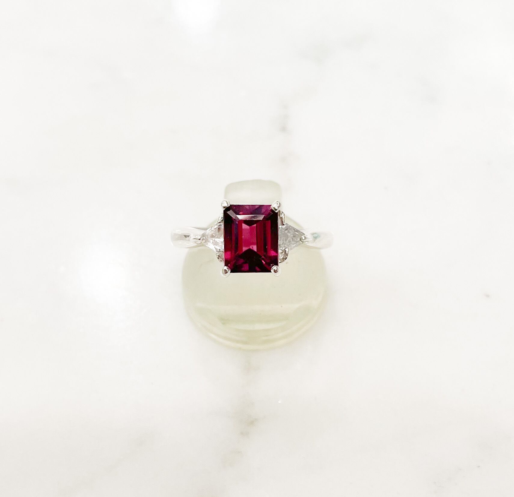 長方形のガーネット(1.91ct)と三角ホワイトサファイアのシルバー台リング