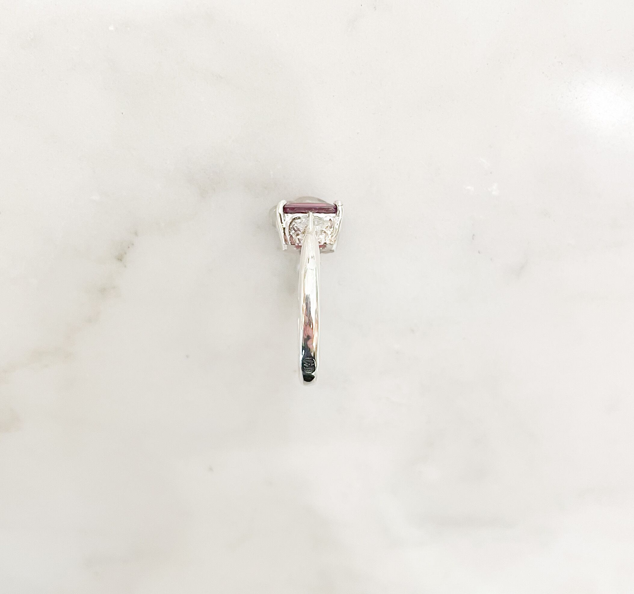 両サイドからは小さな三角形のホワイトサファイアが、透明な輝きで、不思議な色のガーネットをさらに美しく魅せてくれています。