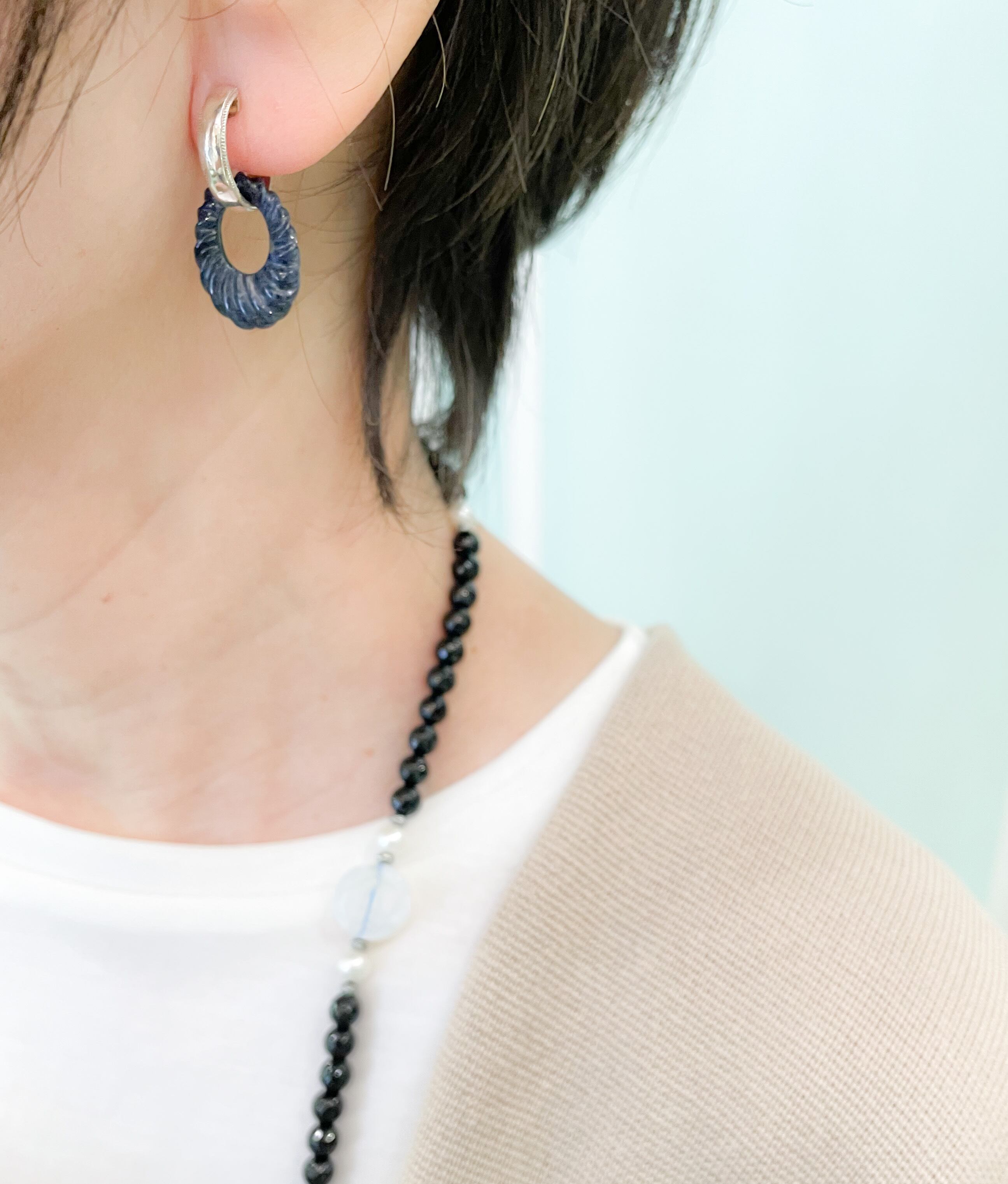 そんなソーダライトをつけてみると、まったく別の雰囲気のイヤリングに変身!