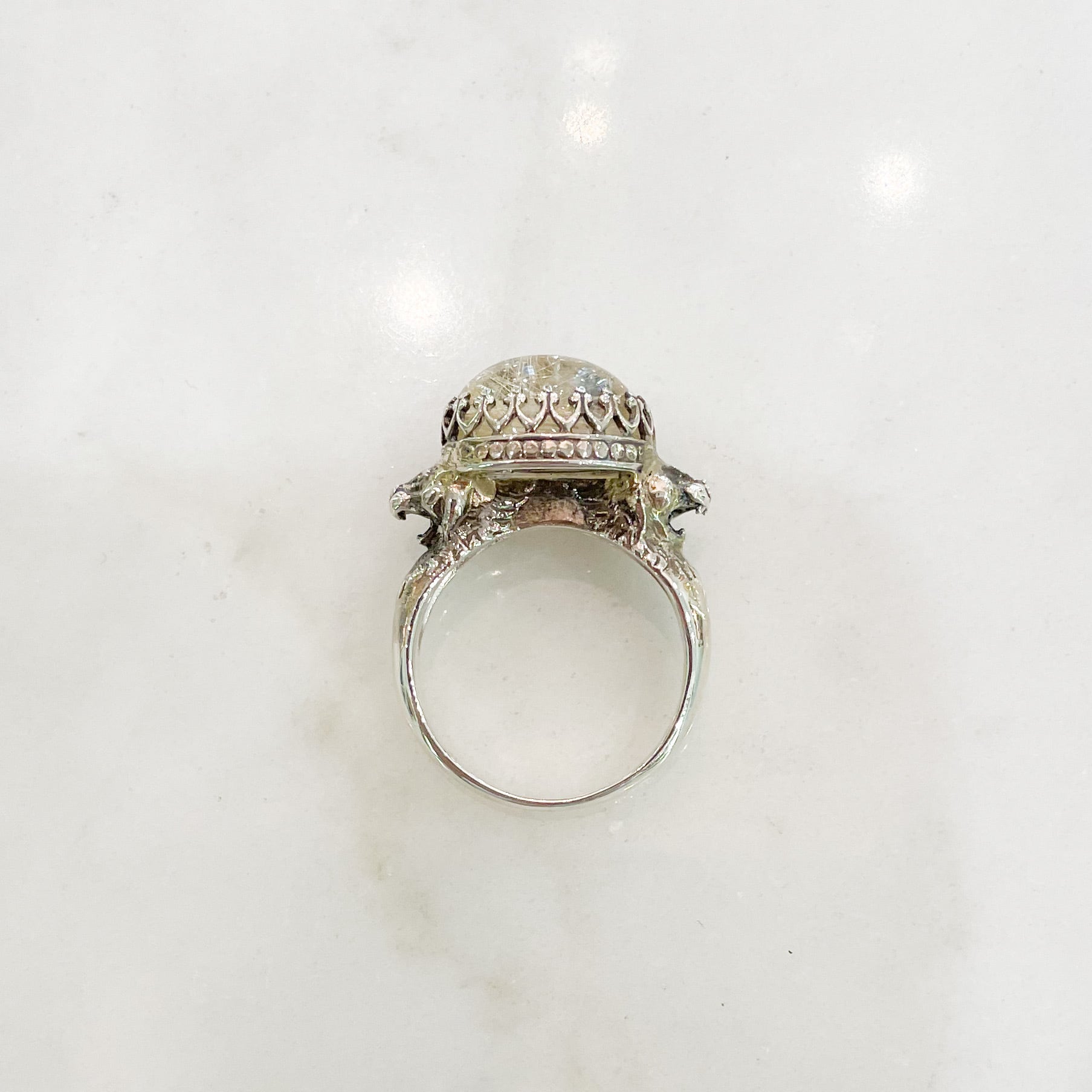 王冠留めされた楕円のルチルクォーツ、二頭のライオンのシルバーリング