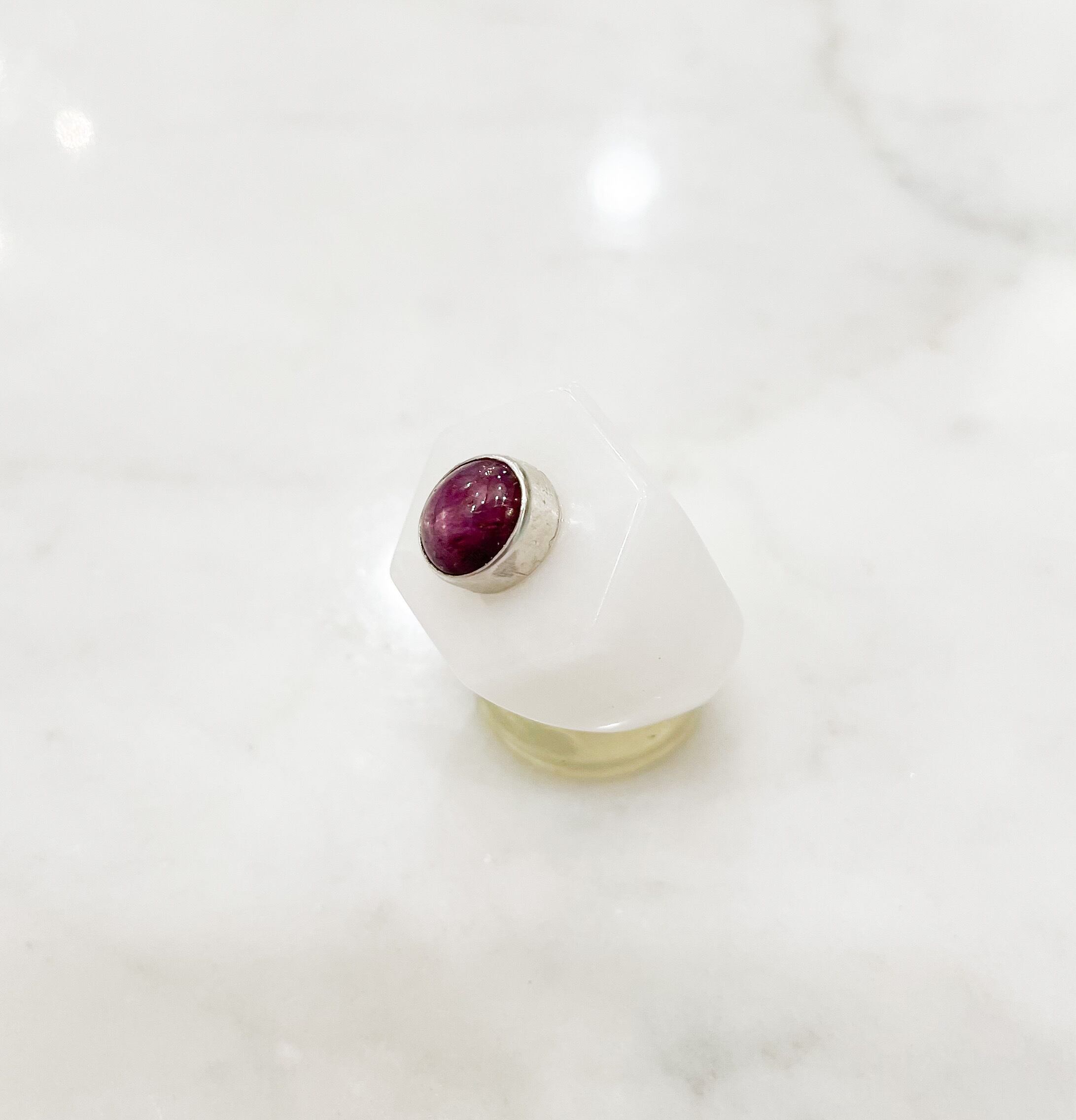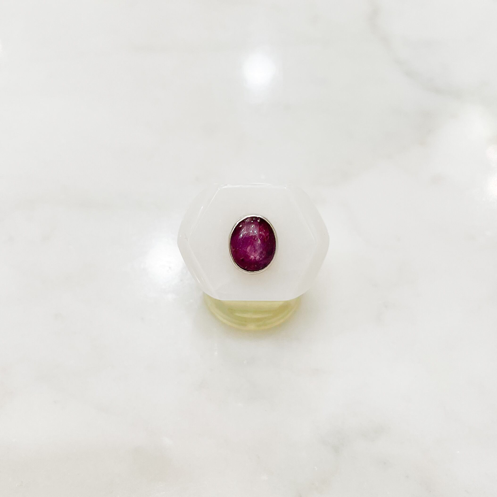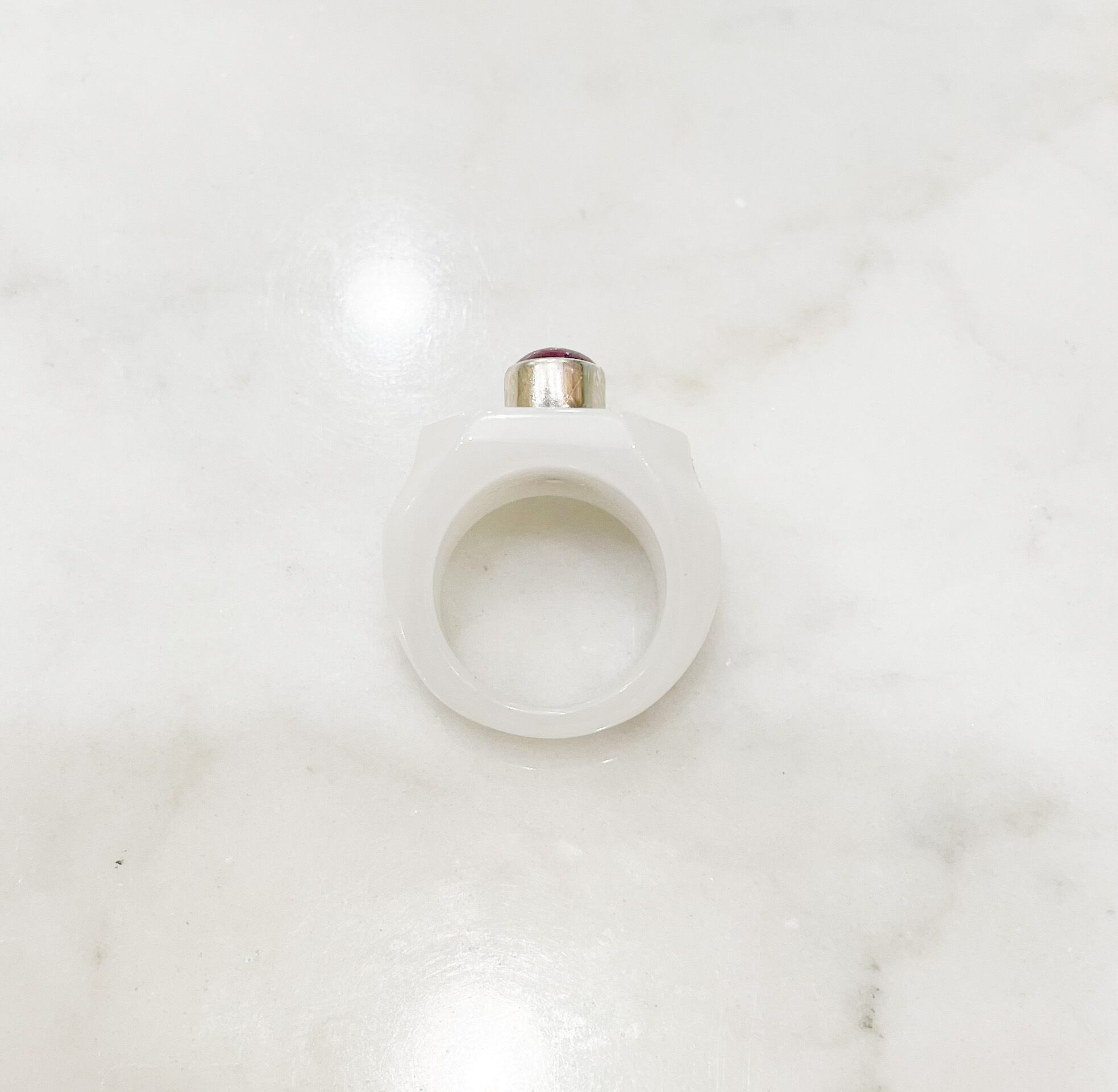 シルバーで覆輪されたインドスタールビー付きミルキージェイドリング