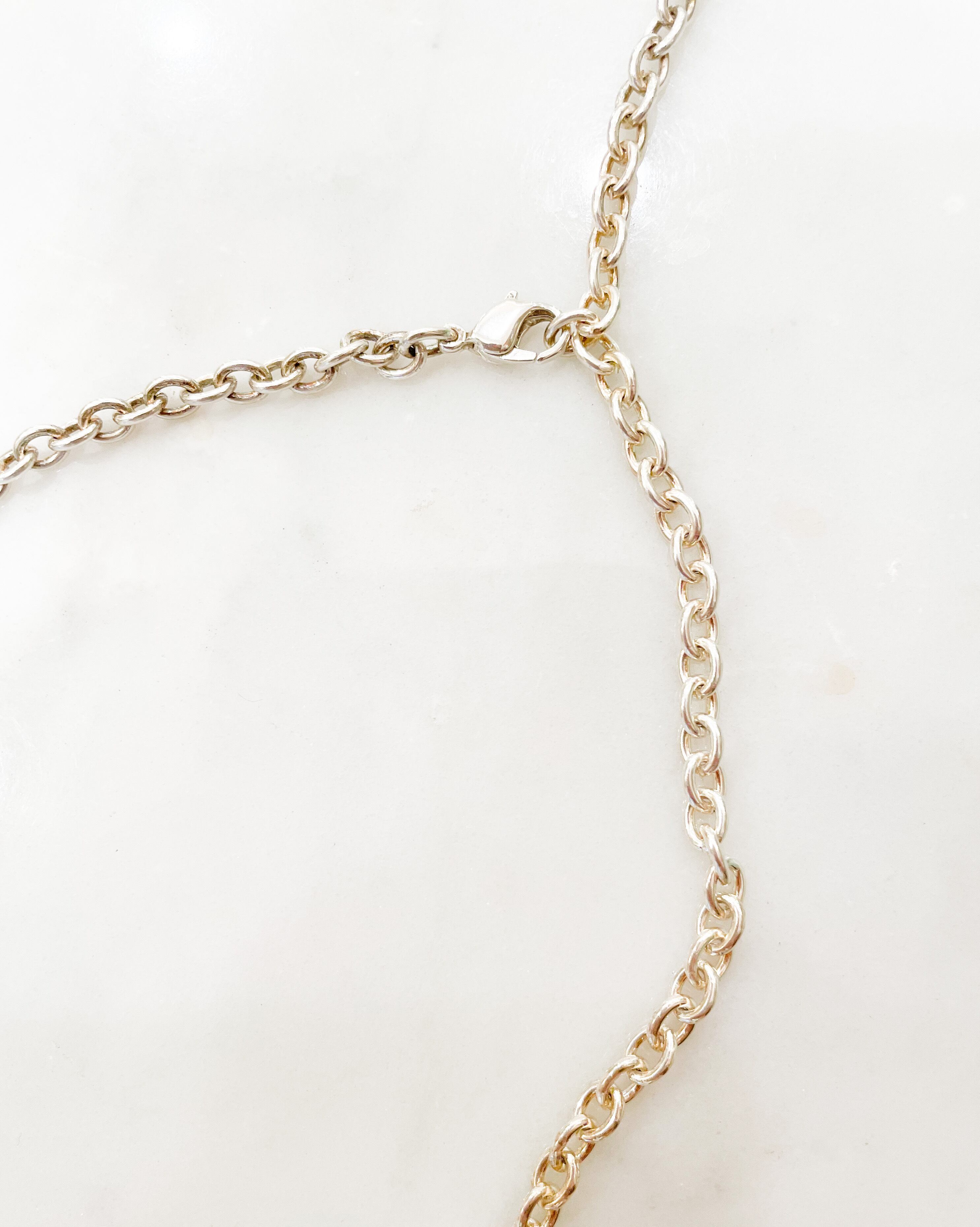 長さは43.5㎝なのですが、短めでお作りすることもできますし、チェーンの途中に留め具をかけることで短くお使いもいただけます。