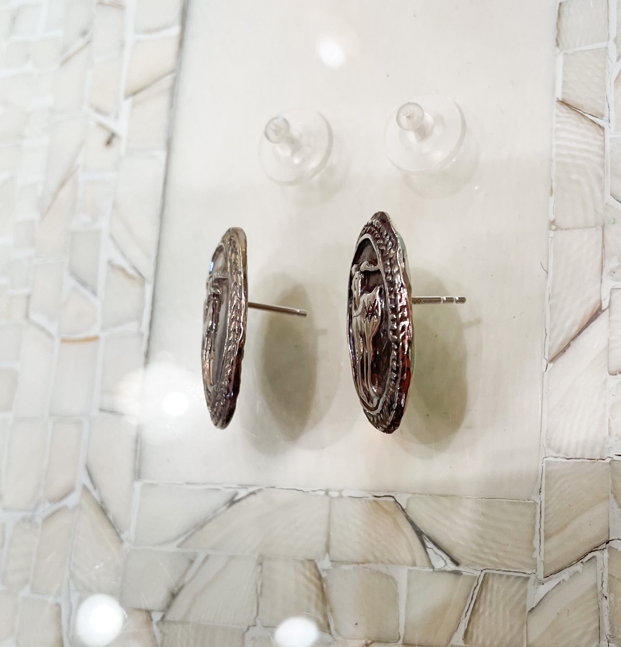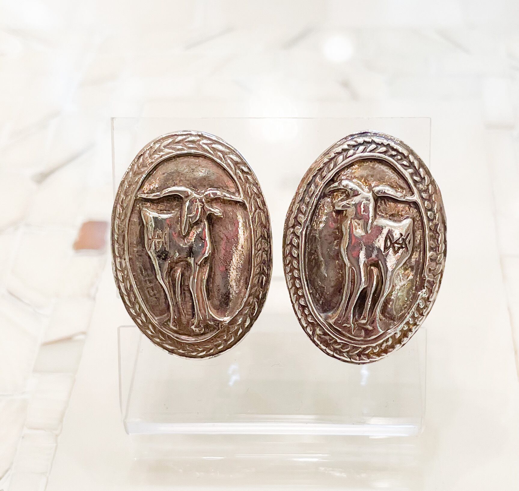 シルバーの岩場に立つ山羊の楕円形のプレートのイヤリング