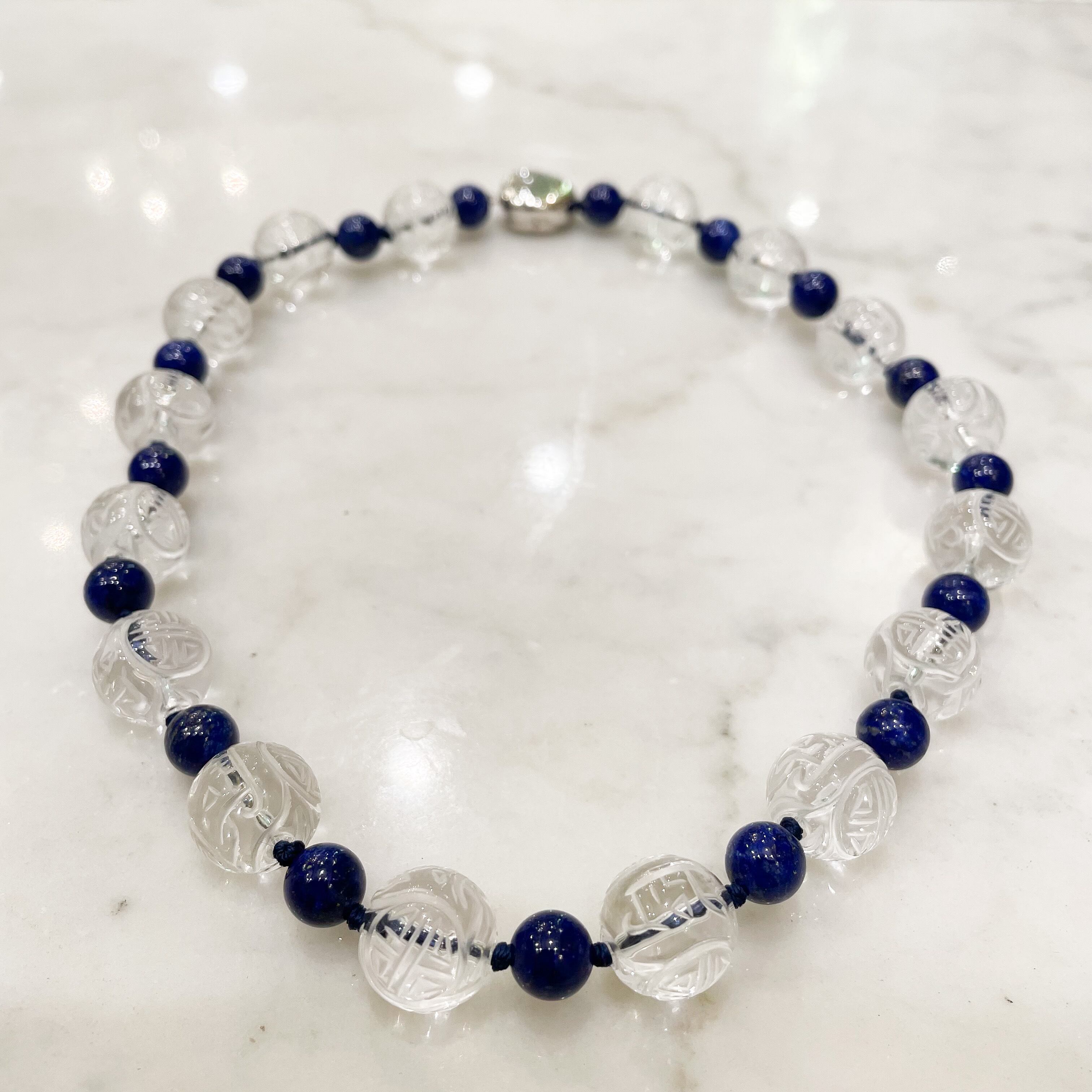 水晶とラピスラズリの間に全て結び目を入れて繋いでいるので、首に綺麗に沿ってくれます。
