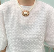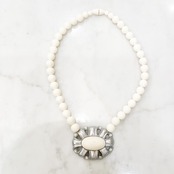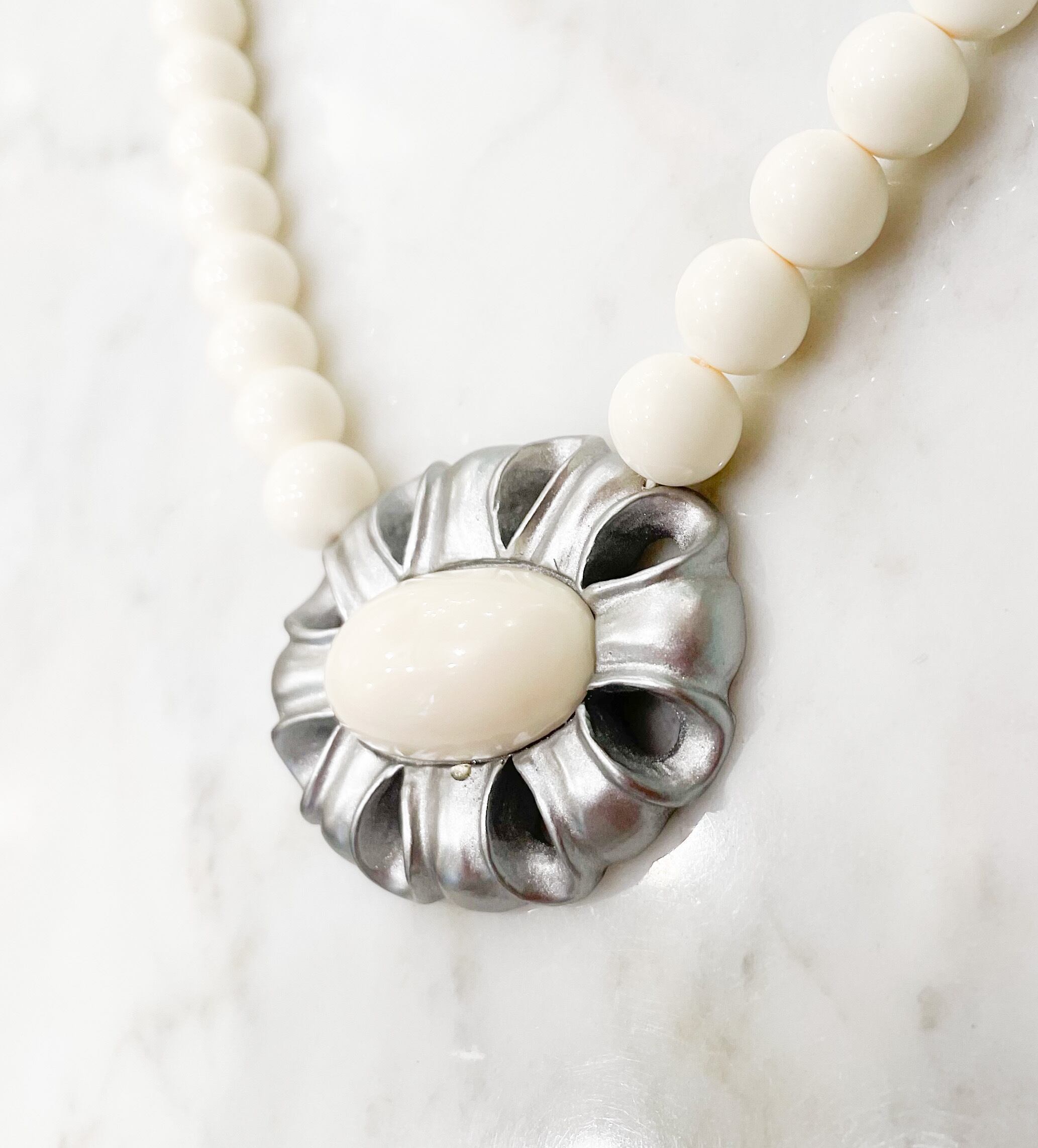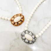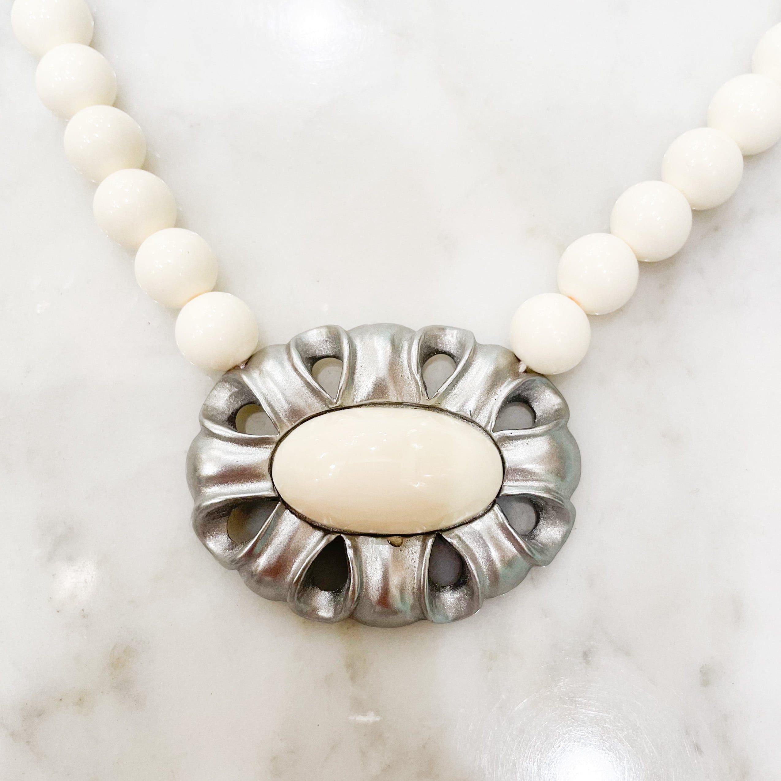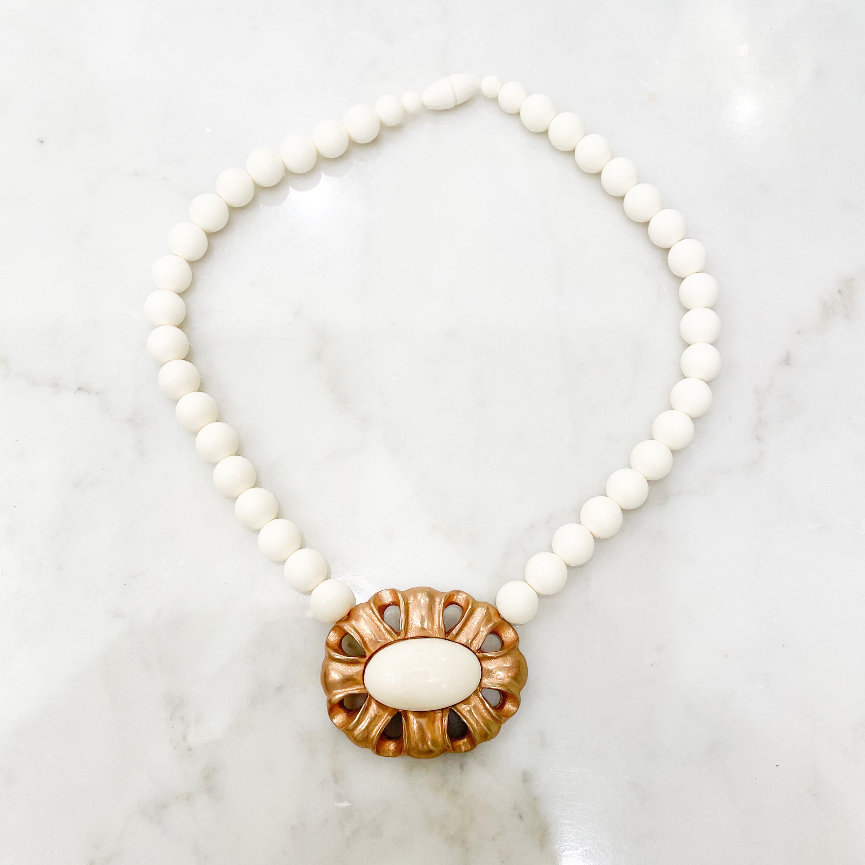 象牙色の樹脂に金彩・銀彩、楕円形の穴あきフレームのネックレス