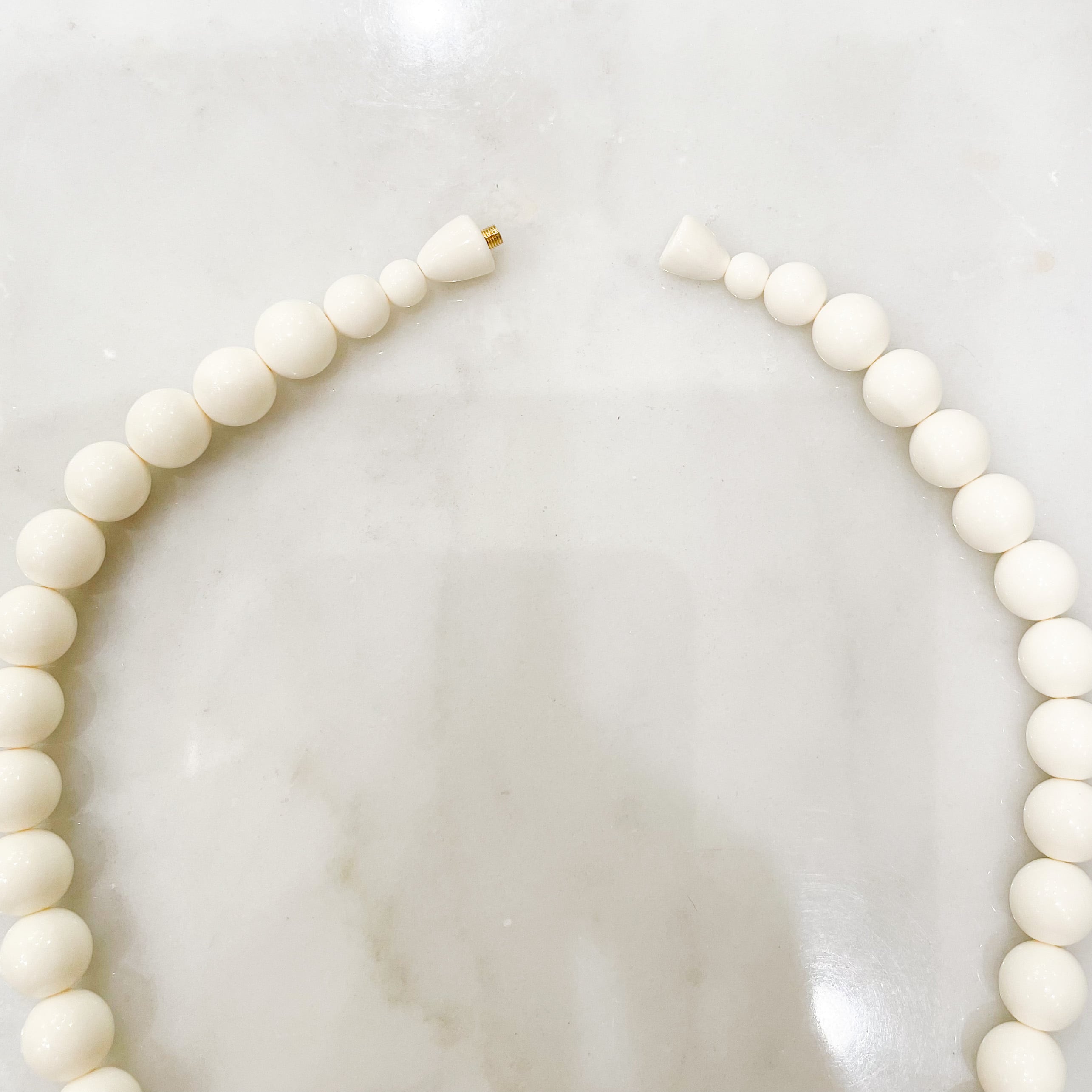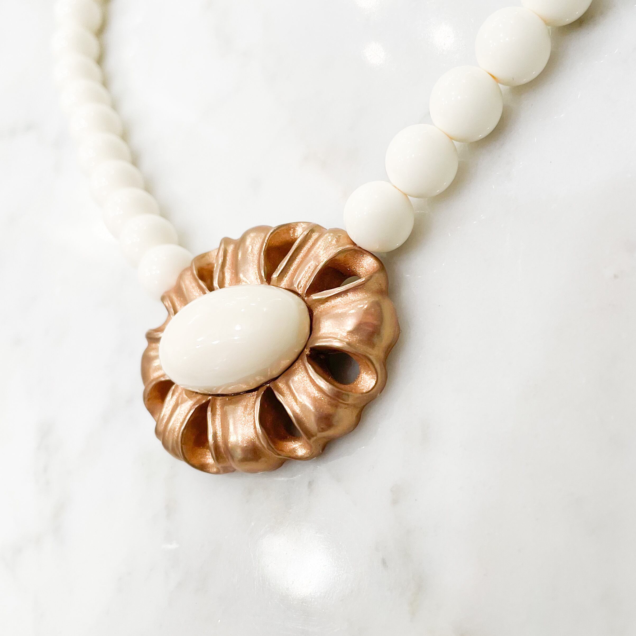 金属とは異なる、明るく優しげな金彩の金色が、象牙色に映える明るい色合いのネックレスです。