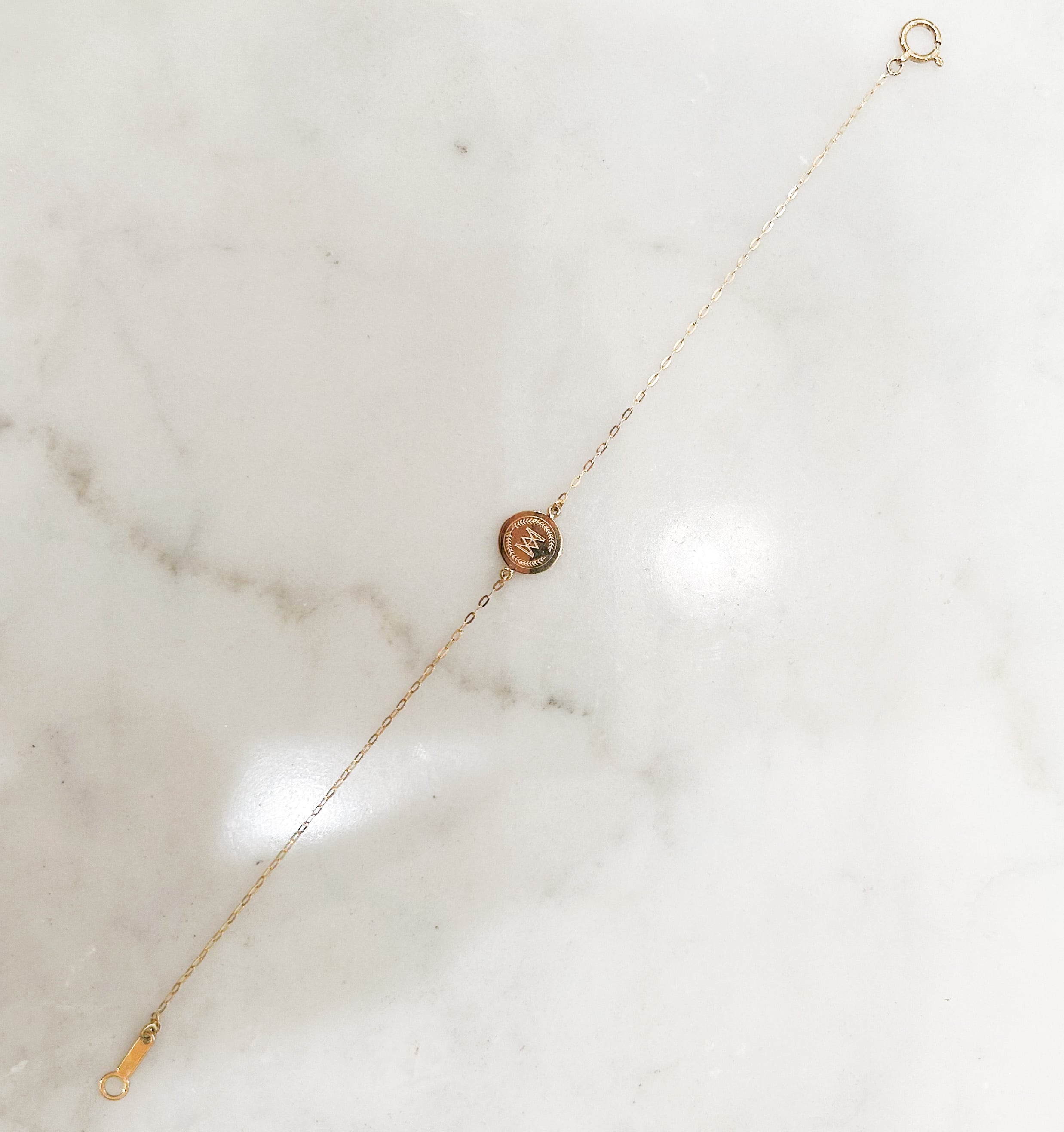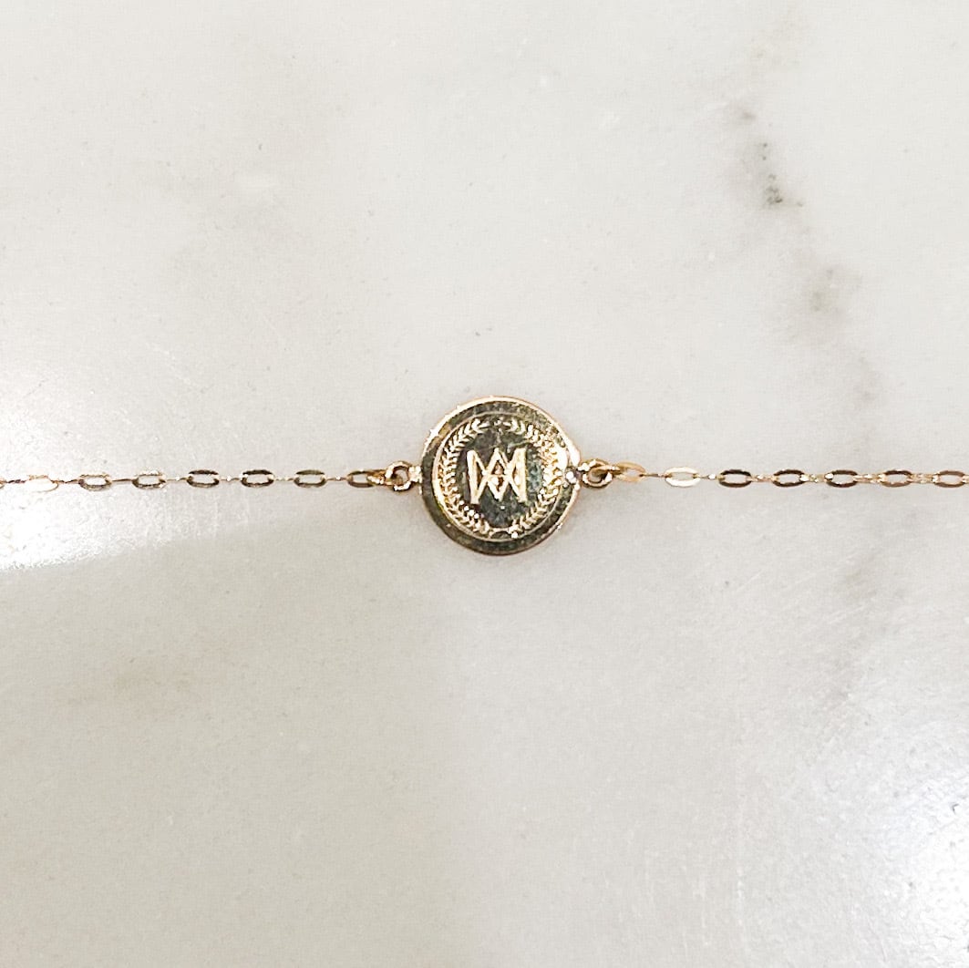 アキオモリのAとMのモノグラムと、月桂樹の模様が彫り込まれた、18金の丸いプレート(8mm)に細いチェーンを付けた、シンプルなブレスレットです。