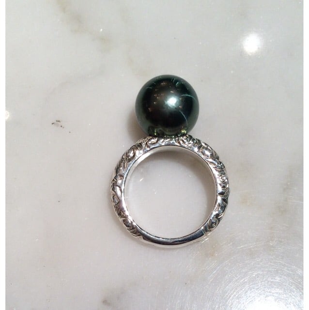 直径12mmを超える艶やかな南洋黒真珠を、深い花彫りをほどこした、細いシルバー台にセッティングした、とてもシンプルな作りの指輪です。