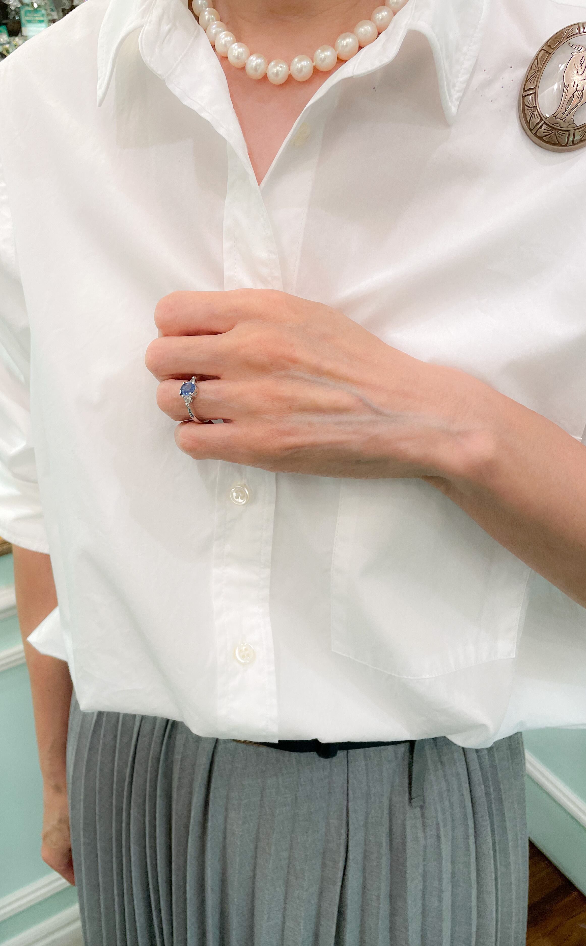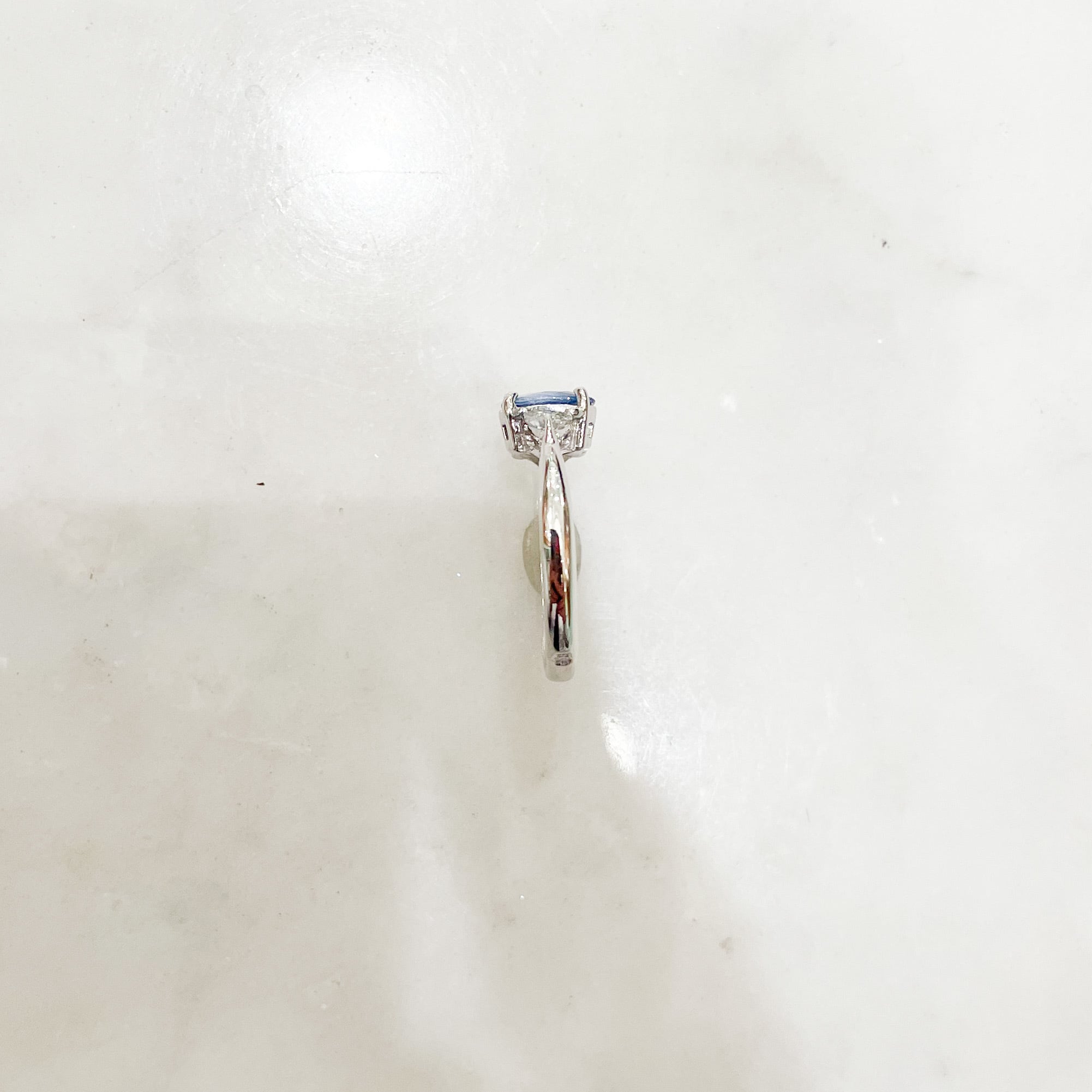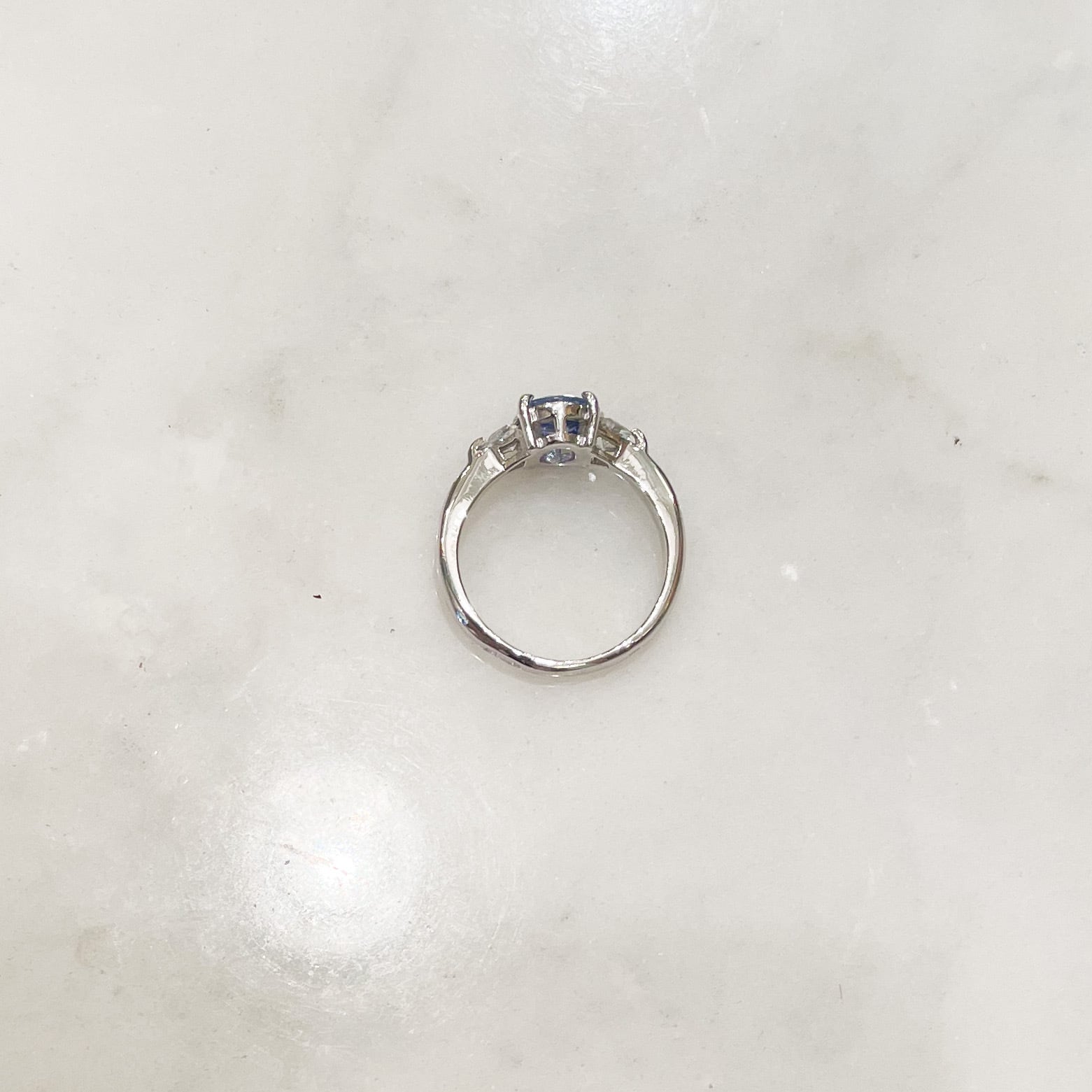 ペールトーンの淡いブルーのサファイアをセンターにして、シンプルなシルバー台にセッティングした指輪です。
