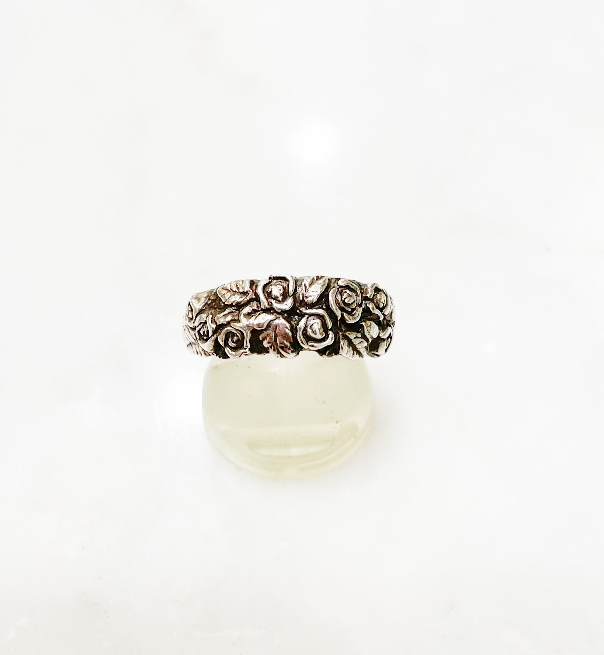 センターに向かって少しだけ幅が太くなっていくシルバーリングに彫り込まれているのは、薔薇の模様。