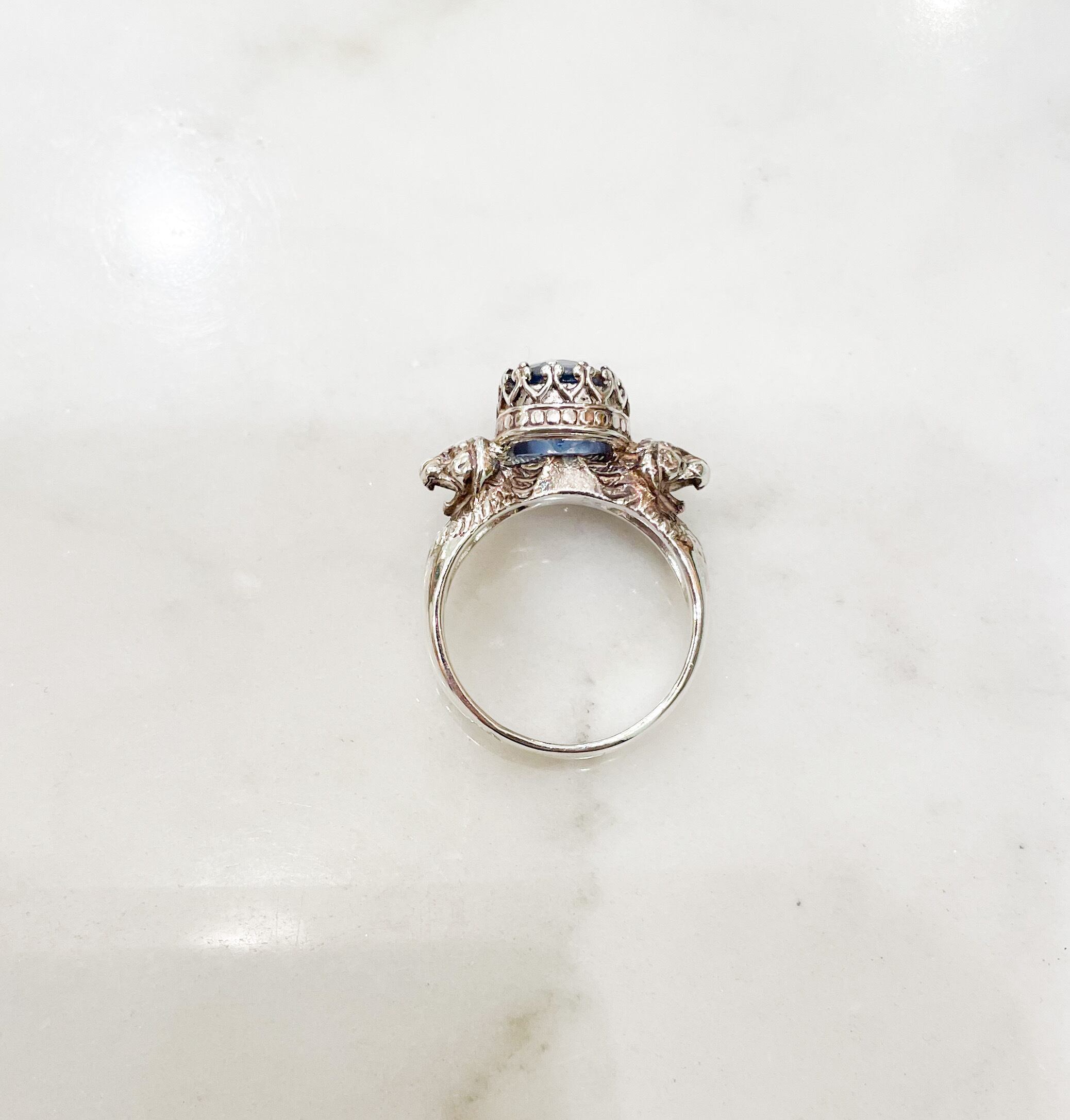 王冠留めされた長方形のサファイア(4.03ct)、二頭のライオンのシルバーリング
