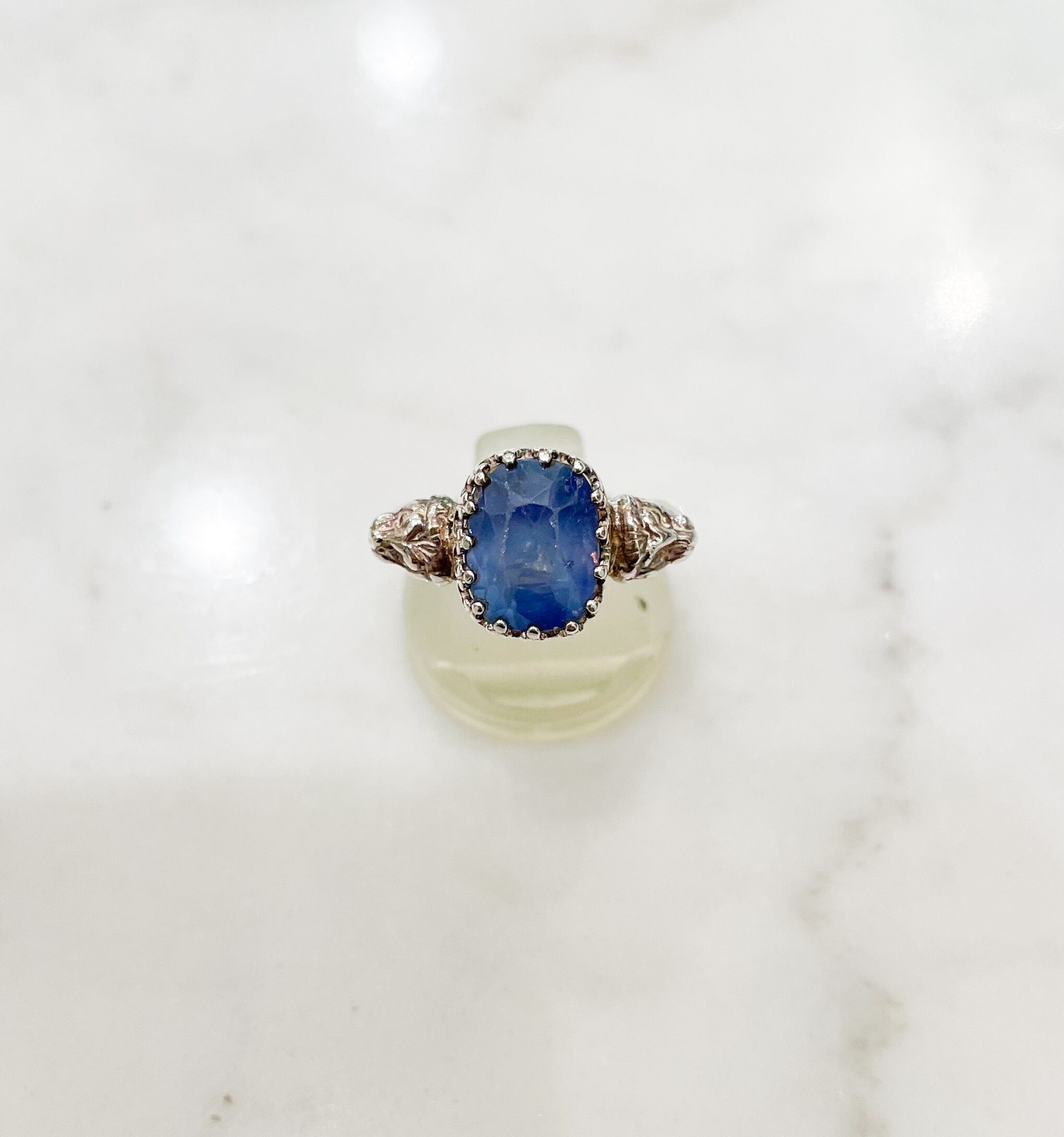 濃いロイヤルブルーのサファイアではなく、薄いラベンダーが混じったような青が綺麗なサファイアです。