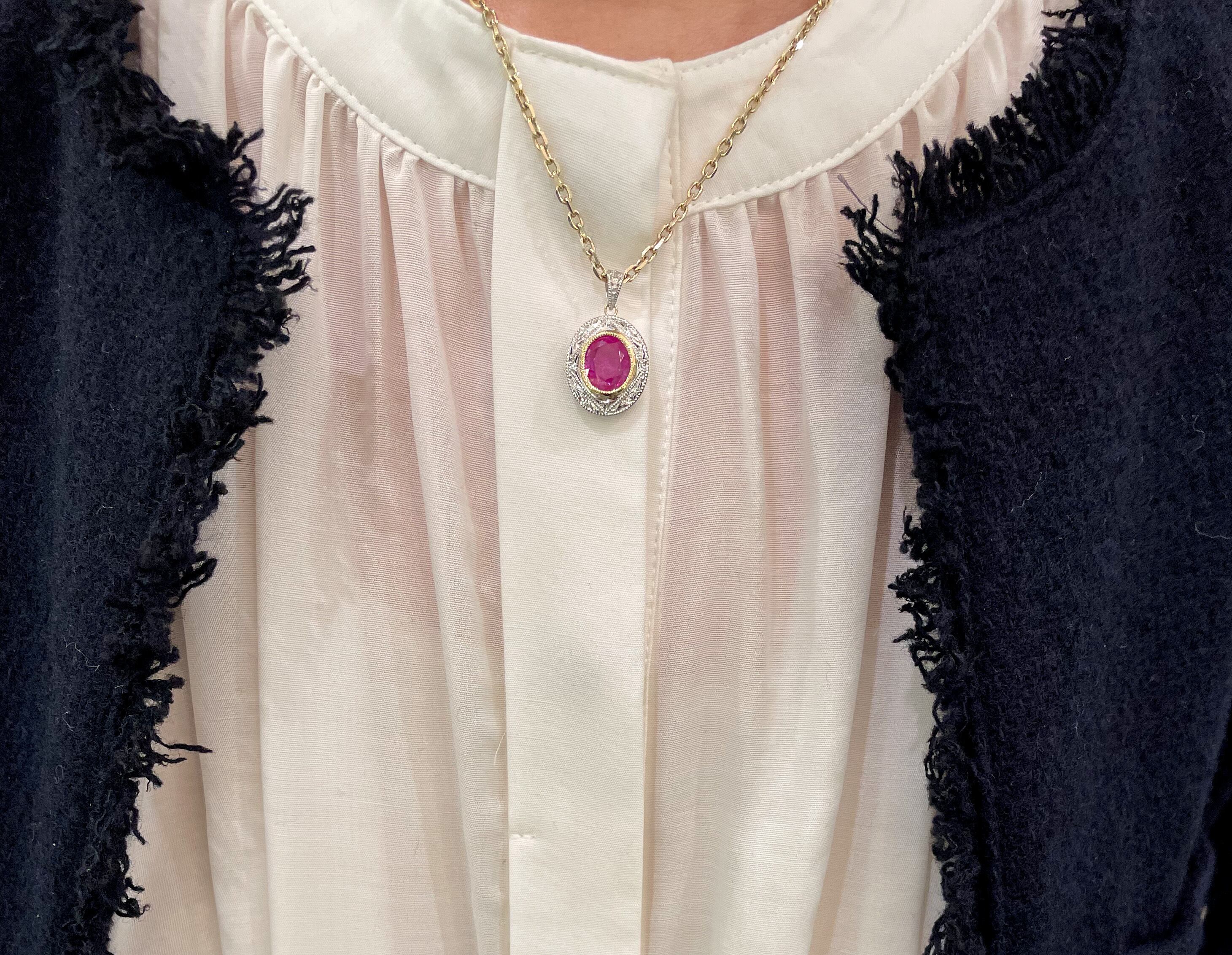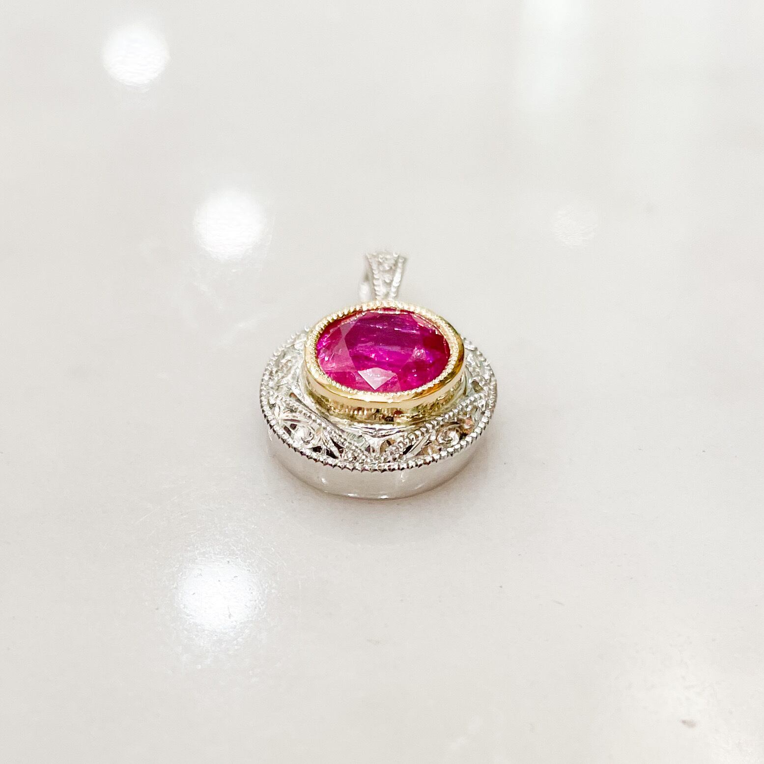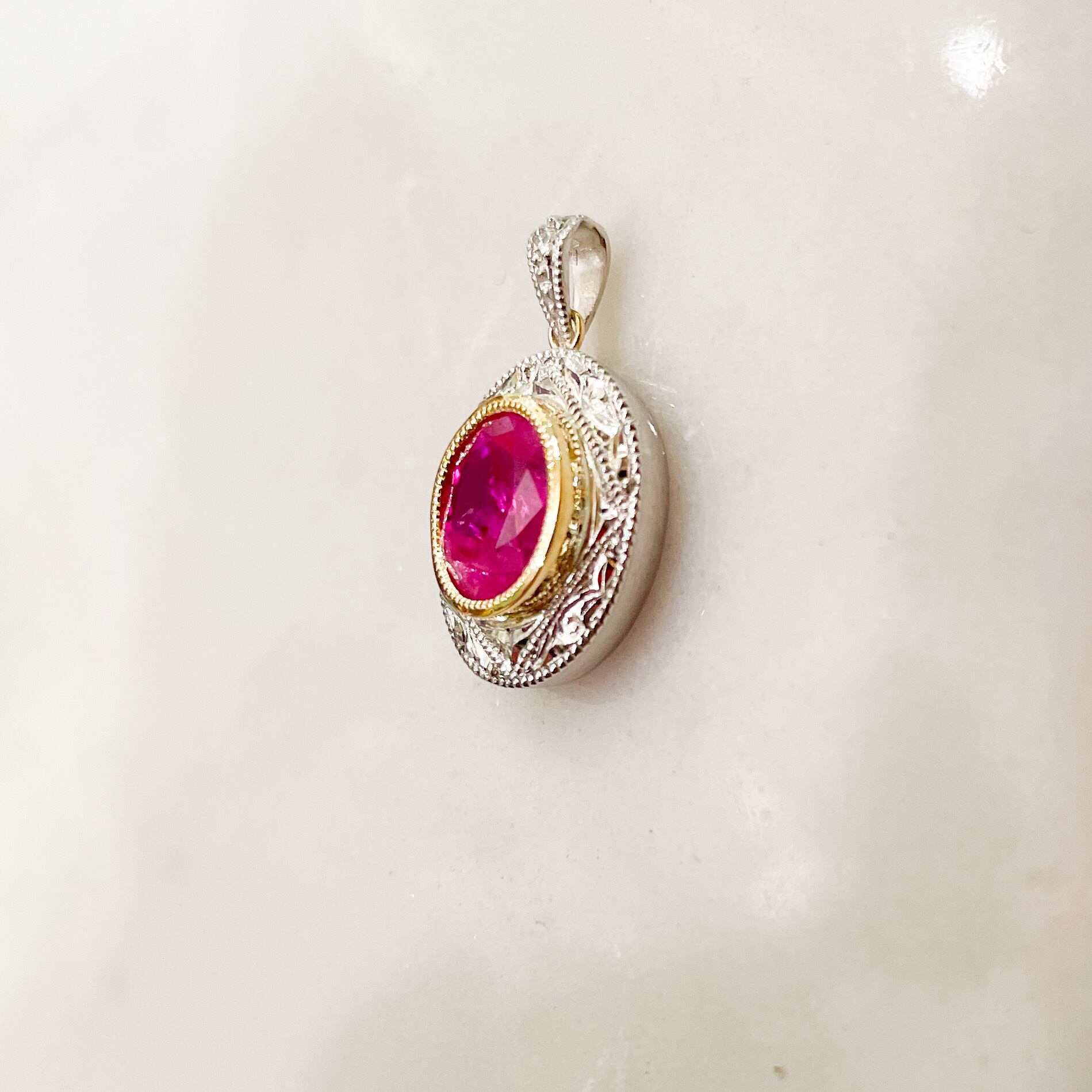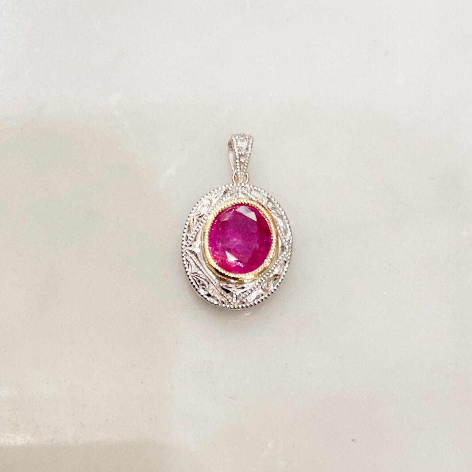 明るい色のルビーは少しだけクラックがありますが、周りのプラチナや18金の細工の美しさがプラスされ、全く気にならず、美しい色の輝きを楽しめるペンダントとなっています。
