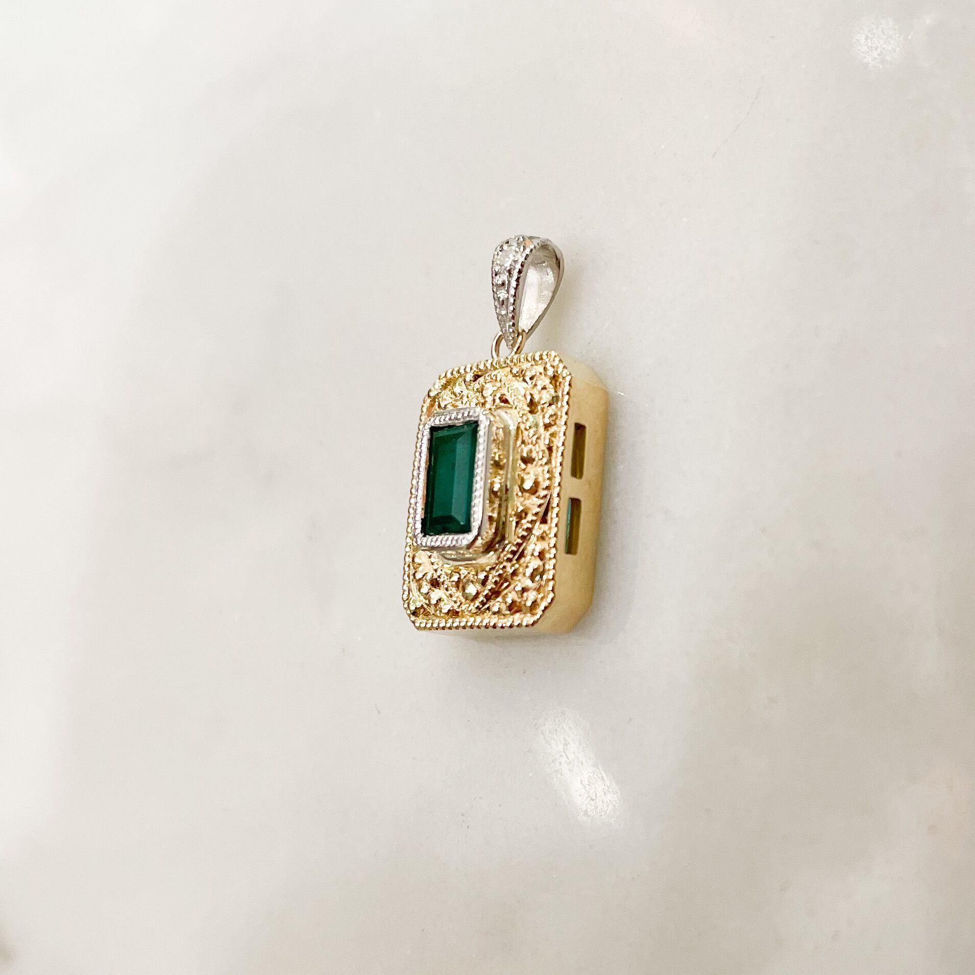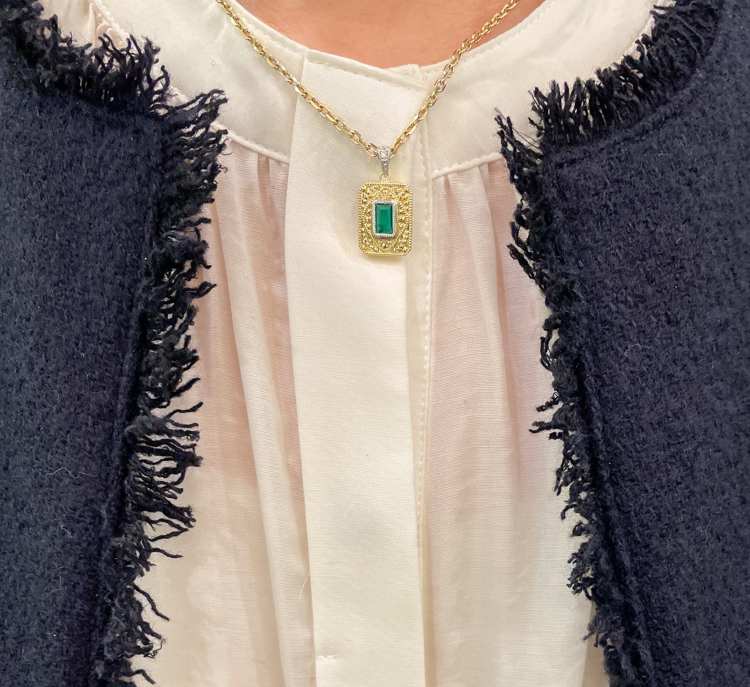 四角いエメラルド(0.31ct)に18金、プラチナ、小さなダイヤモンドのペンダント(チェーン別)