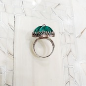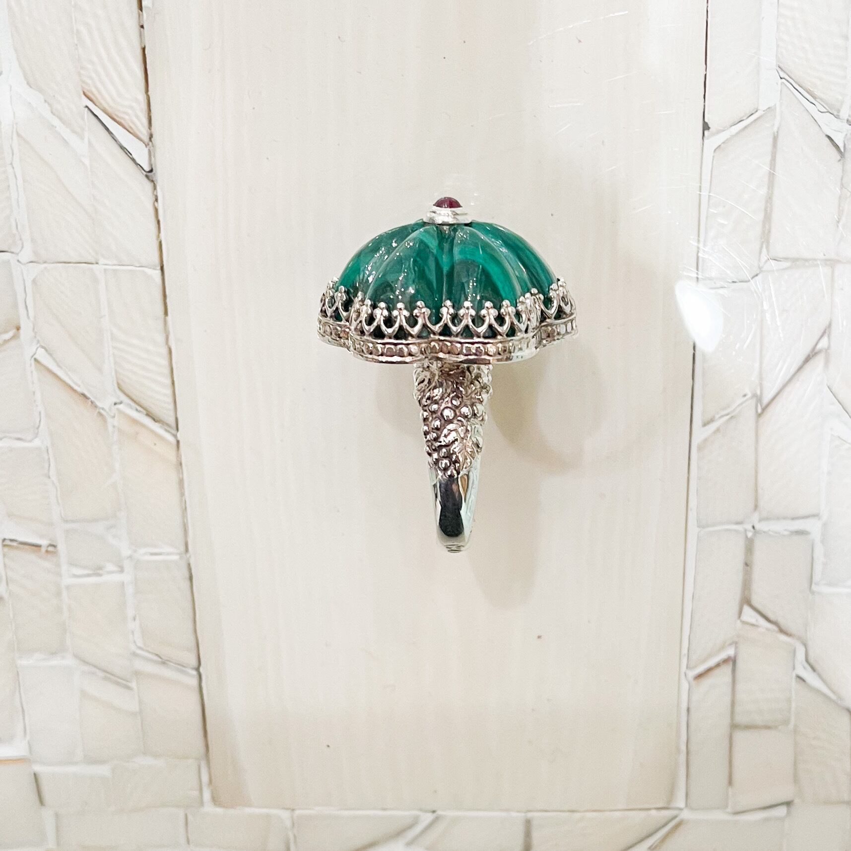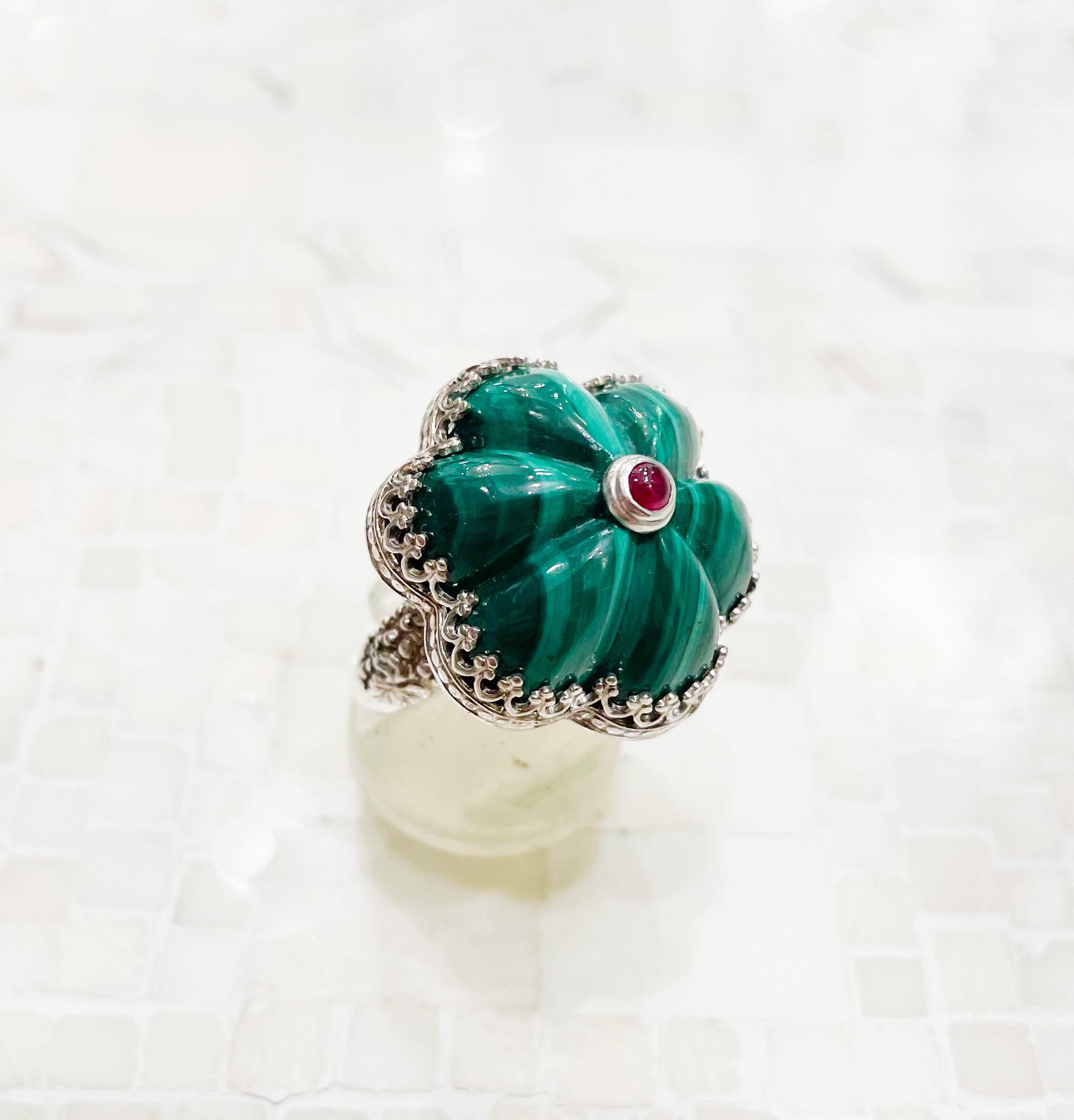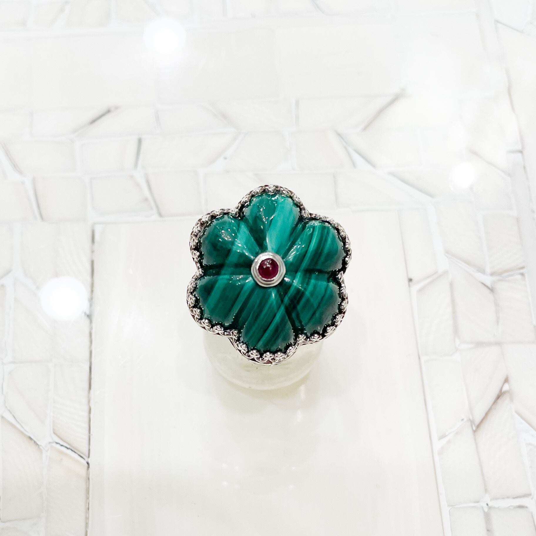 シルバーで王冠留めされた花の形のマラカイトにルビーのリング