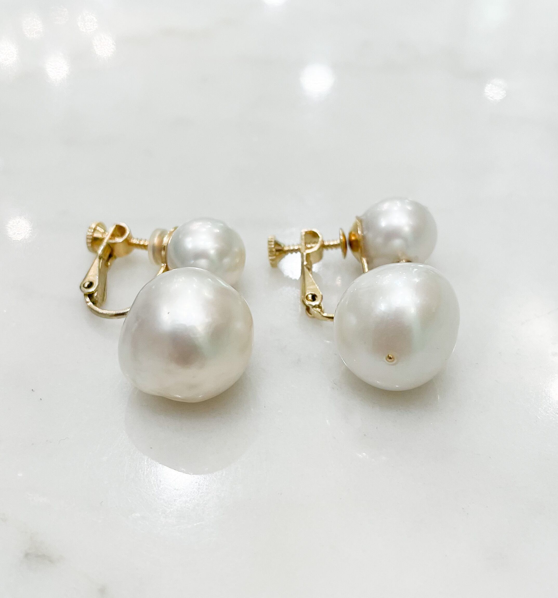 10mmと15mmの南洋真珠を使ってどうしてこんなにリーズナブルなのか・・・実は15mm程のバロックパールの片方だけが貫通玉なのです。