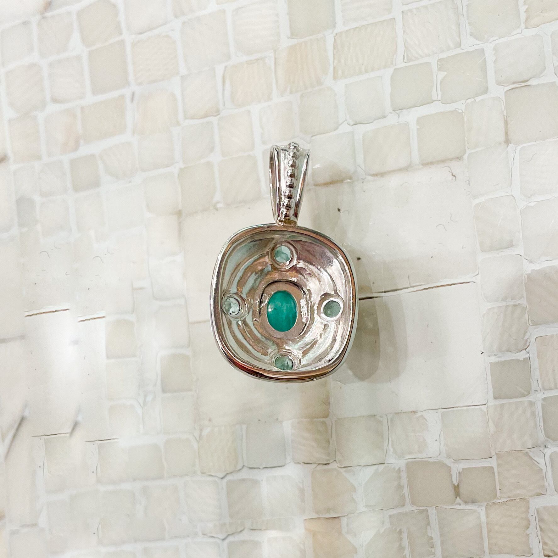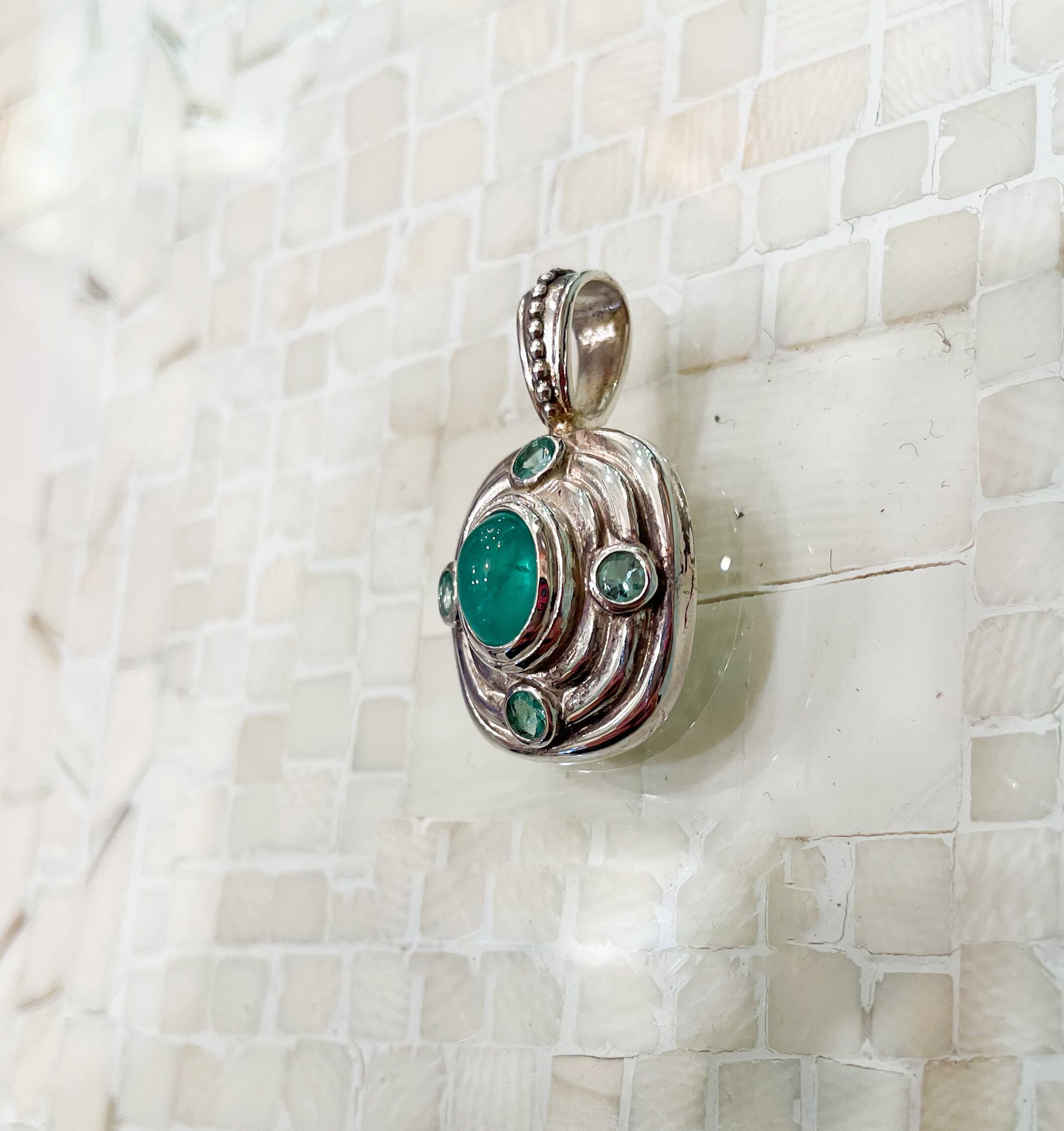 カボーションのエメラルドを4つの小さなエメラルドが取り巻くシルバーペンダント(1.39ct)チェーン別